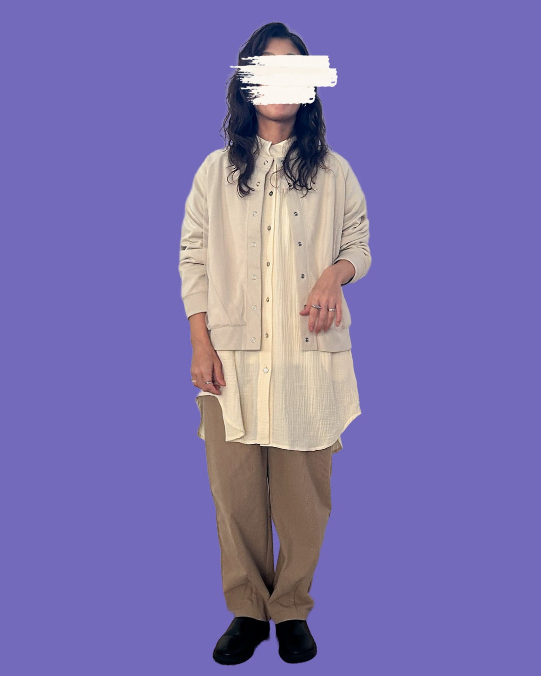 高密度で張りのある平織素材を使用したバンドカラーのチュニックシャツ。長めの丈で体型をさりげなくカバーしつつ、カーブした裾が軽やかな印象に。ボトムのポケットを使用しやすい様にカーブを深めに仕上げました。途中まで前立て仕様にし変化を持たせ、刻印釦やワッペンでポイントをプラス。前開きデザインなので、ボタンを閉じてはもちろん、羽織りとしても便利なアイテムです。 【Color】オフホワイト / ネイビー / ベージュ 【Fabric】綿100% -------------------------------------------------------------------------------- サイズ表: M 身巾58cm 着丈83/88cm L 身巾62cm 着丈85/90cm