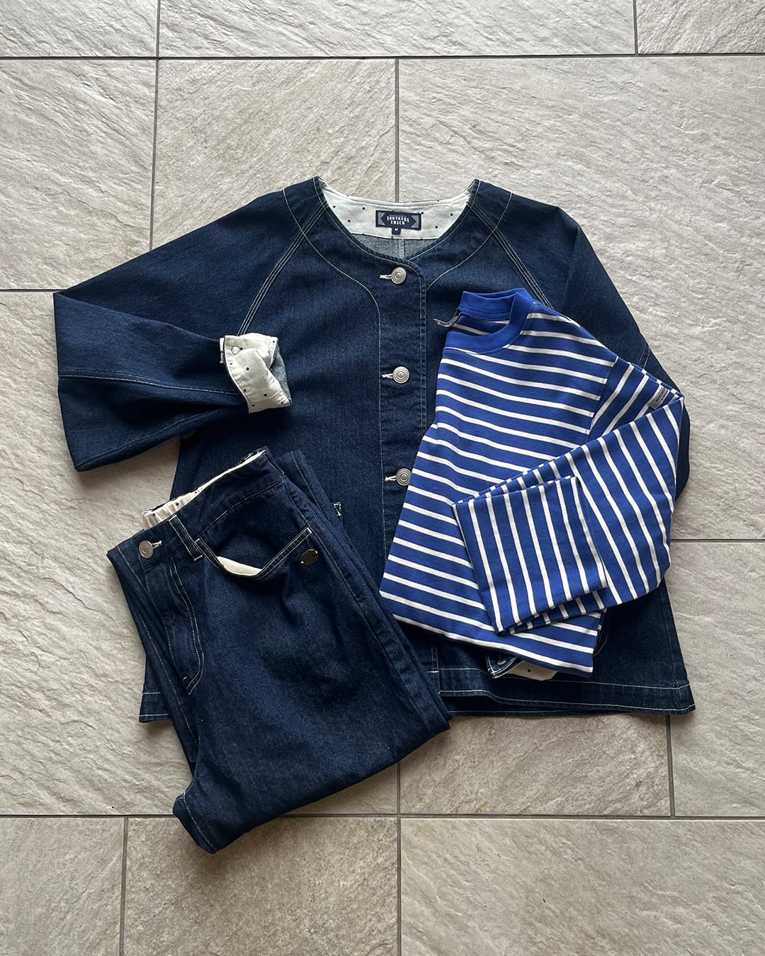 昨年も好評だったデニムジャケット。 きれいめにもカジュアルにも合わせやすく、さまざまなシーンで活躍する一枚です。ストレッチ性のあるデニム生地を使用し、カラーごとに異なる風合いを楽しめます。フロントのドットボタンには、フィンランドのバレンタイン文化にちなんで、「感謝のきもち」というロゴとチューリップの彫り柄をあしらい、胸ポケットにはおうち柄のピスネームを付けました。 インディゴグレー、インディゴブルー、インディゴネイビーの3色展開です。 (KABP6091 セットアップコクーンデニムパンツ)とセットアップで着用頂けます。 【Color】インディゴグレー / インディゴブルー / インディゴネイビー 【Fabric】綿73% ポリエステル25% ポリウレタン2% -------------------------------------------------------------------------------- サイズ表: M 身巾53cm 着丈55cm L 身巾56cm 着丈58cm モデル身長:167cm(Mサイズ着用)