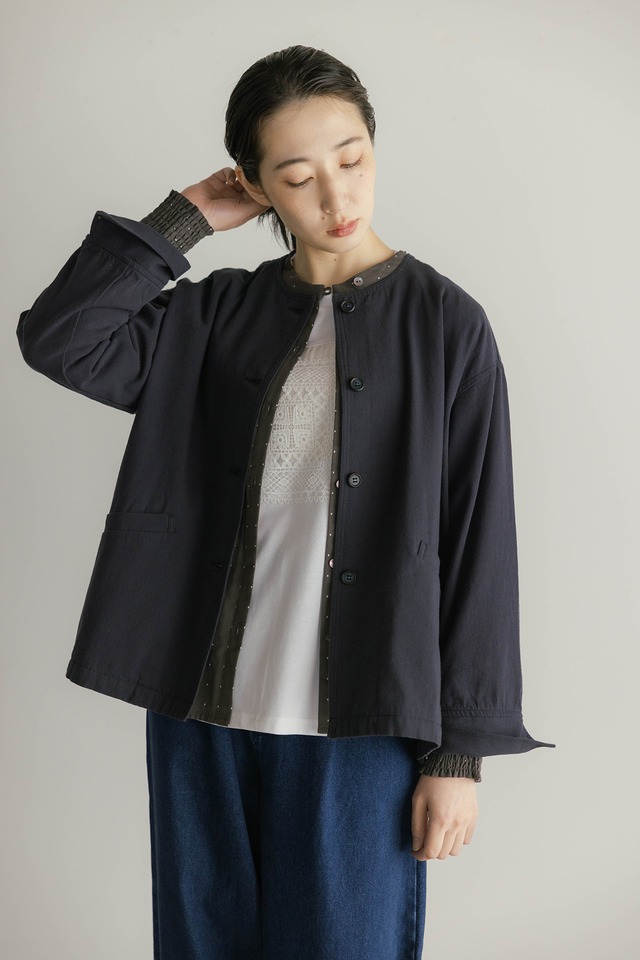 ラウンドしたバックヘムラインがカジュアルで軽い印象の春アウターです。ゆとりのあるシルエットなので春先は厚手のニットに、暖かくなるとブラウスなどの軽装に羽織るなど、レイヤードスタイルとの相性が良い1枚です。袖口のカフスは折り返せる仕様です。 コットンスラブ糸をツイル織りにした素材です。スラブ糸の凹凸による天然素材らしいナチュラルな表情が特徴です。綿わたのカスを少し残した#キナリ、明るめの#ベージュ、濃色の#ネイビーの三色展開です。 【Color】キナリ / ネイビー / ベージュ 【Fabric】綿100% -------------------------------------------------------------------------------- サイズ表: F 身巾62cm 着丈63/67cm モデル身長:167cm(Mサイズ着用)