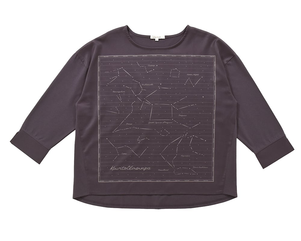 前身頃のプリントは秋に見える星座や星座盤をイメージした図案になっています。オリジナルの星座も入れて遊び心を加えました。袖口のカフスはスリット入りで、折り返して着用しやすくしました。