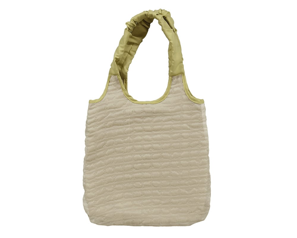表裏は配色になっており、シーンやコーディネートに応じてアレンジできます。表地は凹凸感のあるシャーリングシフォン生地を使用。裏地は型崩れしにくくしっかりした帆布生地で、デザイン性と機能性の両方兼ね備えています。