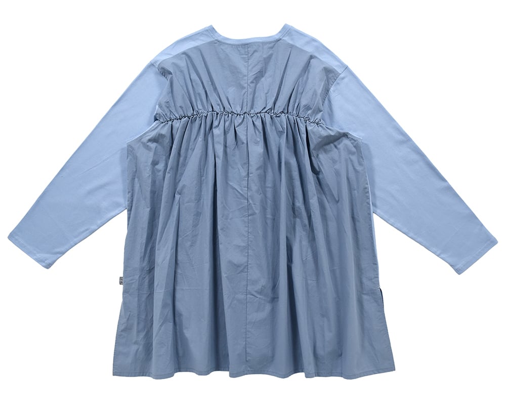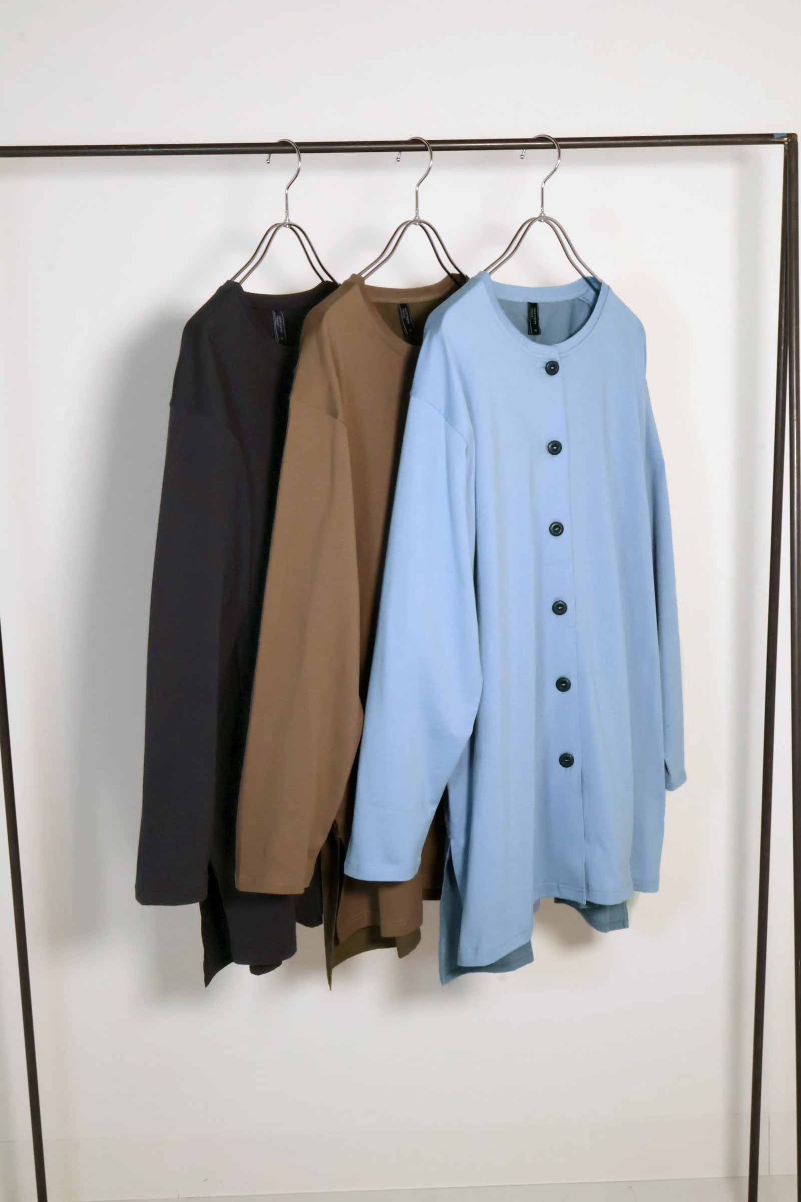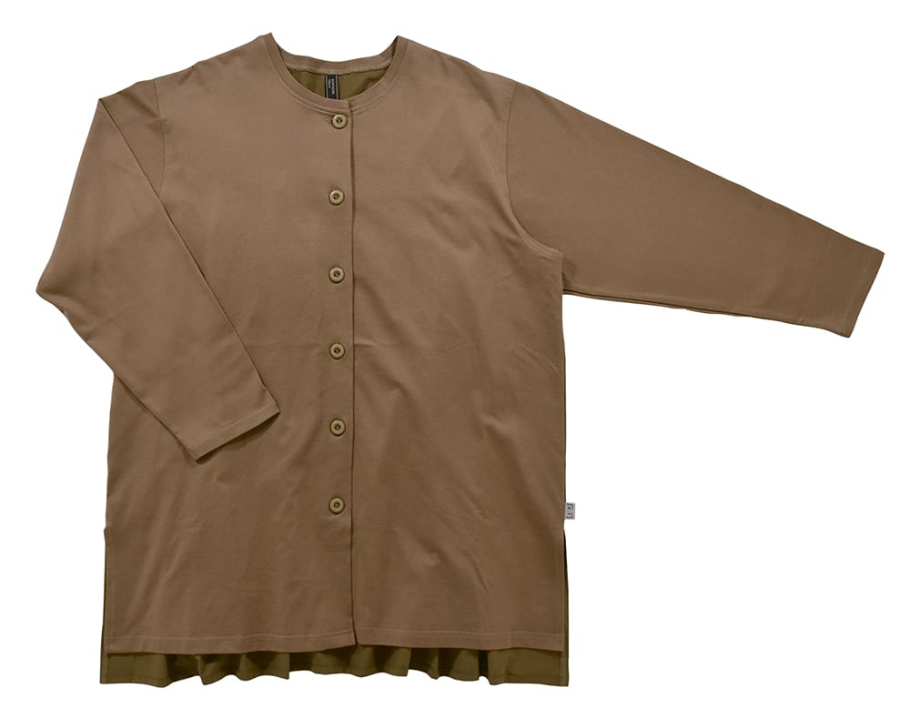 異素材を組み合わせたロング丈のカーディガン。後ろ身頃に布帛を使用しシャーリングをたっぷり入れた、バックスタイルもお楽しみいただけるデザインになっています。深めのスリットが入っているので動きやすく、チュニックとしてや羽織りとして便利なアイテムです。