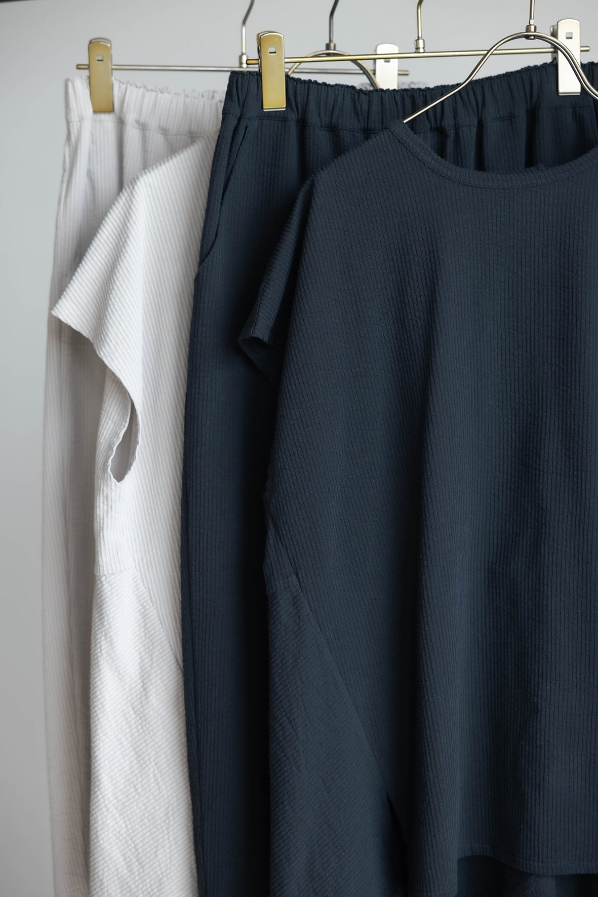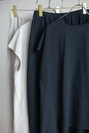 コットンとポリエステルを合わせたストライプジャガードのジャージ素材を使用しています。サラリとした肌触りで清涼感があり、ストレッチ性のある着心地の良さが特徴です。