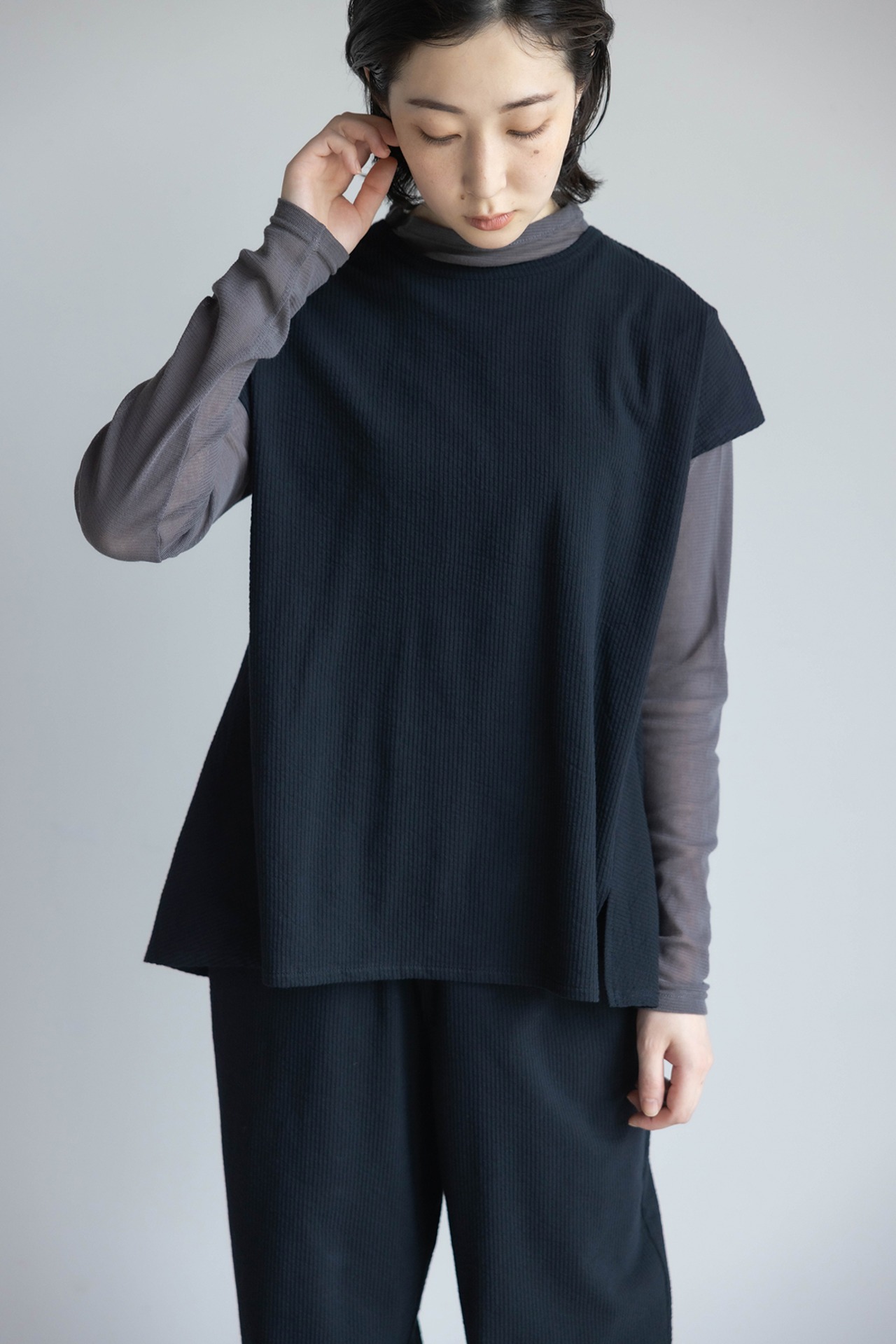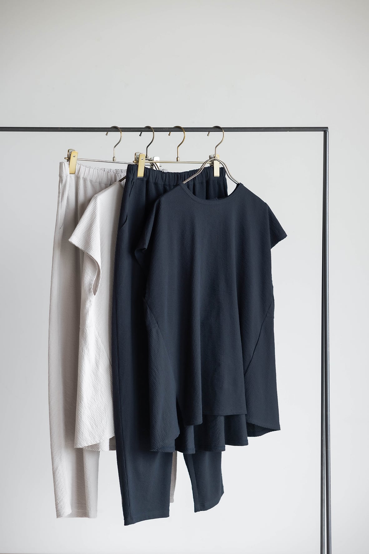 コットンとポリエステルを合わせたストライプジャガードのジャージ素材を使用しています。サラリとした肌触りで清涼感があり、ストレッチ性のある着心地の良さが特徴です。