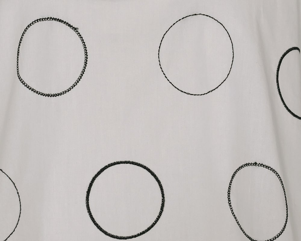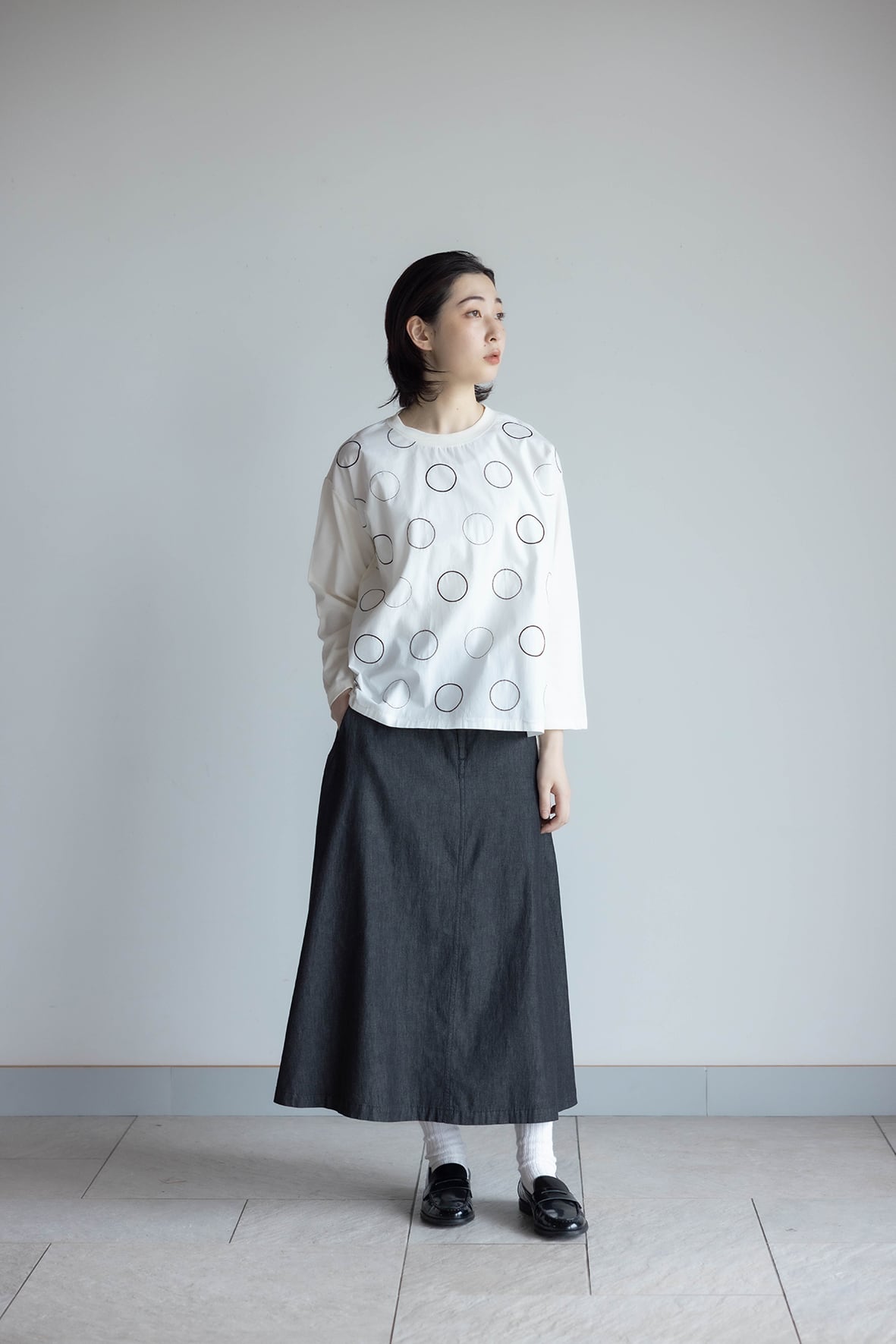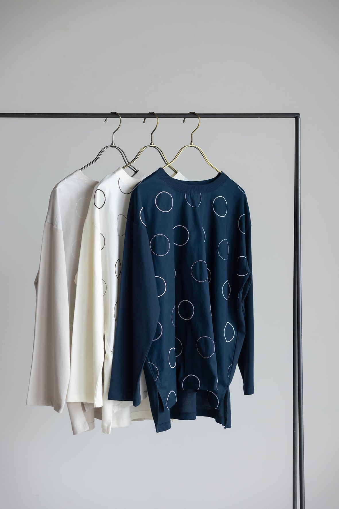 布帛生地にサークル柄刺繍をあしらったTシャツです。サークル刺繍は手法の違う刺繍を組み合わせることでニュアンスを出しています。程よくゆとりのあるシルエットで、手首が見える程度の9分袖丈です。