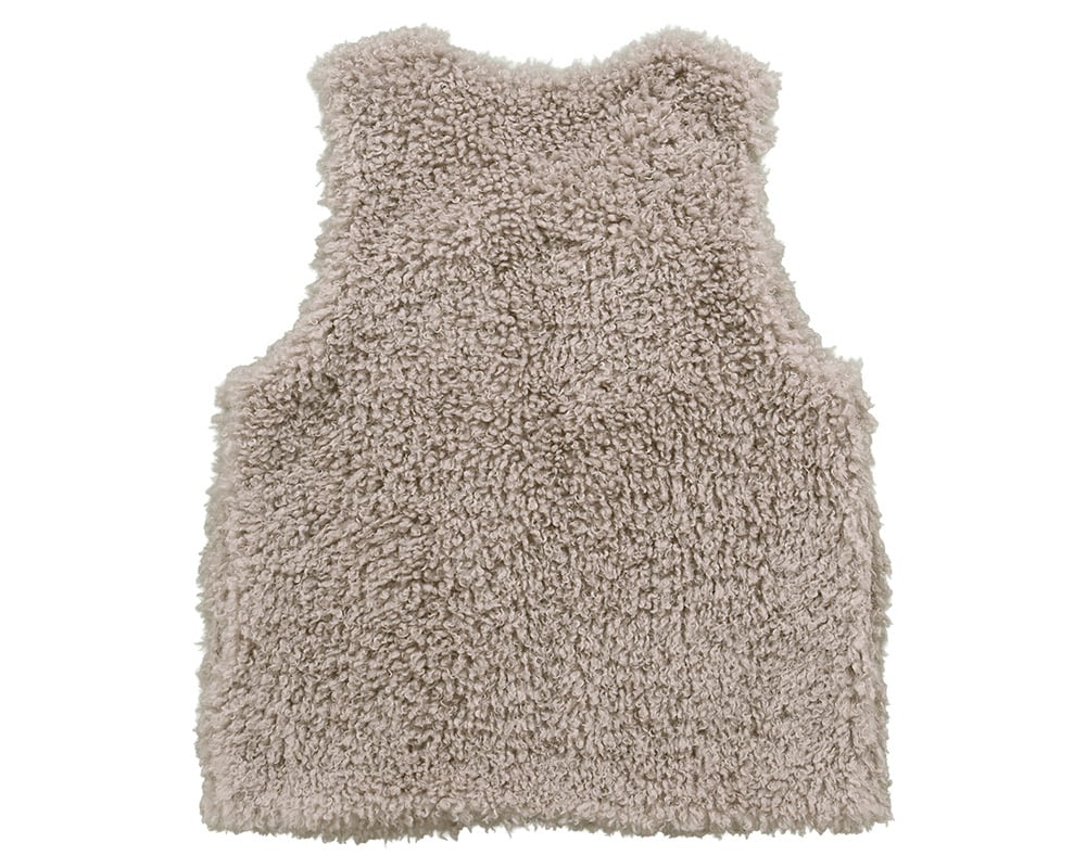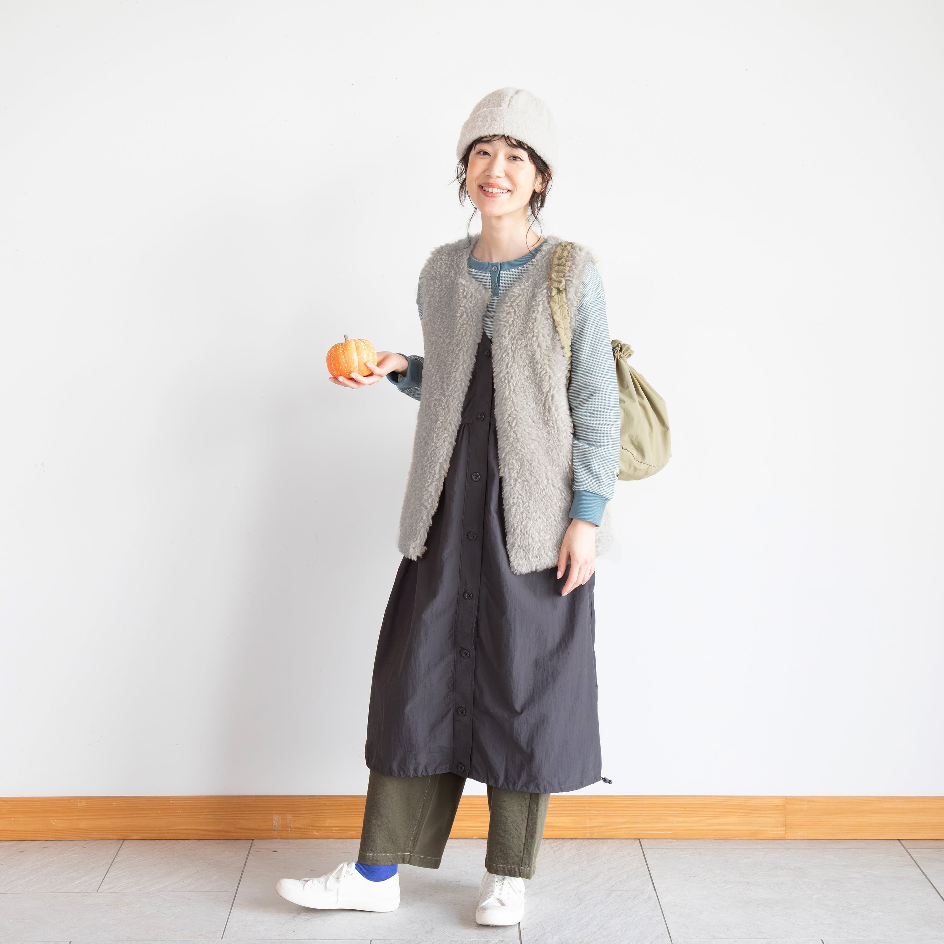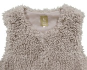 着丈を短くして、軽くしました。生地はトイプードルを連想させるようなプードルボア生地です。開閉部分はホックを使用。シンプルなオリジナルネームを付けました。