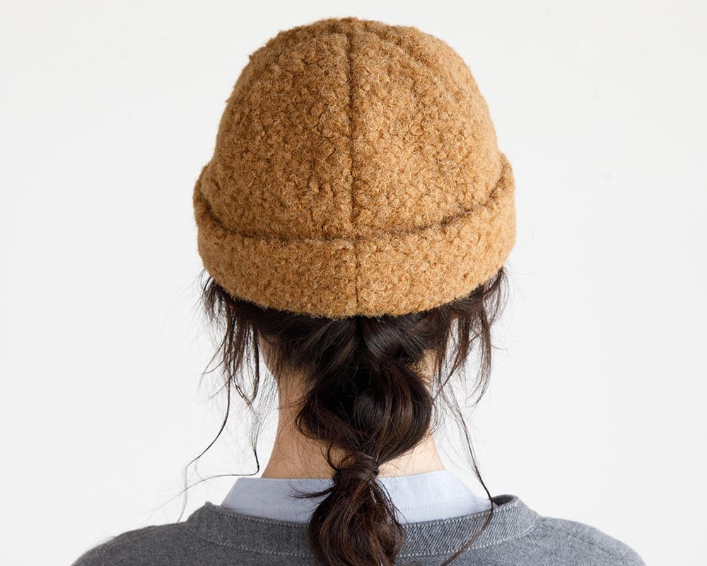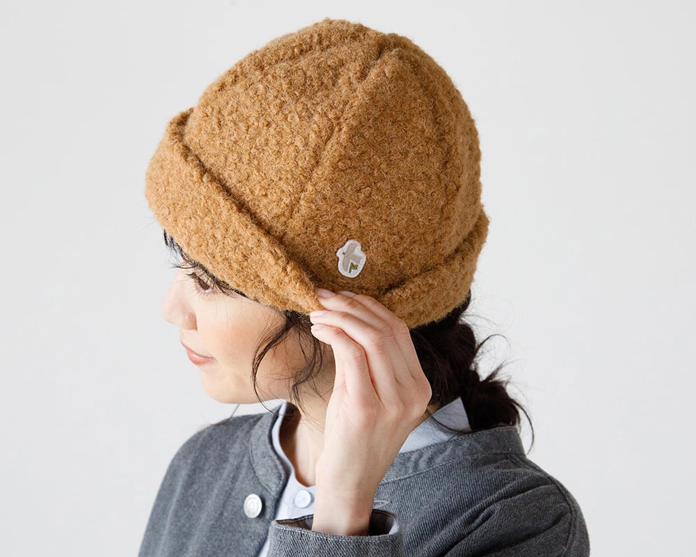 寒い時はつば部分を伸ばして着用いただくことも可能です。大きめカールのボア生地を使用。