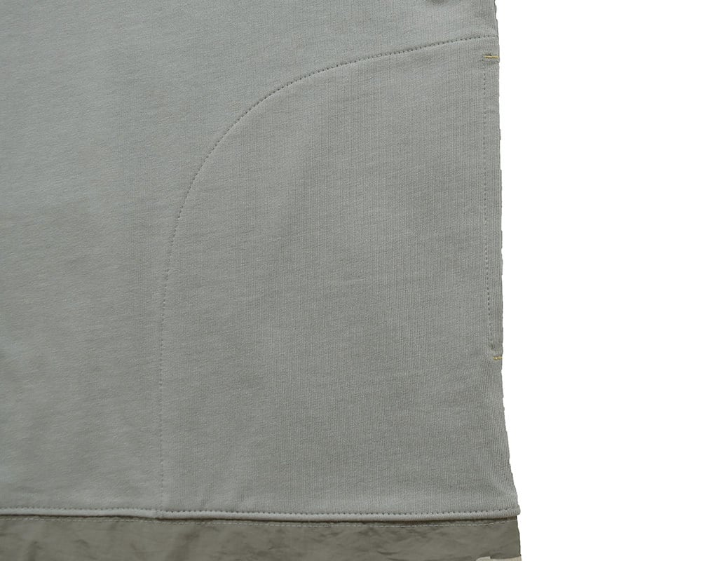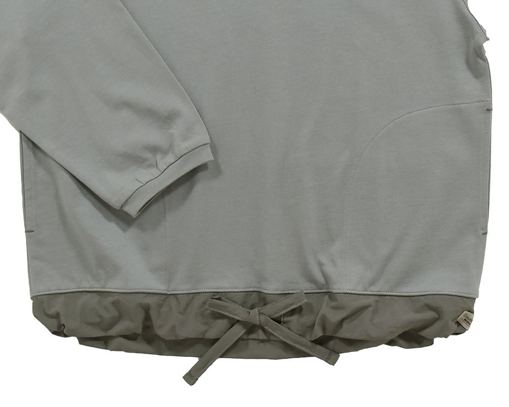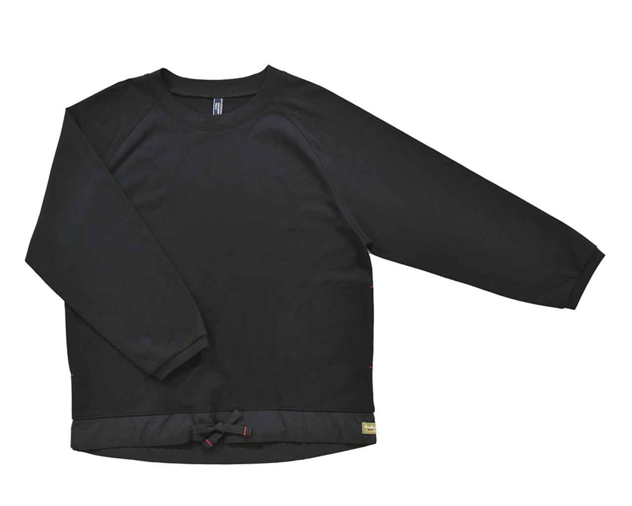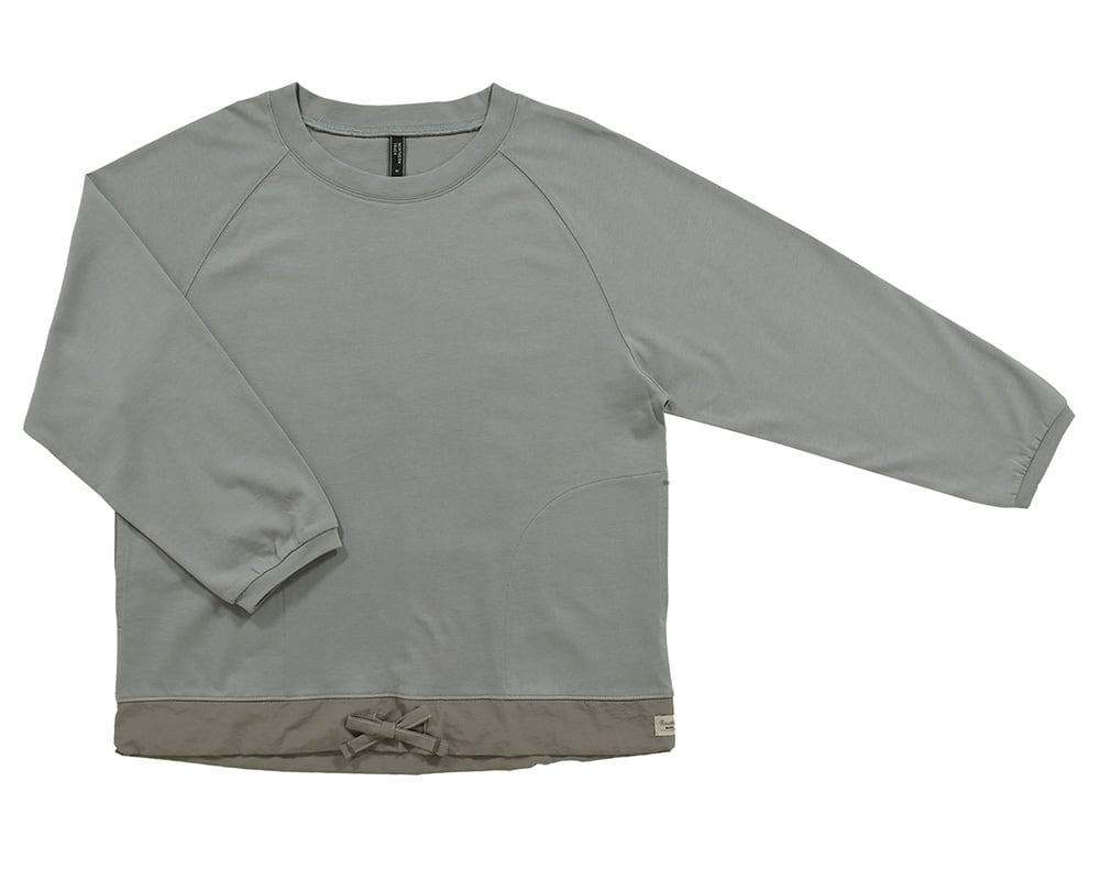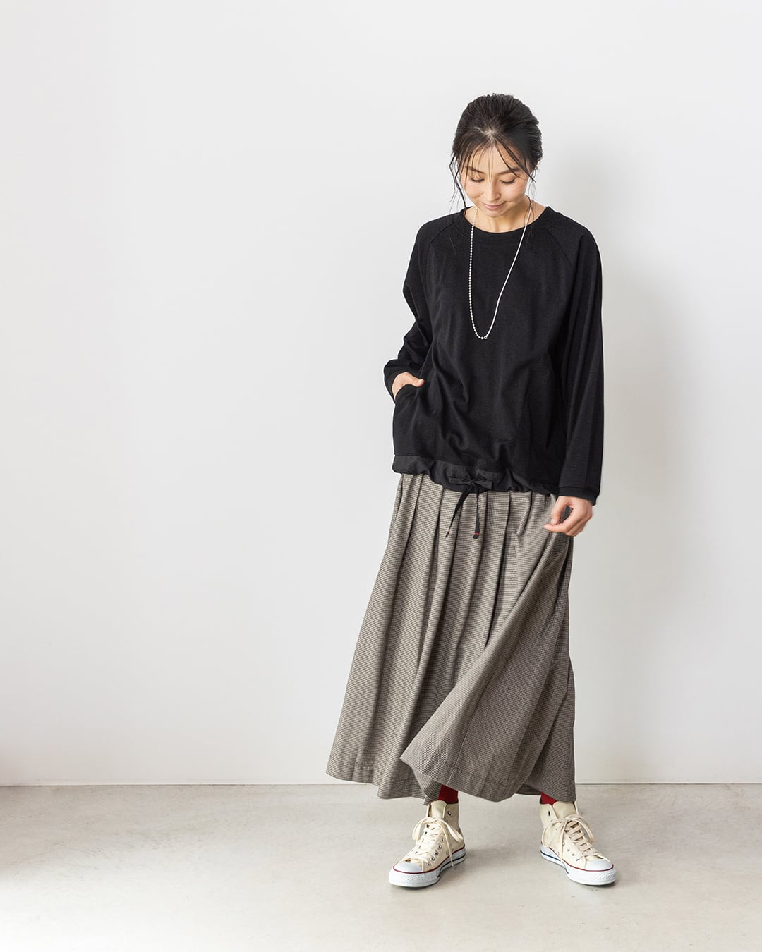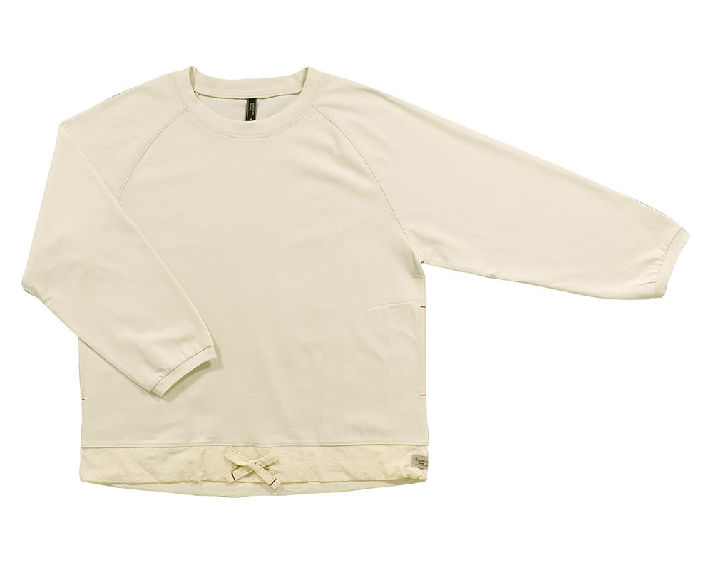 身頃はカットソー生地、裾はハリ感のある布帛生地を使用し、異素材の組み合わせがこなれた印象に。ラグランスリーブで肩まわりは動きやすく、袖口と裾のギャザーで程よいボリューム感をプラス。