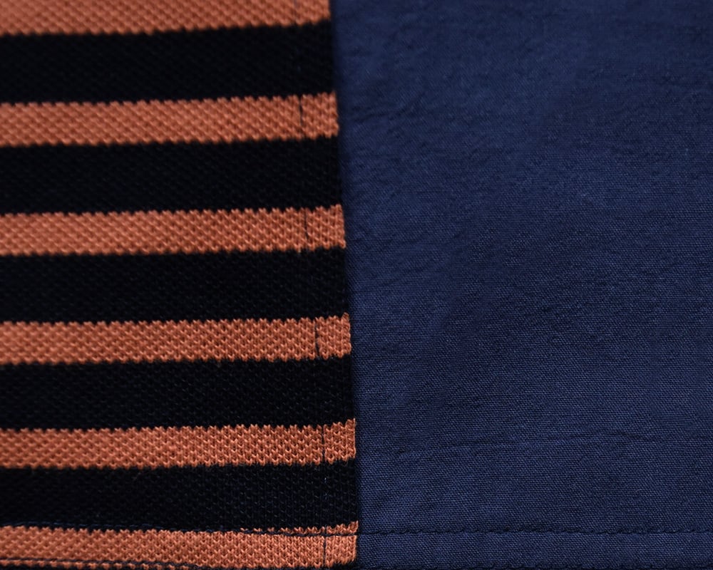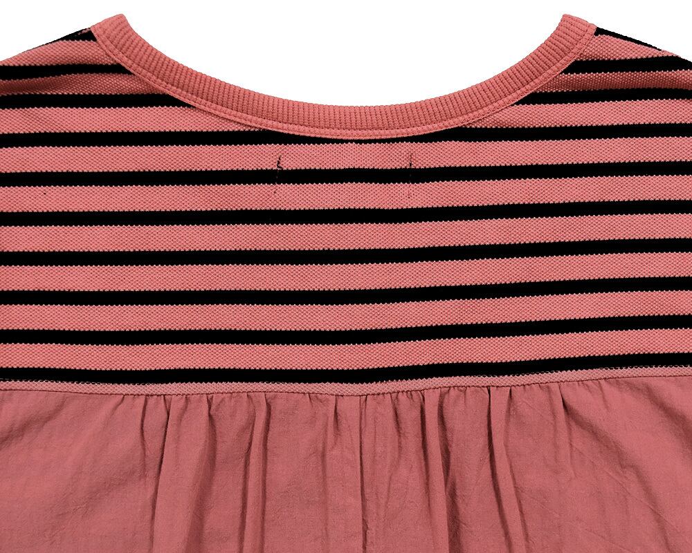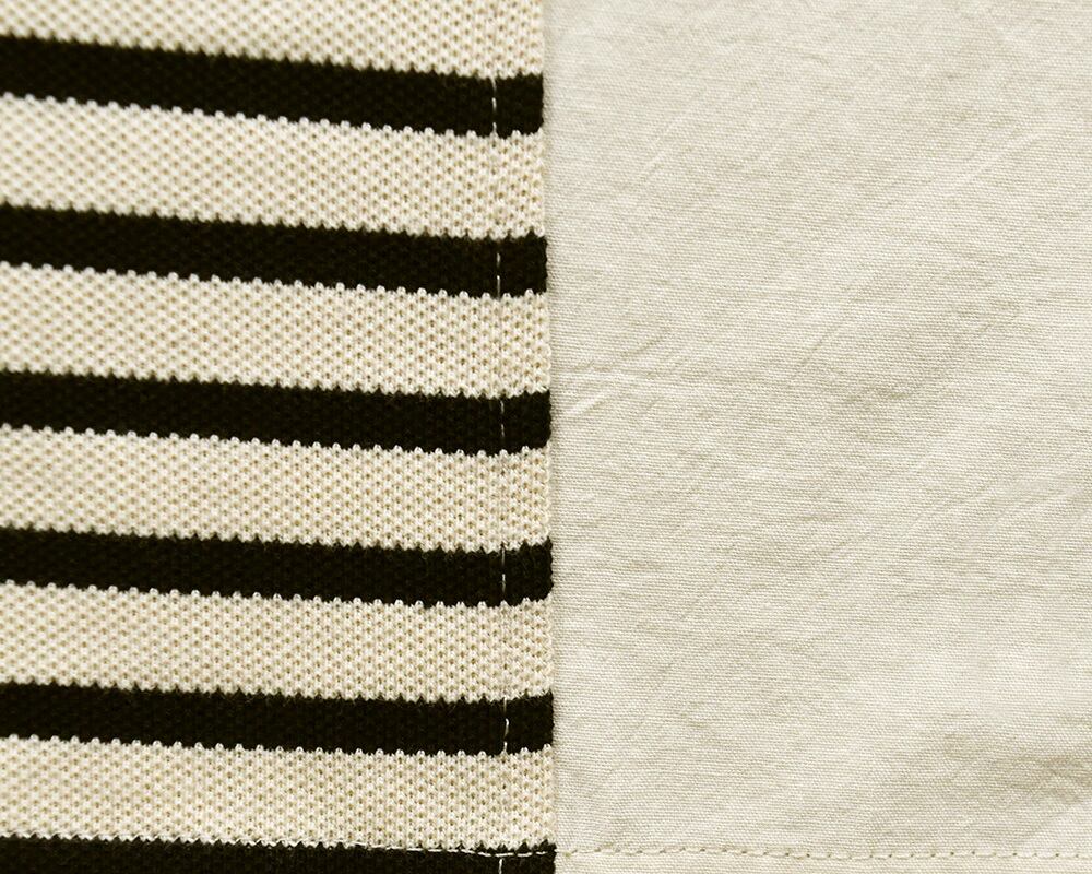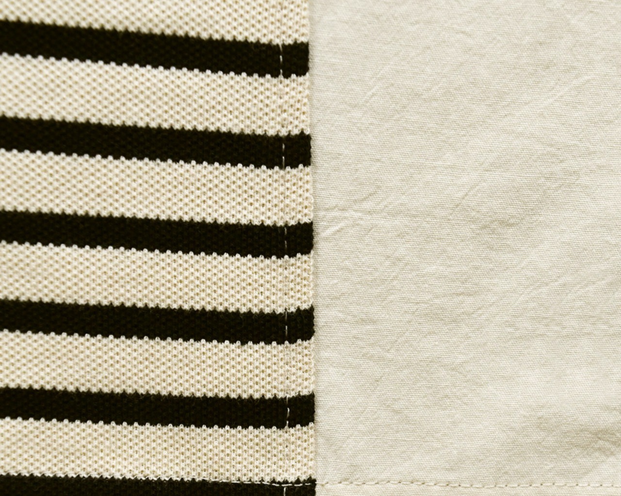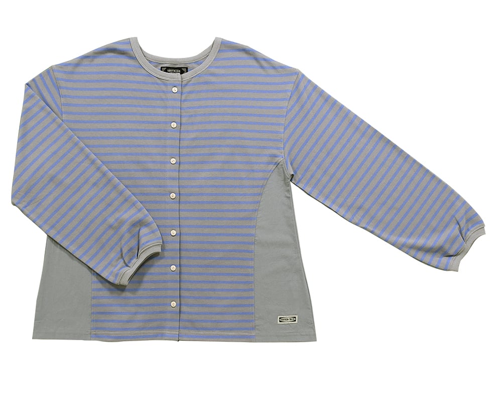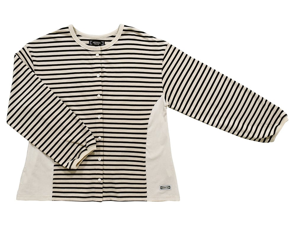 鹿の子編みの秋冬カラーの先染めボーダー生地は、さらっとした肌触りと通気性の良さが特長。前身頃の脇と後ろ身頃に異素材を組み合わせ、軽やかさと奥行きあるデザインを実現した、秋の装いにぴったりなマリンテイストのカーディガンです。
