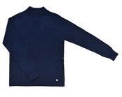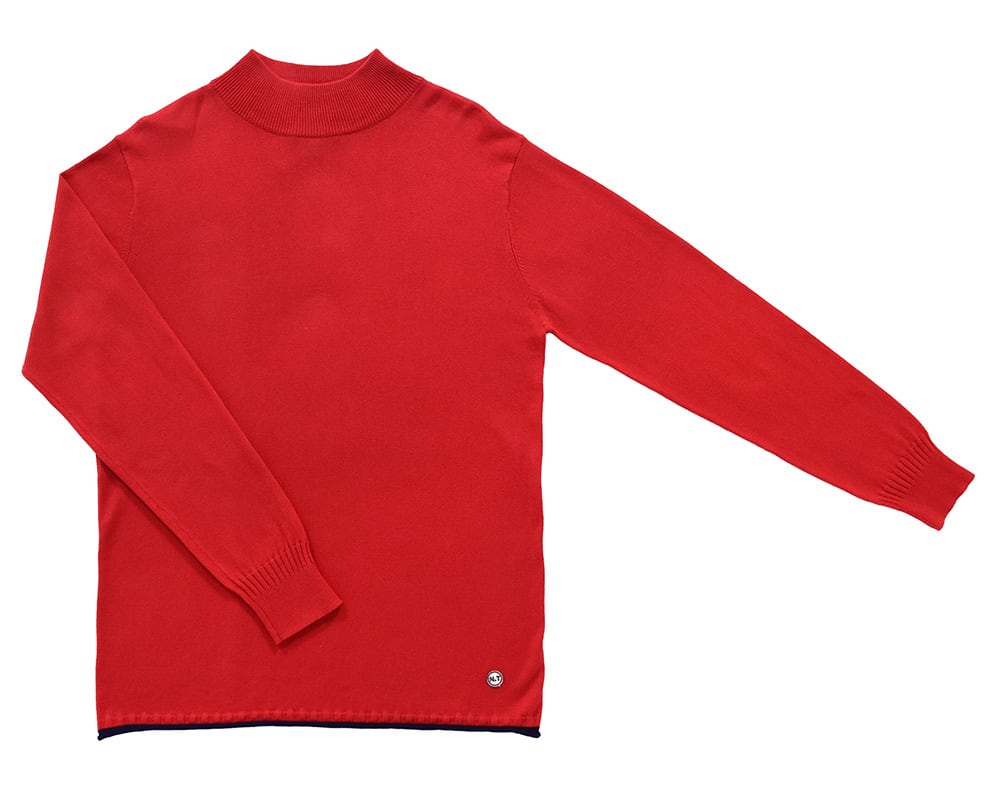 肌触りの良い綿100%で仕上げたハイネックのニット。インナーとしてはもちろんメインにもお使いいただけるカラーで展開。衿と袖口はスッキリと見せてくれるリブにし、裾はメインとして着用時、アクセントになる様配色のカールをさせたデザインにしました。ロゴの小さなワッペンもポイントです。