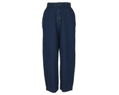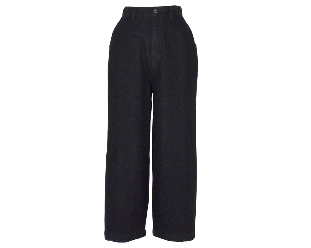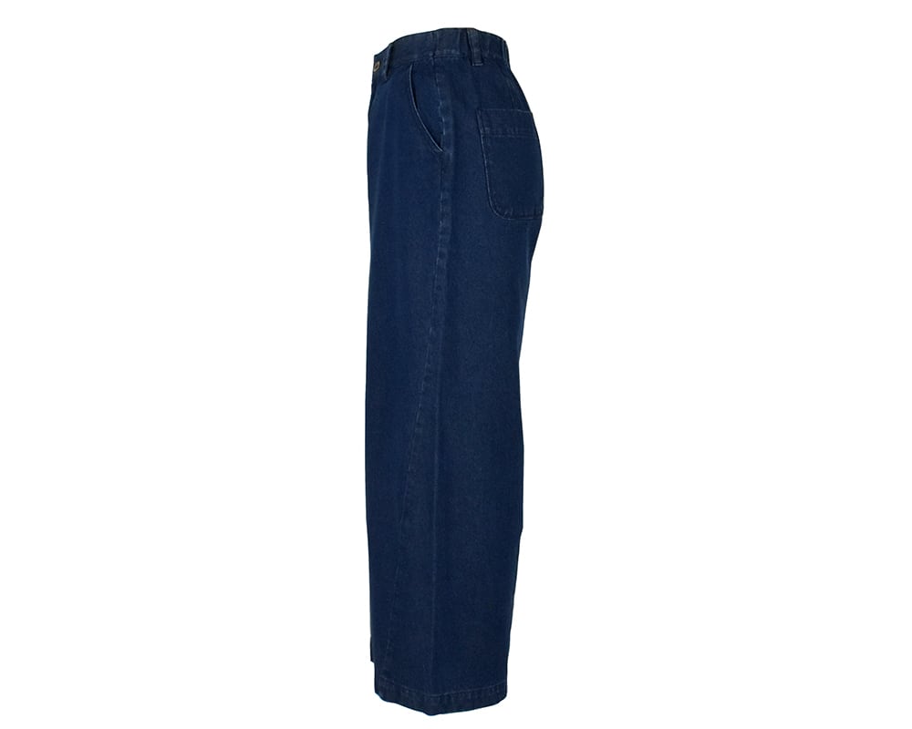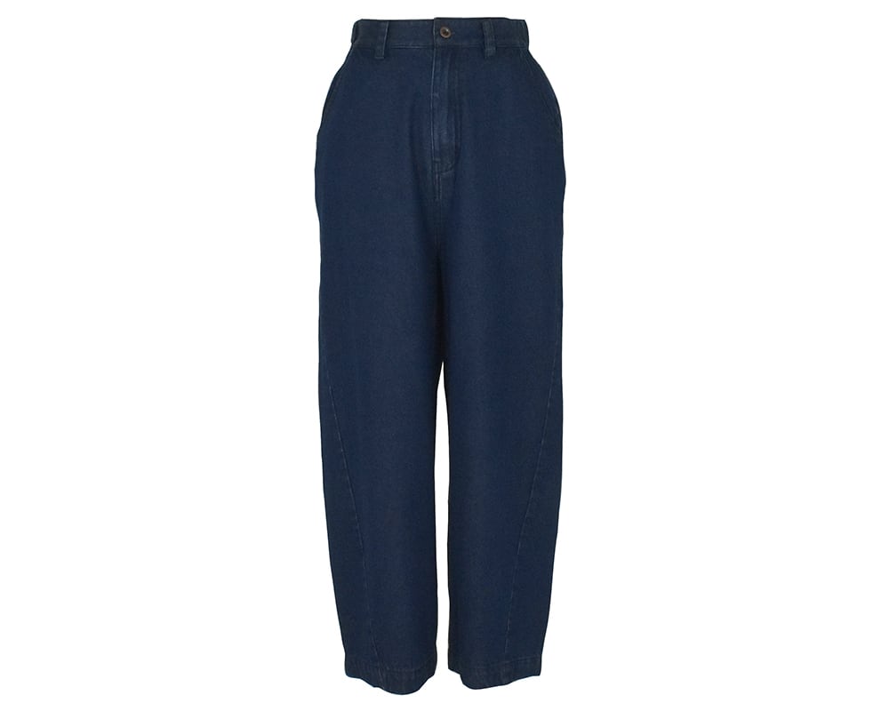 程よい厚みのあるデニムを使用したパンツです。後ろ裾にダーツを入れ脇線をカーブ状にとり、立体的なストレートワイドなシルエットに仕上げています。前開き、後ろウエストはゴム仕様。両脇、後ろポケットあり。