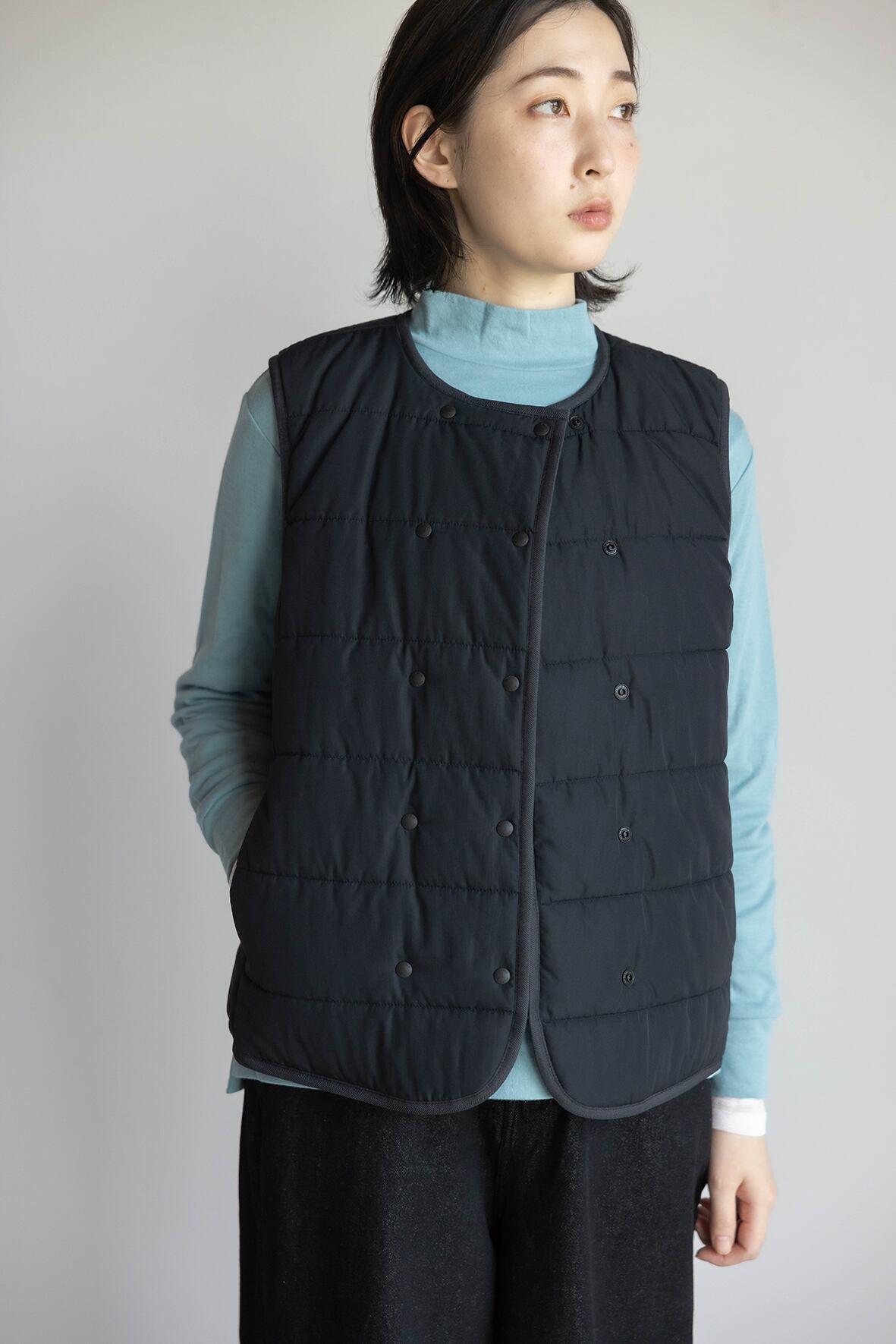 ニットやベストのインナーに着てもすっきり収まるベーシックなシルエットです。