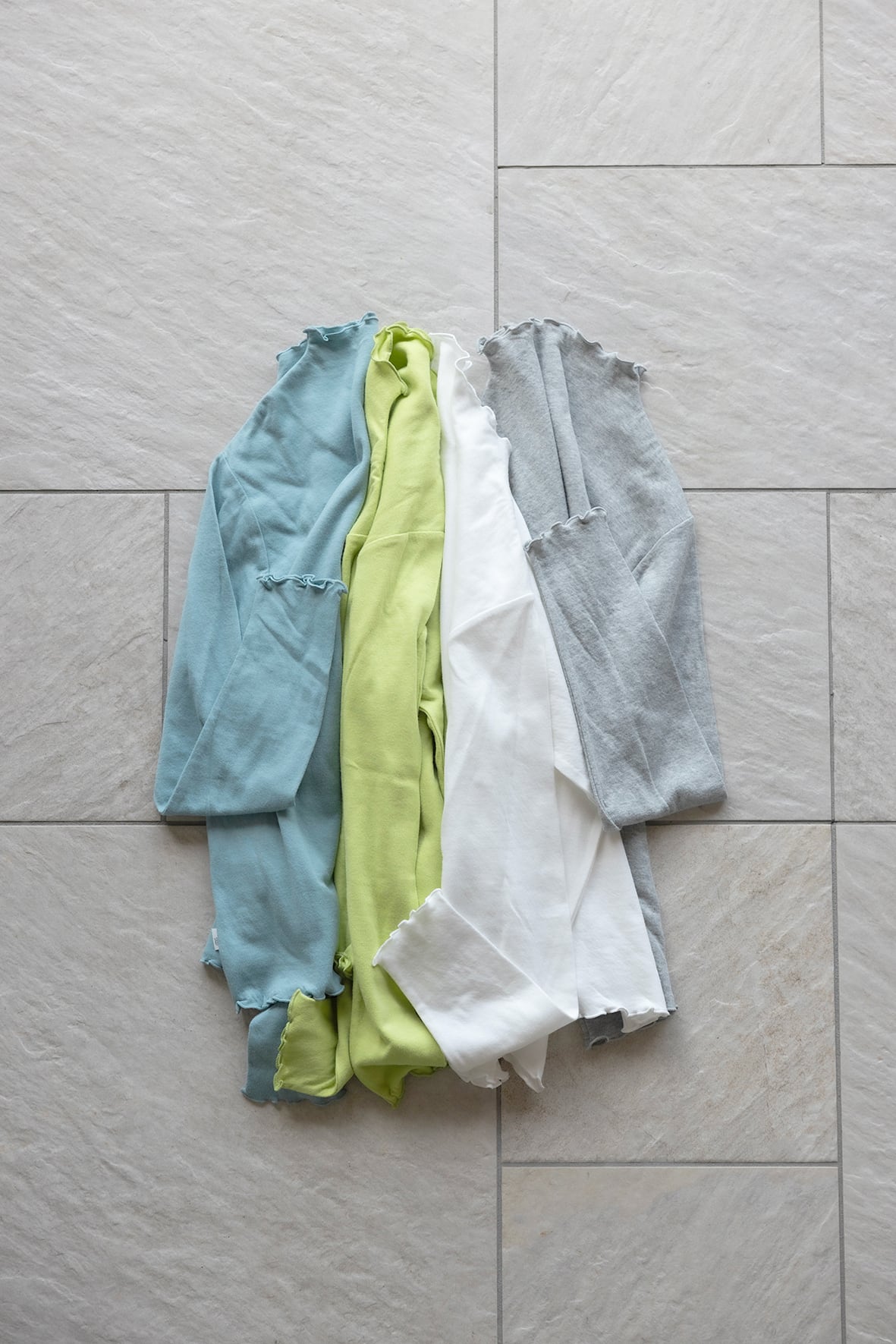綿100%の薄手天竺生地を二枚重ねた接結素材です。空気を含んでふわりと柔らかい着心地の良さが魅力です。