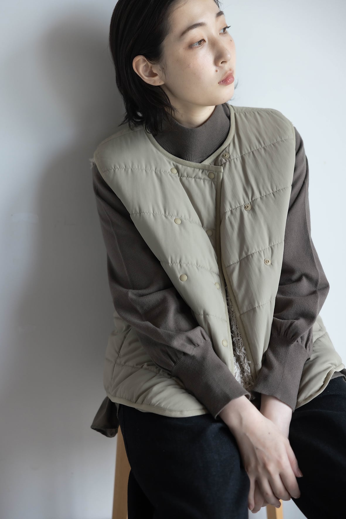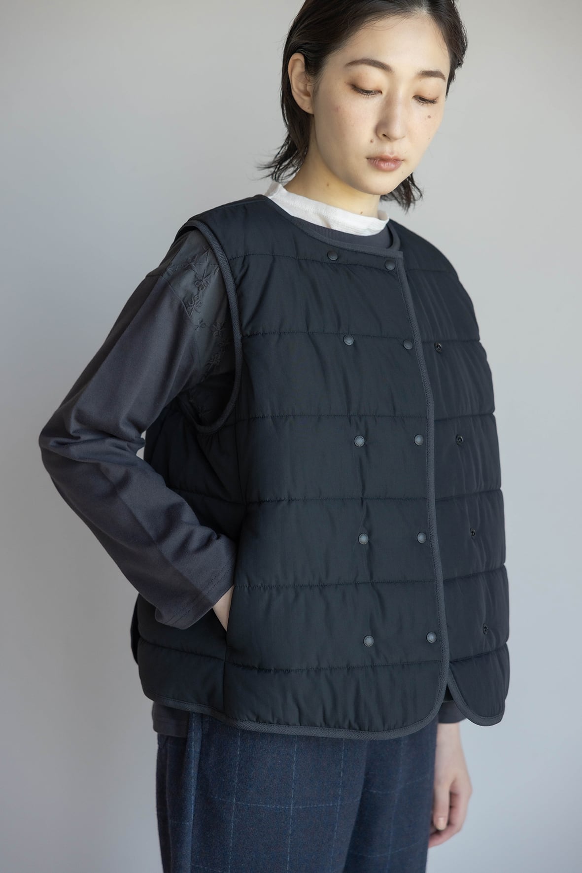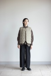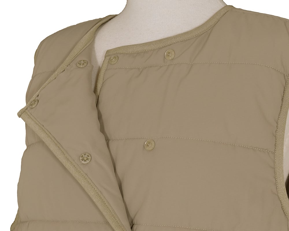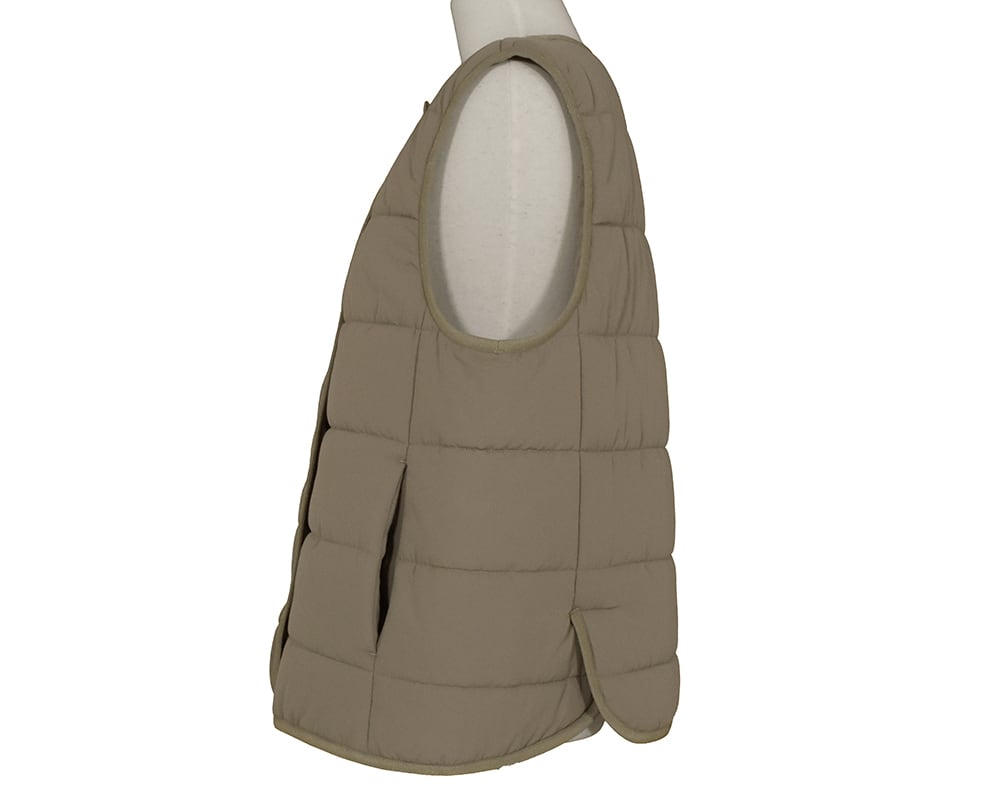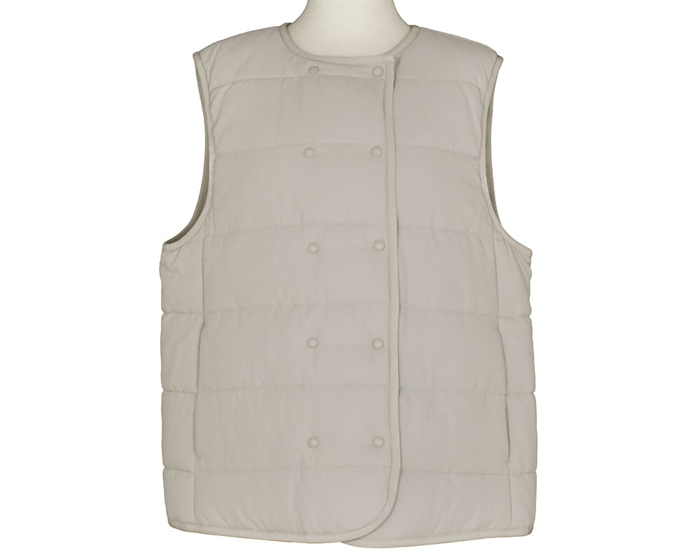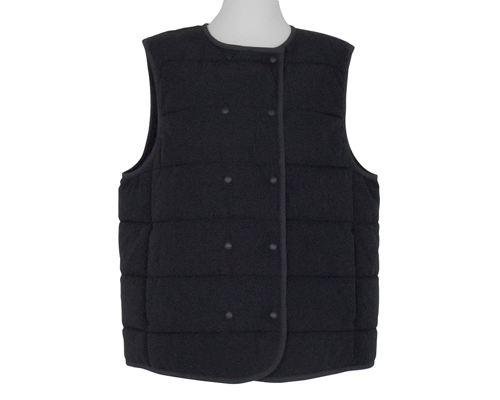 SORONA®の機能綿を使ったアウターベストです。フロントはダブル釦で保温効果を高めたデザインです。伸縮性のあるパイピング素材を使用しAHと裾は楽な着心地に仕上げています。ブラウスやニットとのレイヤードや、冬のライナーベストとしても活躍するアイテムです。