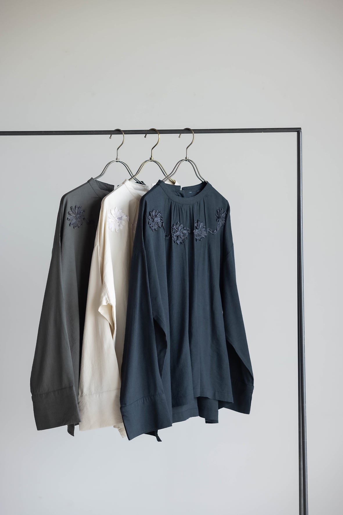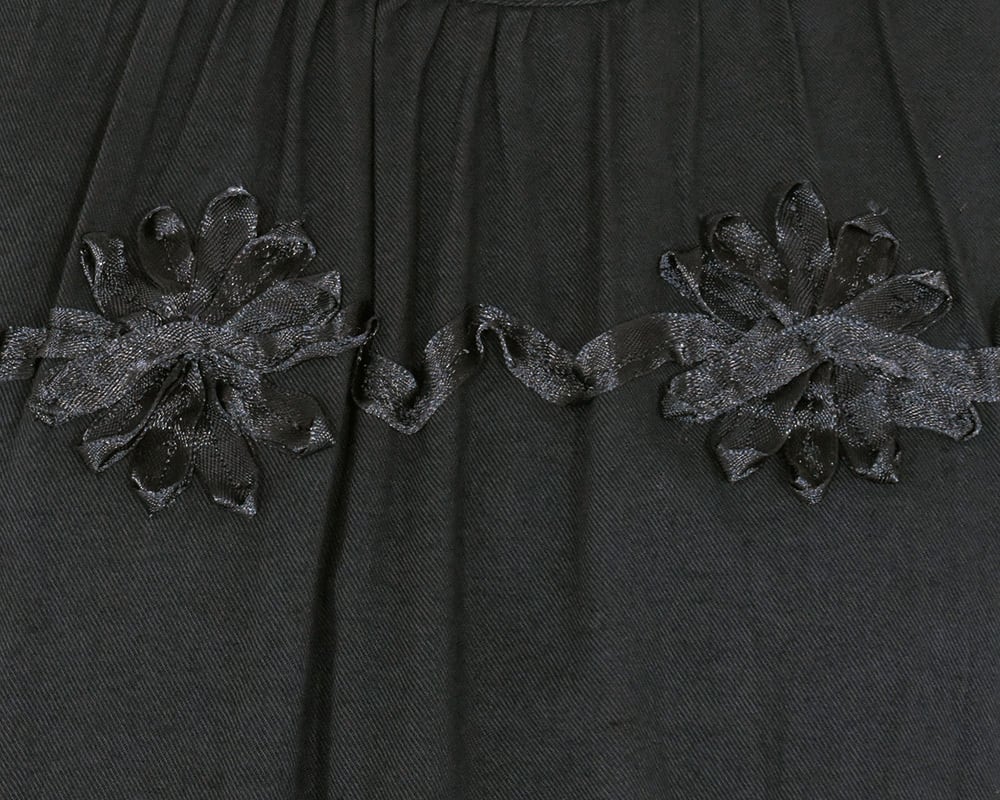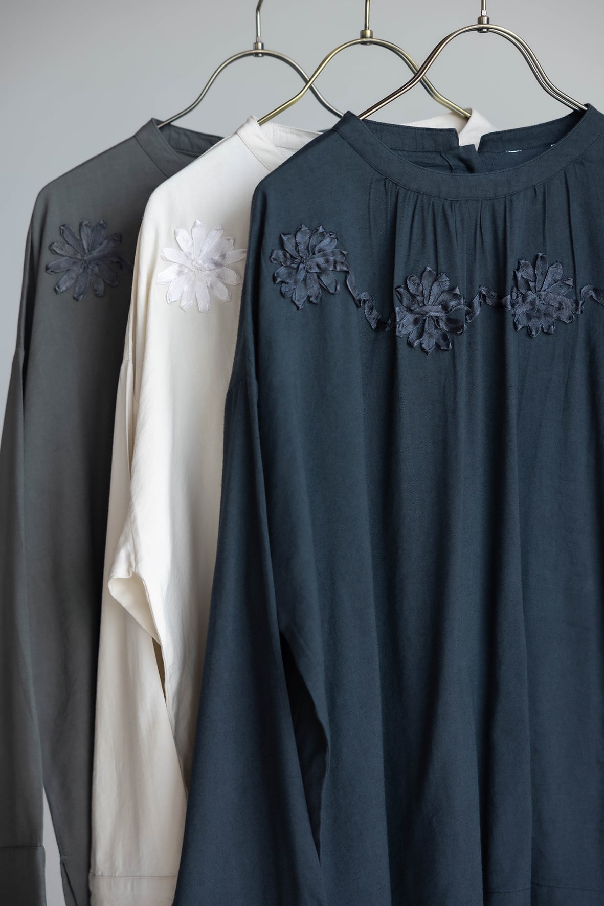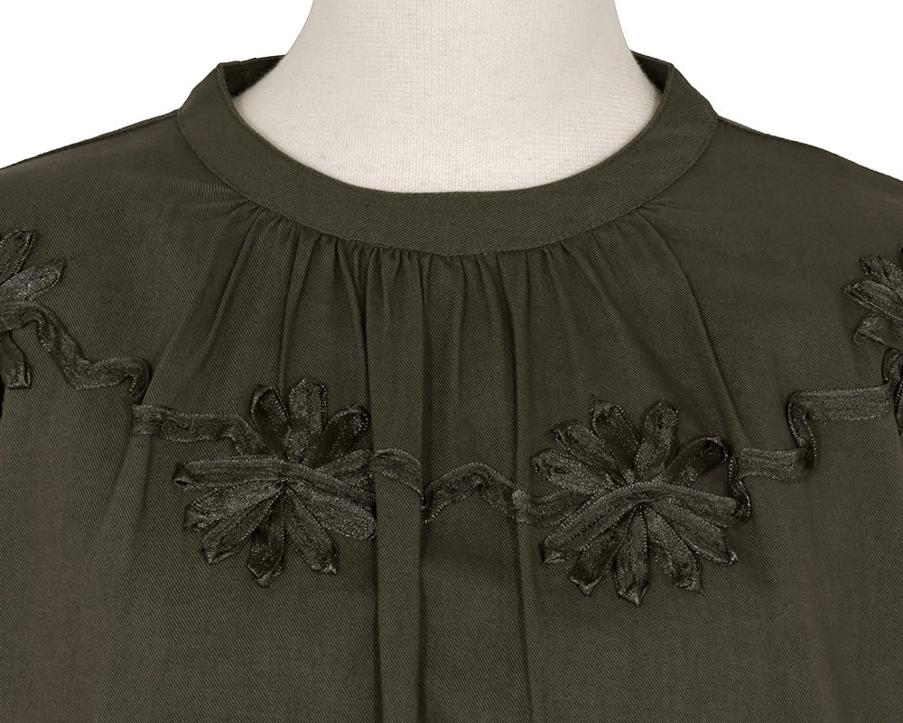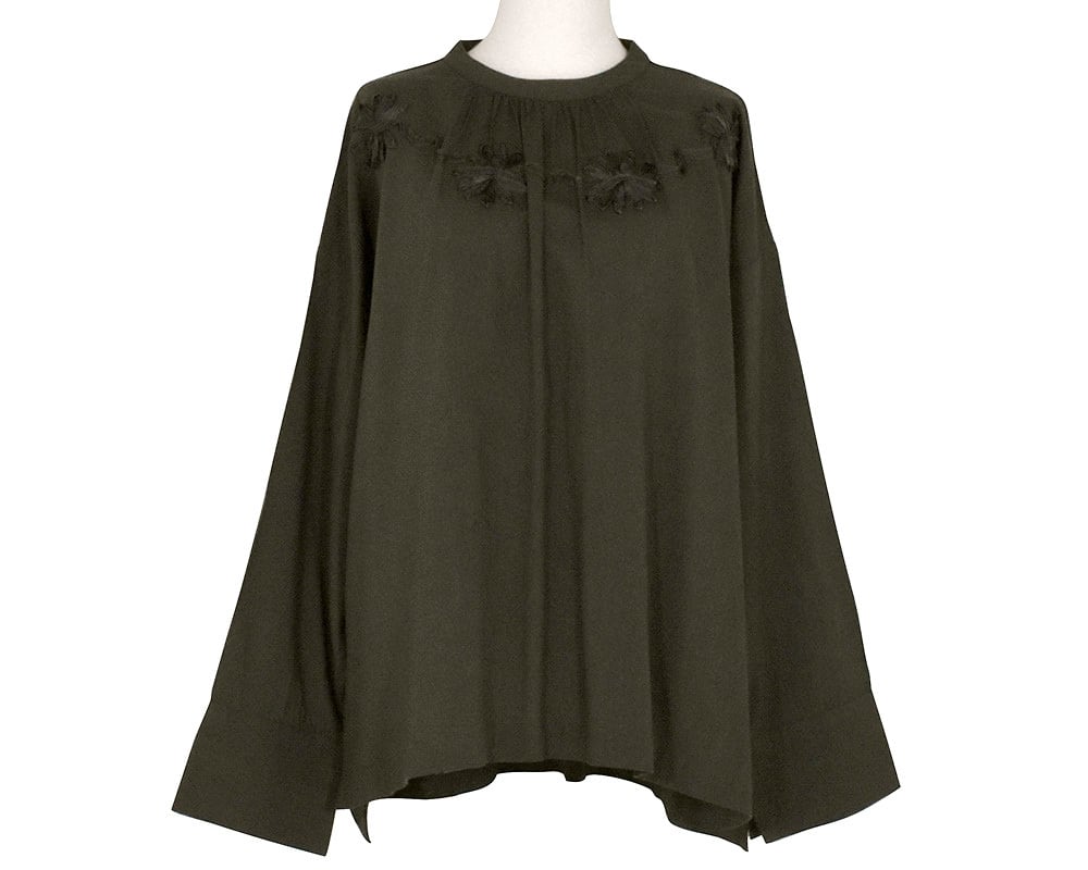 テープ刺繍でモチーフを表現した華やかなプルオーバーブラウスです。袖口はスリットがある広めの設定で折り返し易いデザインです。