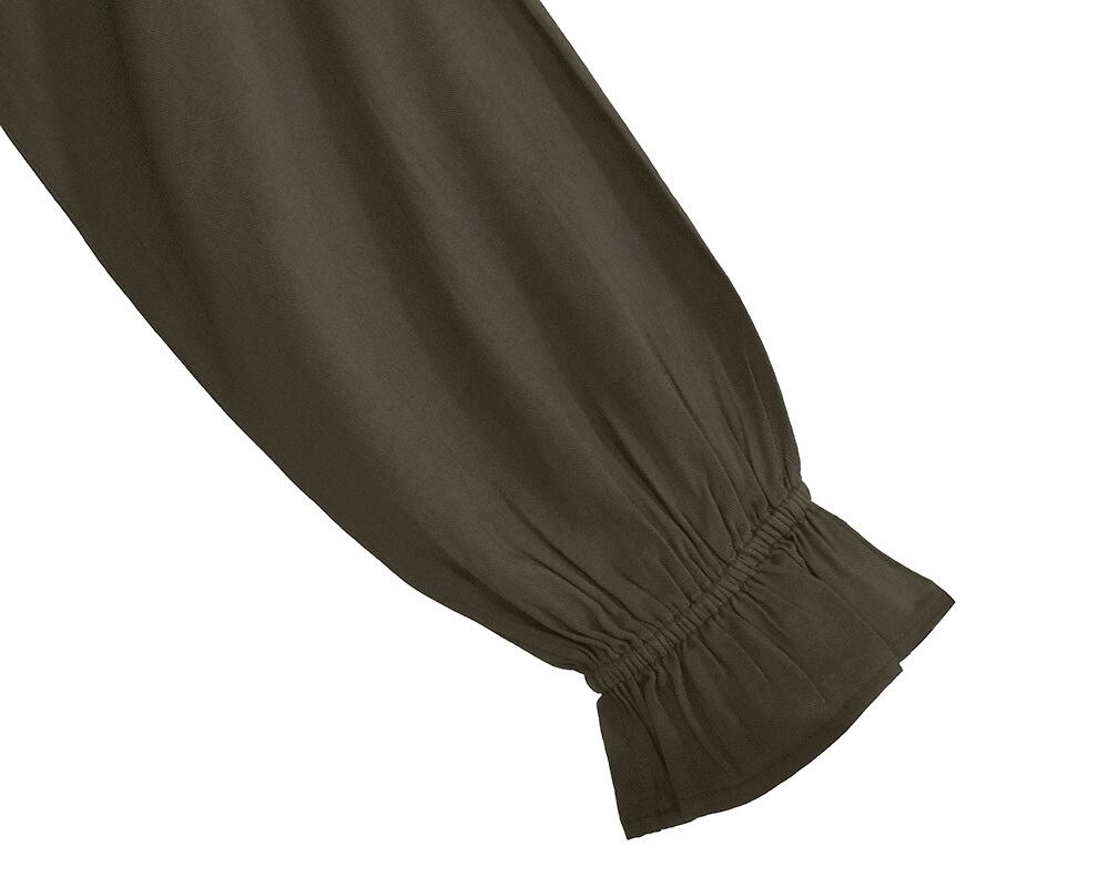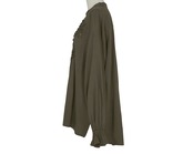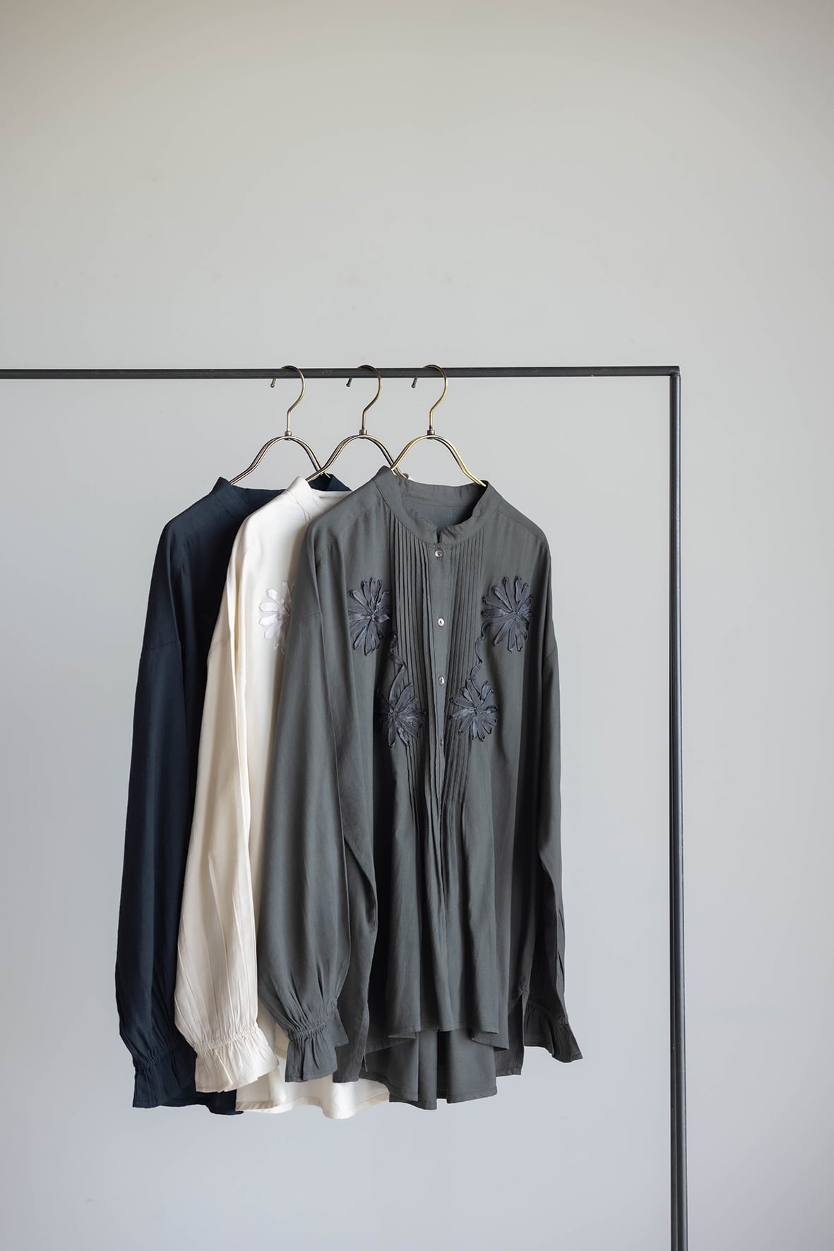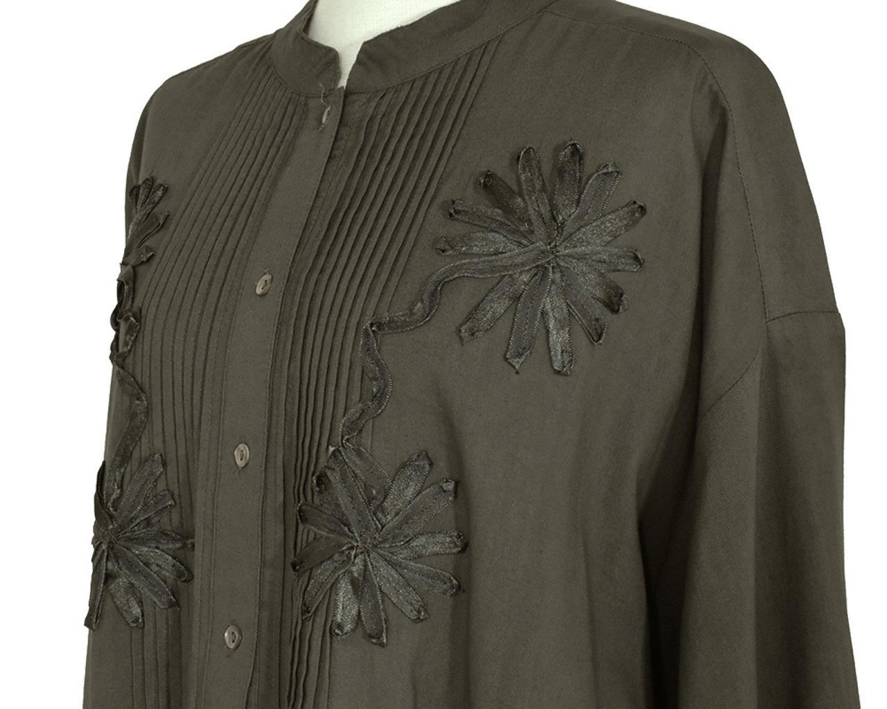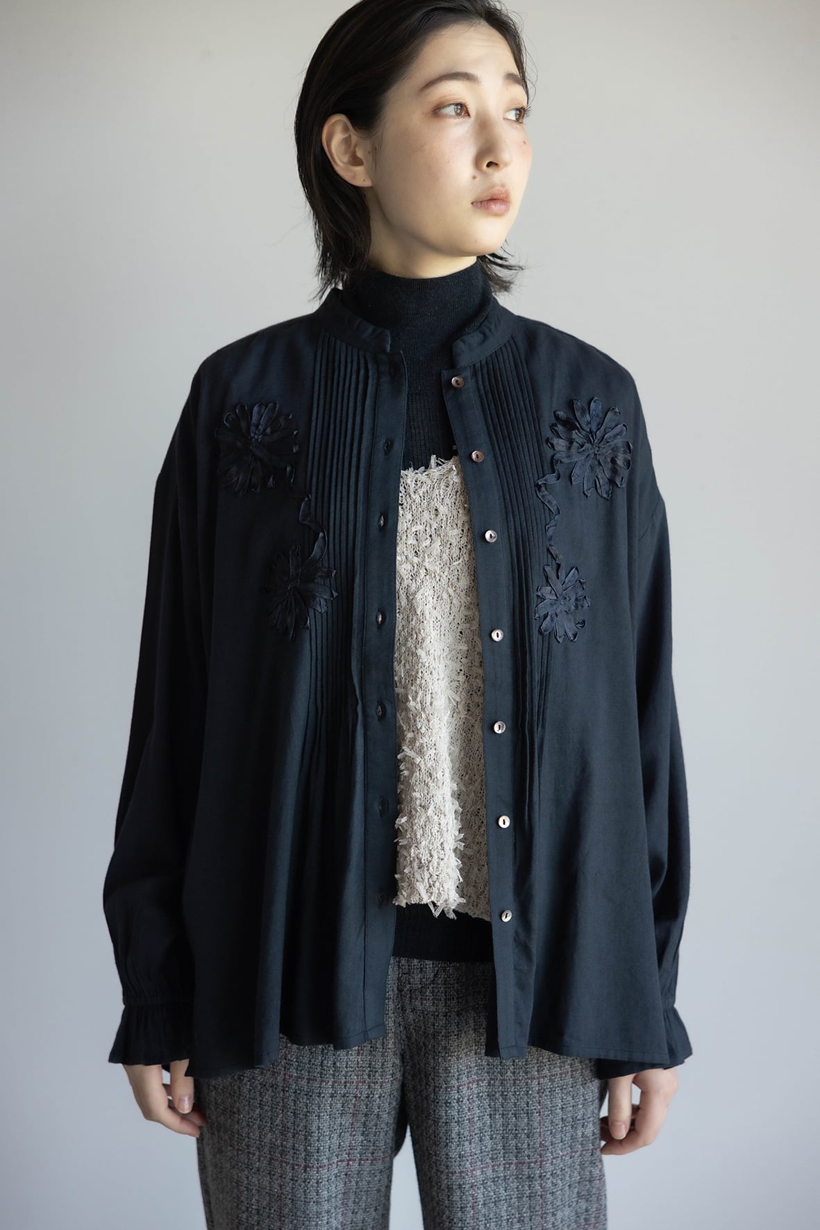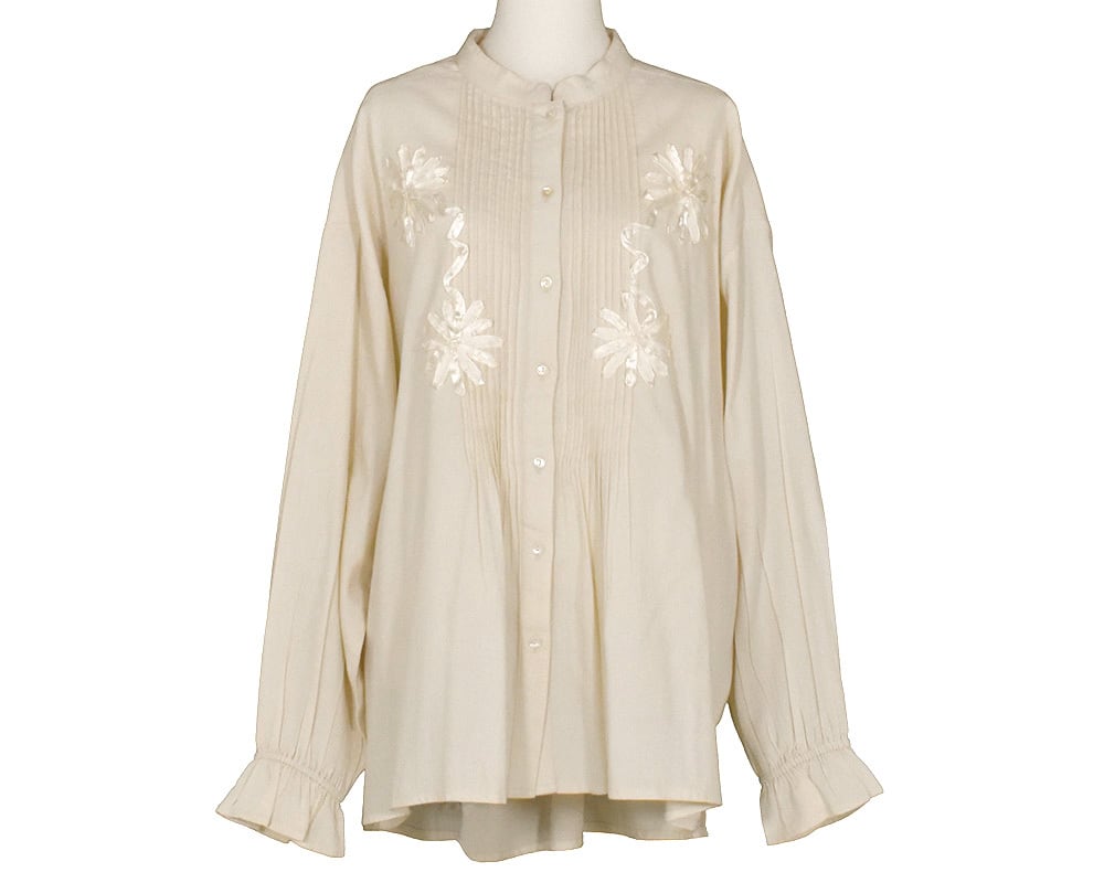 ピンタックにテープ刺繍を重ねてモチーフを表現した華やかなブラウスです。袖口にゴムが入っていて、生地が袖回りにたまるのが女性らしい印象です。ヒップが隠れる長めの着丈です。