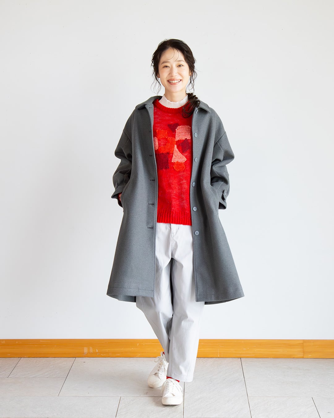 丈はフルレングスで、裾を折って長さの調節もしやすいです。ライトグレーはビエラ生地、インディゴネイビーのデニム生地、2素材を使用。