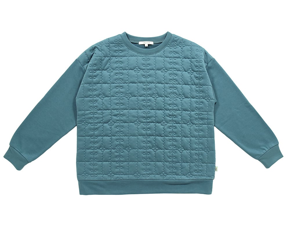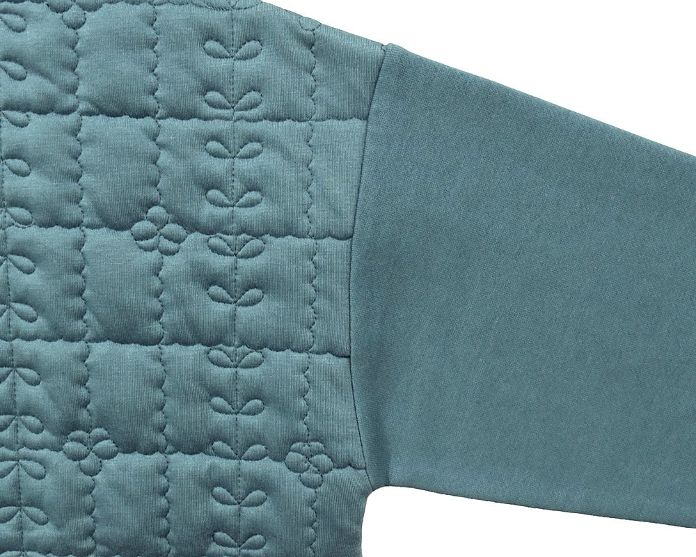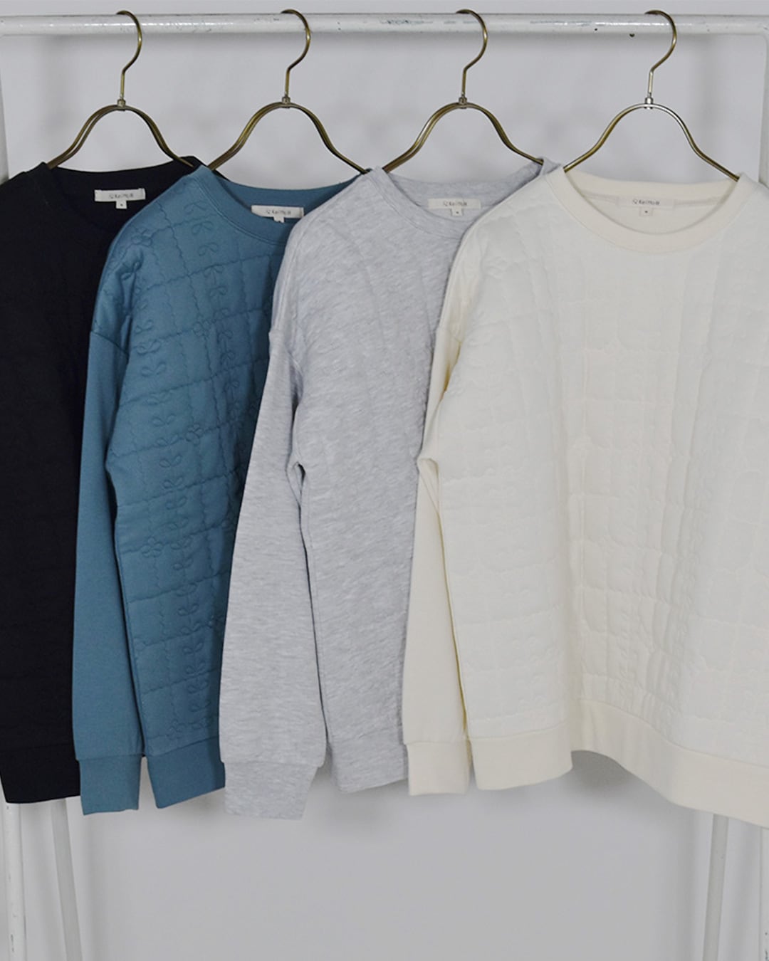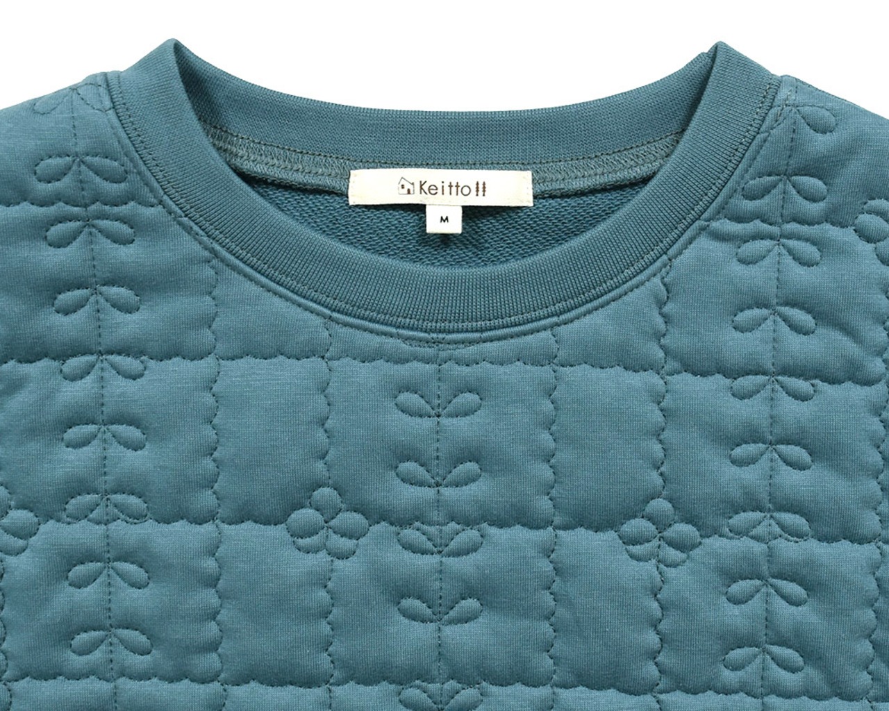 前身頃に中綿入りの草花キルト刺繍を施し、立体感とぬくもりを感じるデザインに仕上げたプルオーバーです。ポリエステル綿のさらっとした肌触りの裏毛を使用しています。前身頃は、草花をイメージした中綿入りのキルト刺繍切り替え。