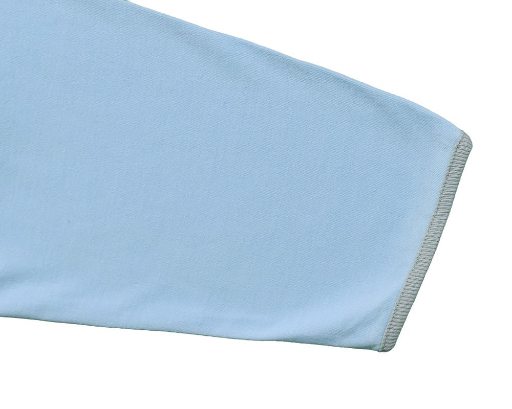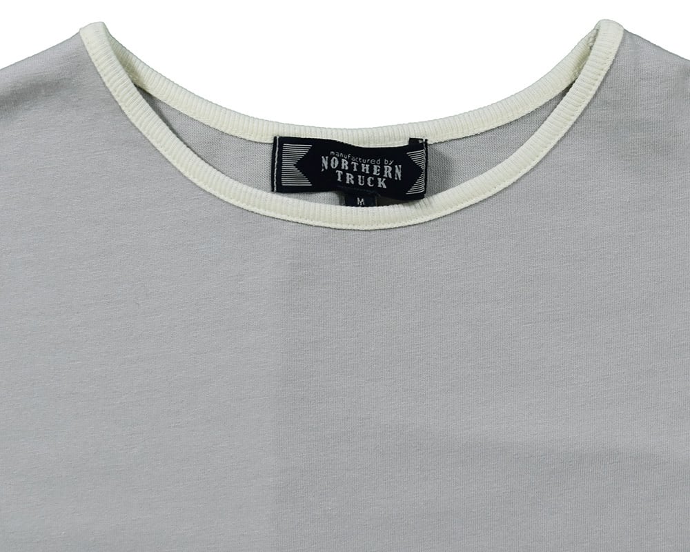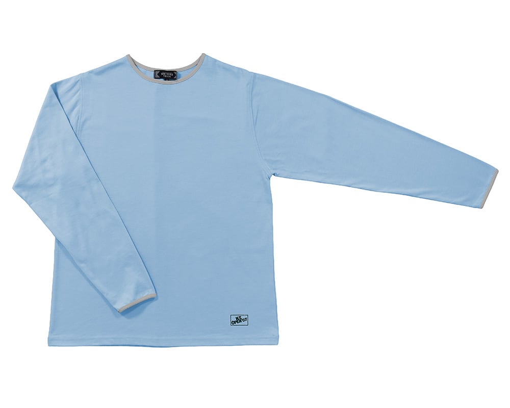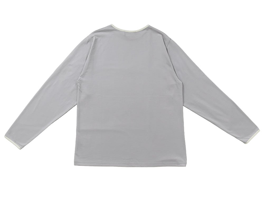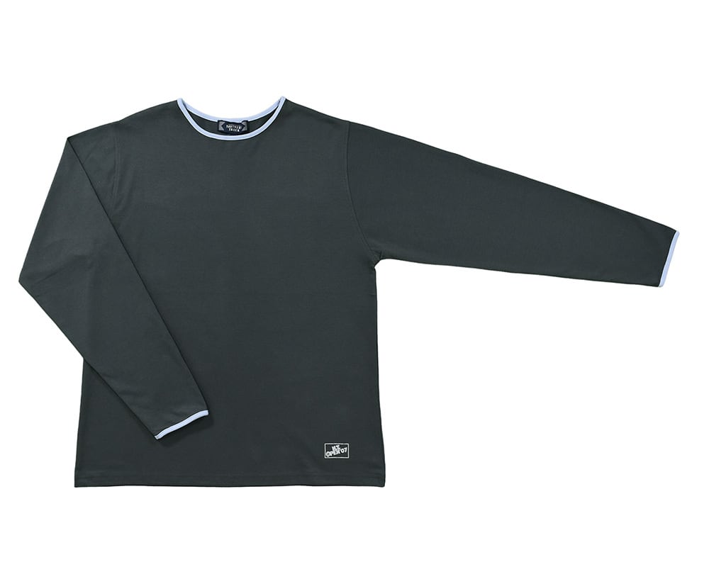 衿ぐりと袖口に配色パイピングを施した、シンプルながらアクセントの効いたロングスリーブTシャツ。前身頃左裾に入ったプリントが、シンプルな中に程よい遊び心を添えます。吸水速乾機能付きの素材で、汗ばむ日もさらりと快適な着心地。