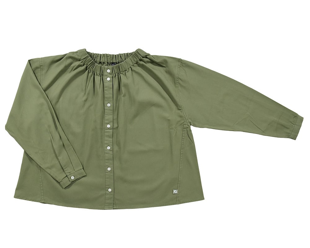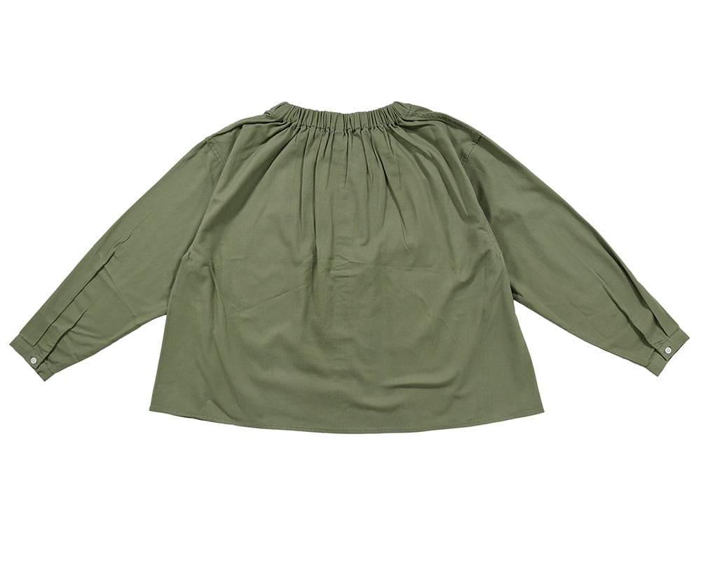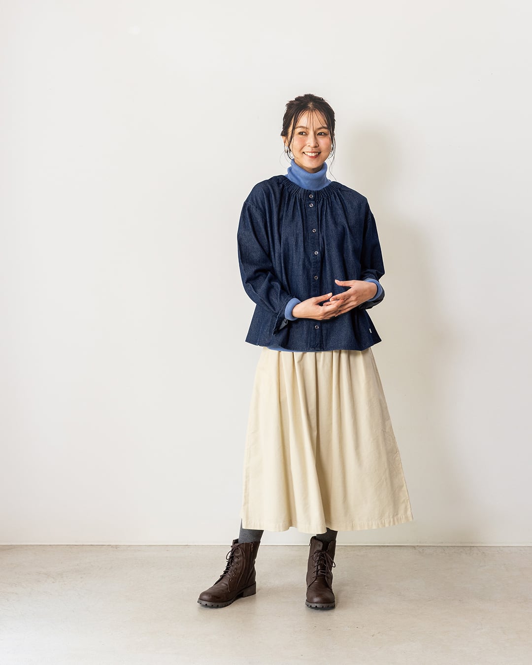 ワーク感のある素材を使用し、甘くなりすぎないよう仕上げたバンドカラーブラウス。