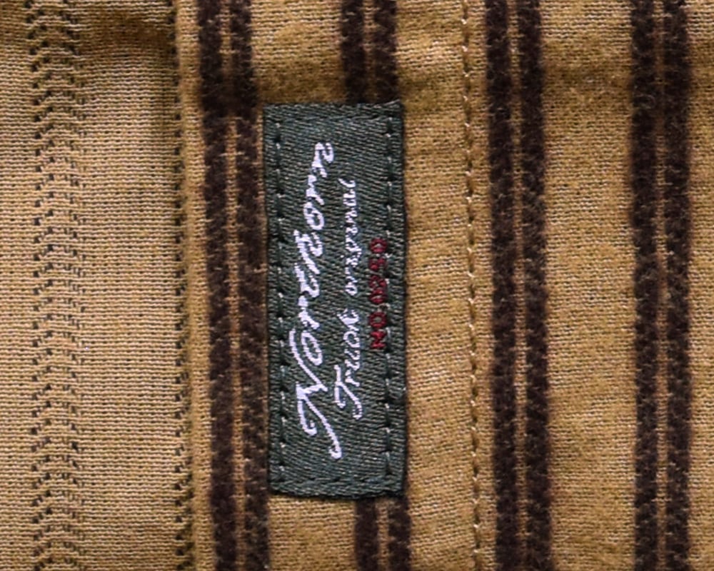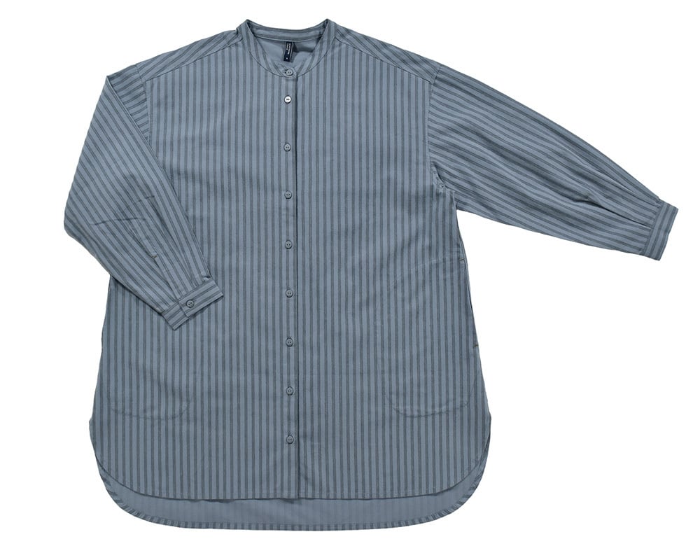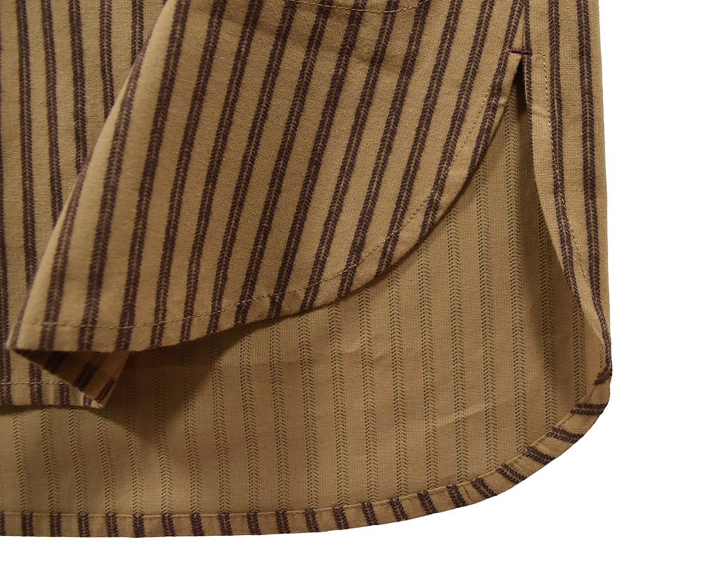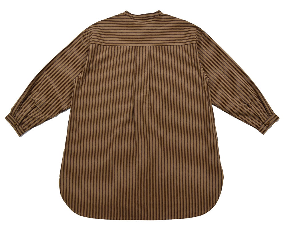 地柄のストライプ柄が特徴のチュニックシャツ。程よくゆとりのあるシルエットで、裾を深めにラウンドさせることで動きやすさをプラス。フロントのビッグポケットがデザインのアクセントに。一枚ではもちろん、羽織りとしても活躍するアイテムです。配色のカン止めや裾のワッペンもポイントです。