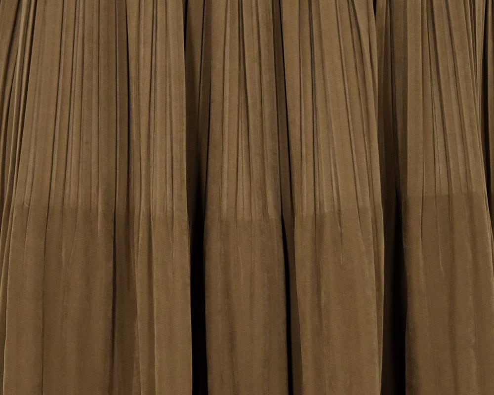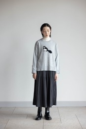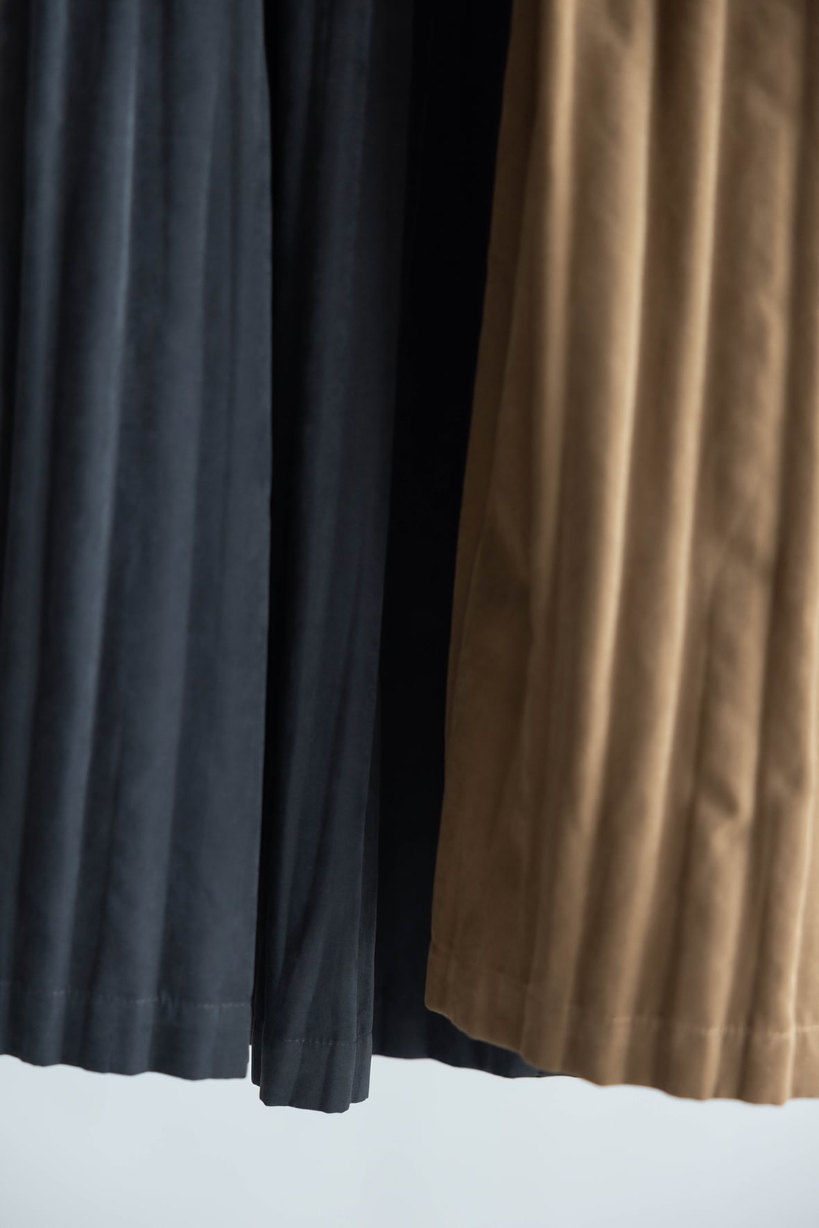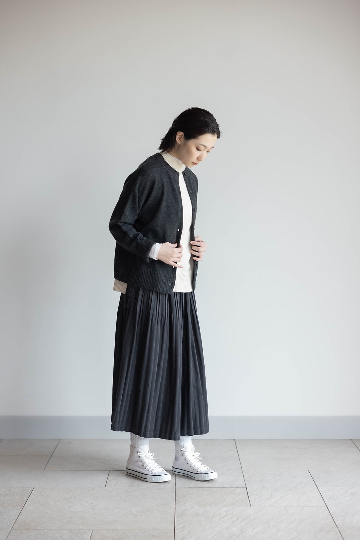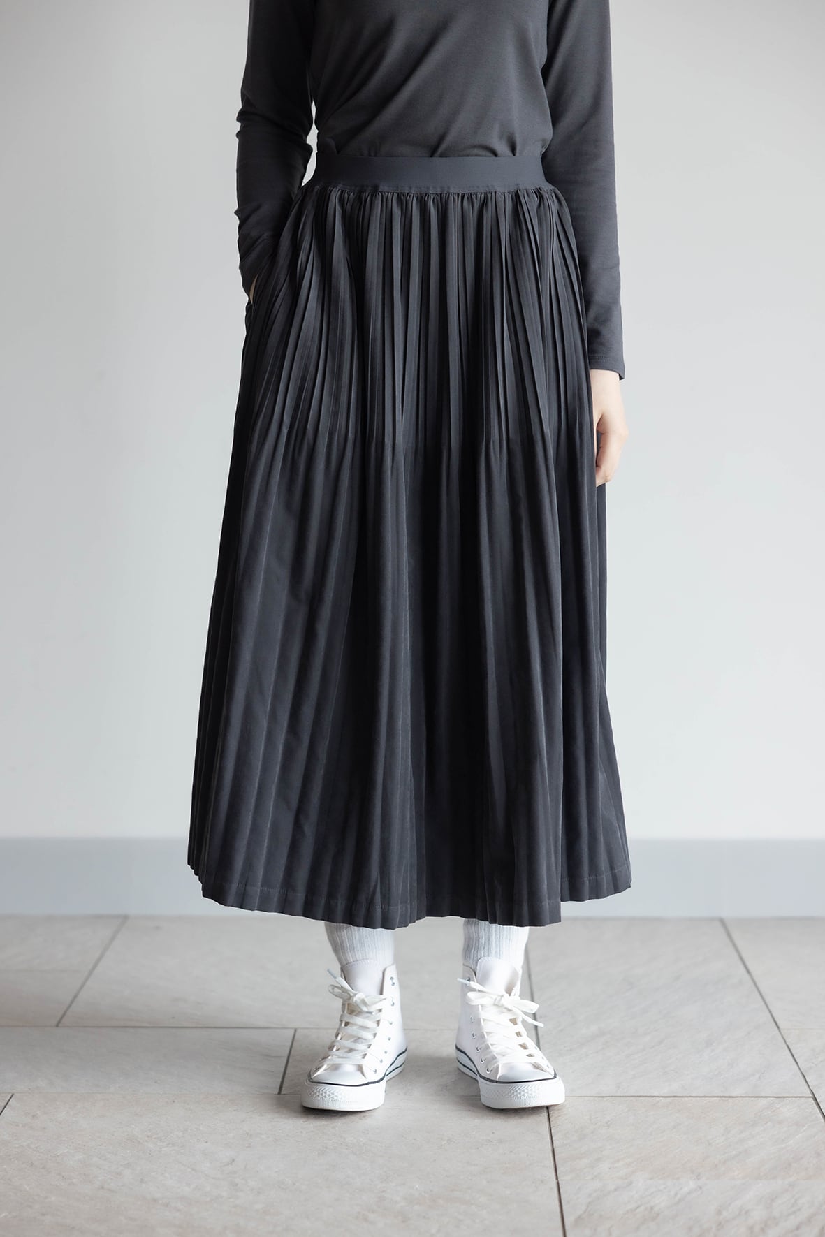 広がりすぎない上品なシルエットが魅力のランダムプリーツスカートです。ウエストはすっきりとした総ゴム仕様で、タックインしてももたつかず、美しいラインをキープします。見た目にも暖かみがあり、リラックス感のある穿き心地で、スニーカーからブーツまで幅広い足元とのコーディネートを楽しめます。両脇ポケット付き。