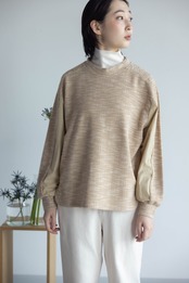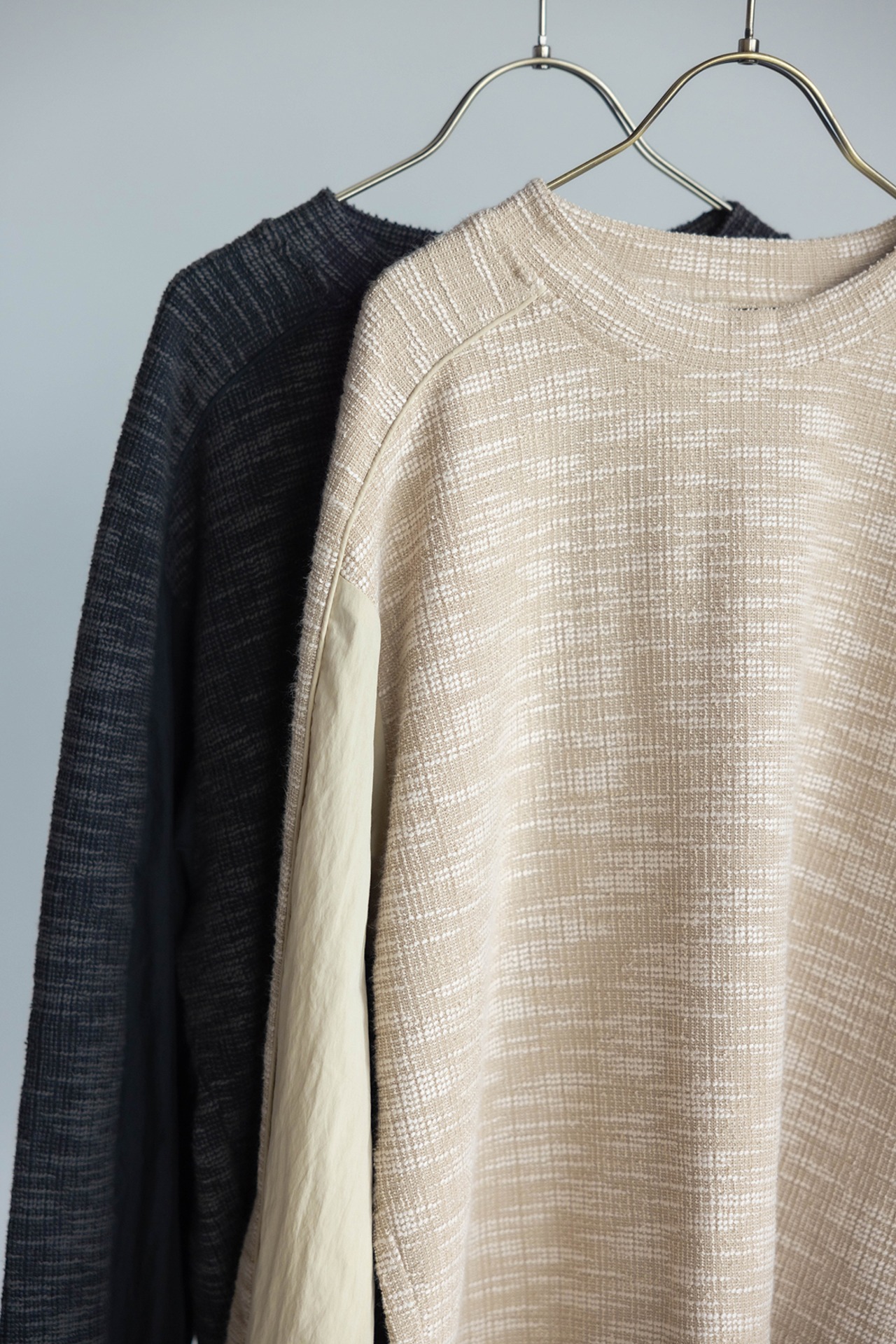 袖下を布帛で切り替えたドッキングデザインのプルオーバーです。身頃は柔らかく着心地のよいジャージ素材を使用し、摩擦が生じやすい袖下には異素材の布帛を使用することで、動きやすさと耐久性を両立した一枚に仕上げています。