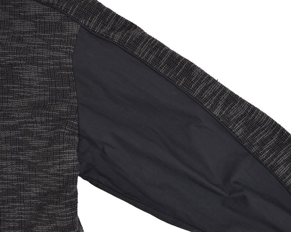 ファンシーツイードを伸縮性のあるジャージで表現した素材です。身頃と袖下でジャージと布帛、2種類の素材を組み合わせることで、見た目の変化と機能性を兼ね備えています。