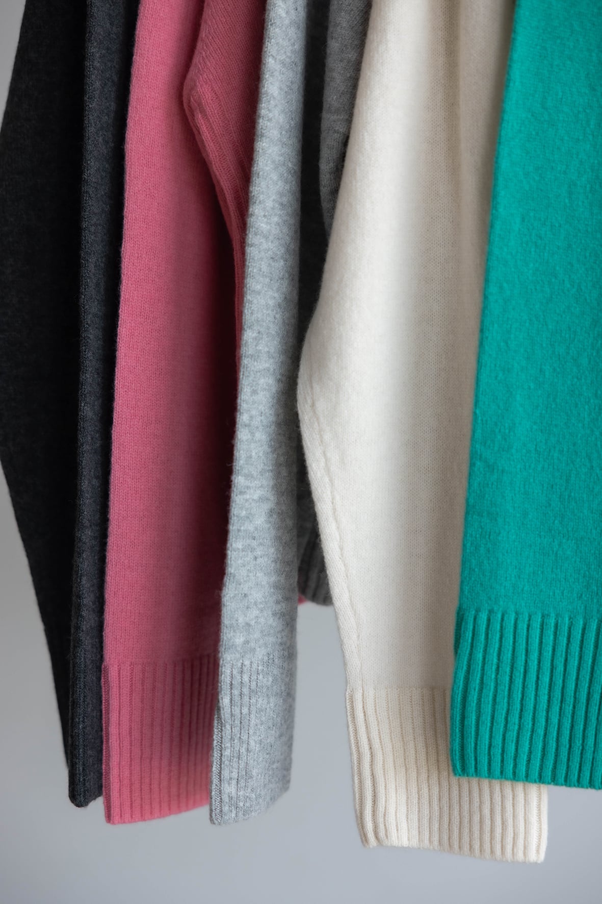 定番人気のウール100%(カシミヤとウールをブレンドした)糸です。軽くて暖かく、肌触りが柔らかいのが特徴です。ベーシックなカラーに加え発色の良いカラーを含む全5色展開です。