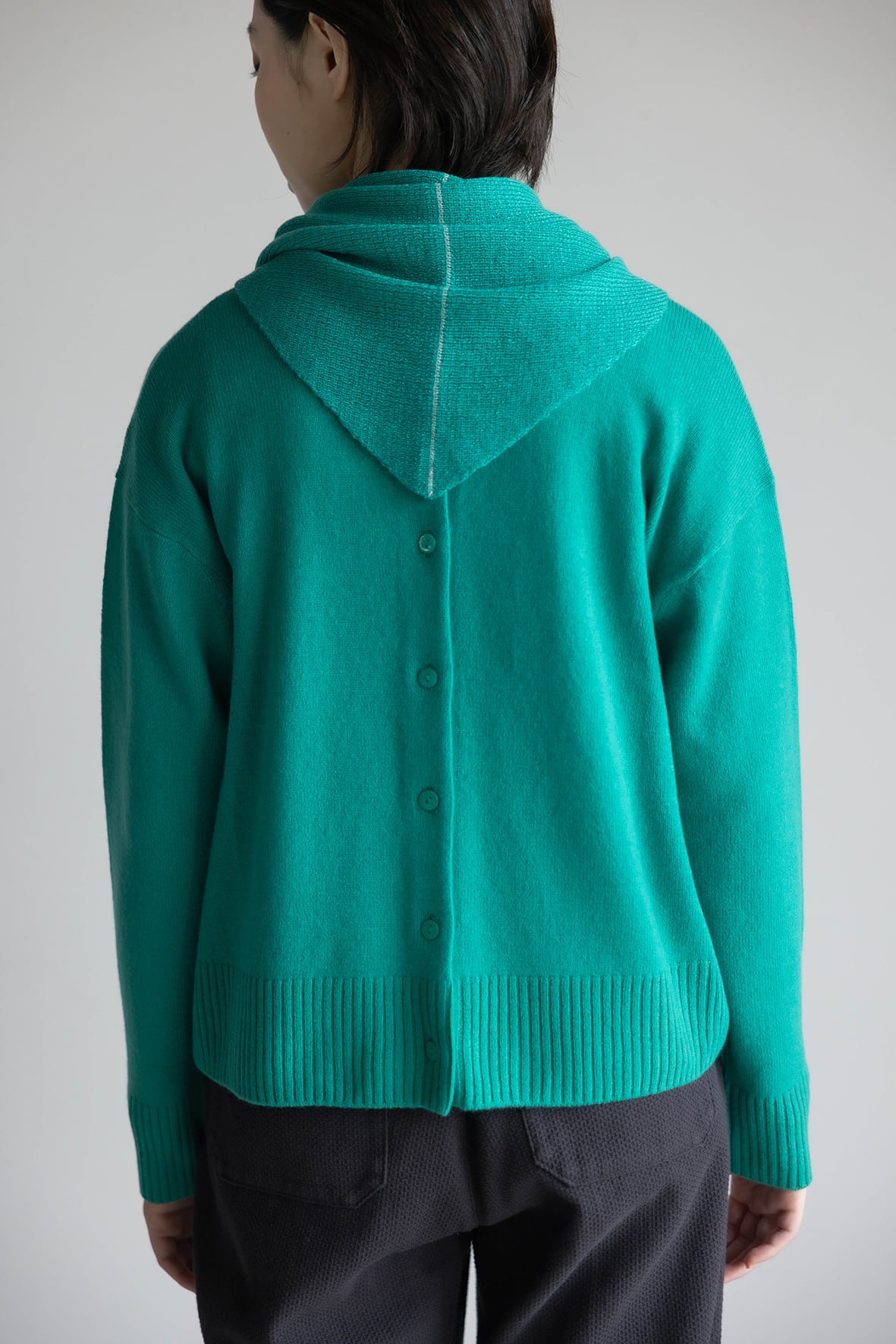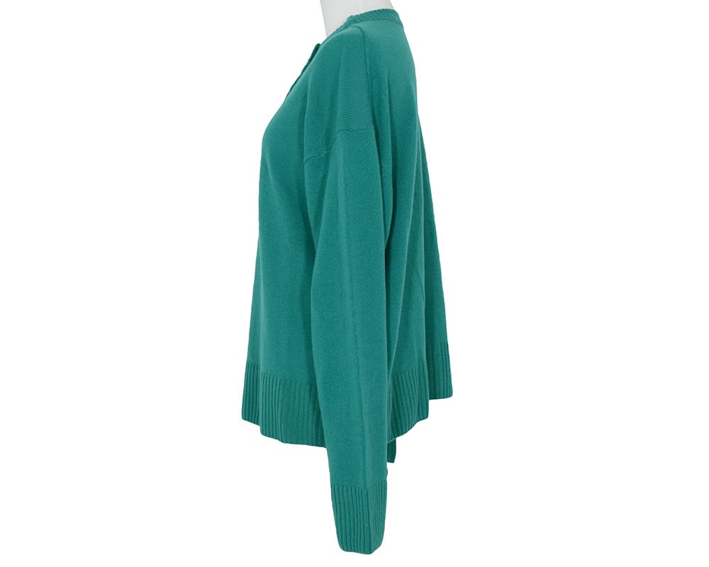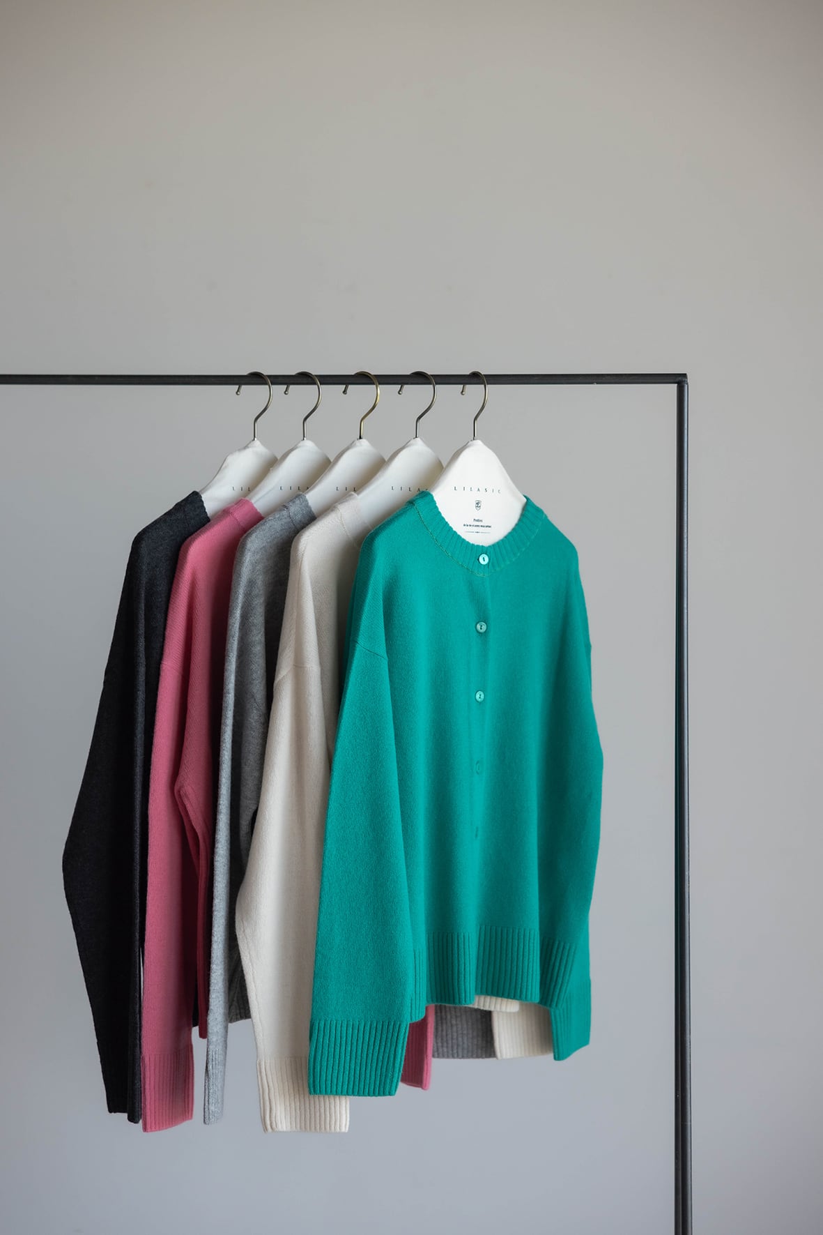 首元がすっきり詰まったクルーネックが特徴の、クリーンな印象のカーディガンです。アームホールや袖周りに程よいゆとりを持たせており、重ね着しても窮屈感なくリラックスして着用いただけます。前後どちらでも着られる2WAY仕様で、スタイリングの幅も広がる一枚です。