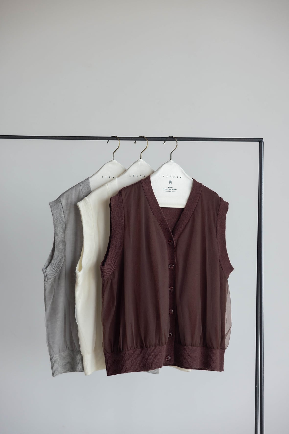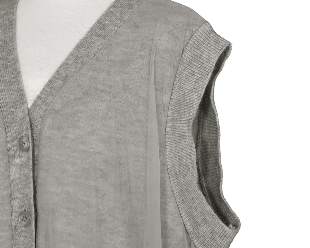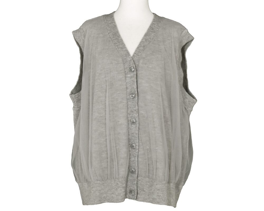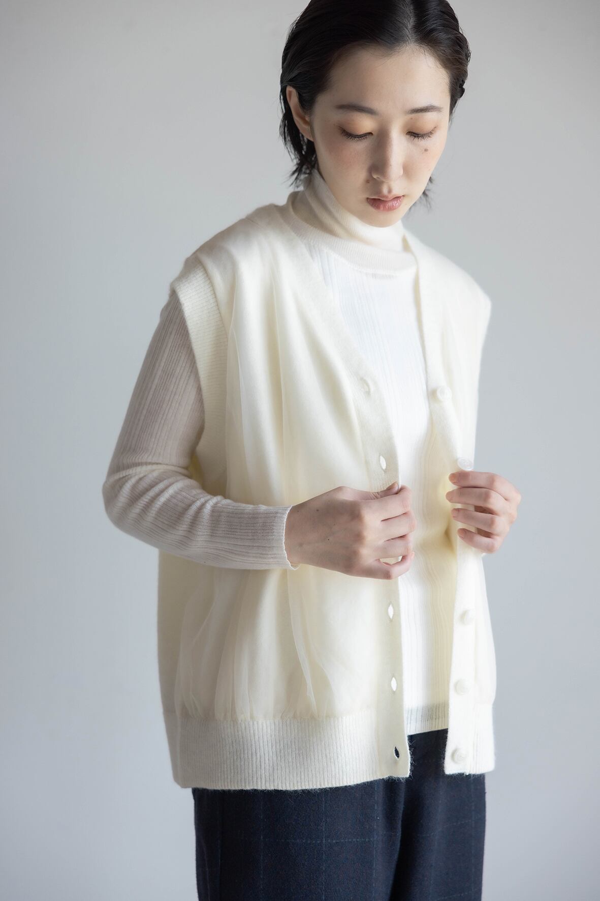 ニットの上からチュールを重ねたベストです。同色のチュールなので馴染みがよく、トレンド感がありつつ着やすいアイテムです。Tシャツと重ねたり、気温が下がるとタートルと重ねたりなどレイヤードしやすく長く着ていただける1枚です。