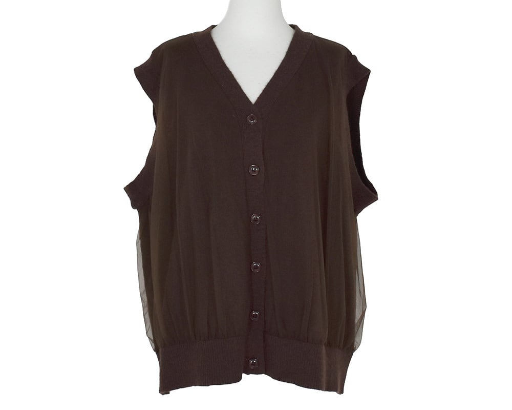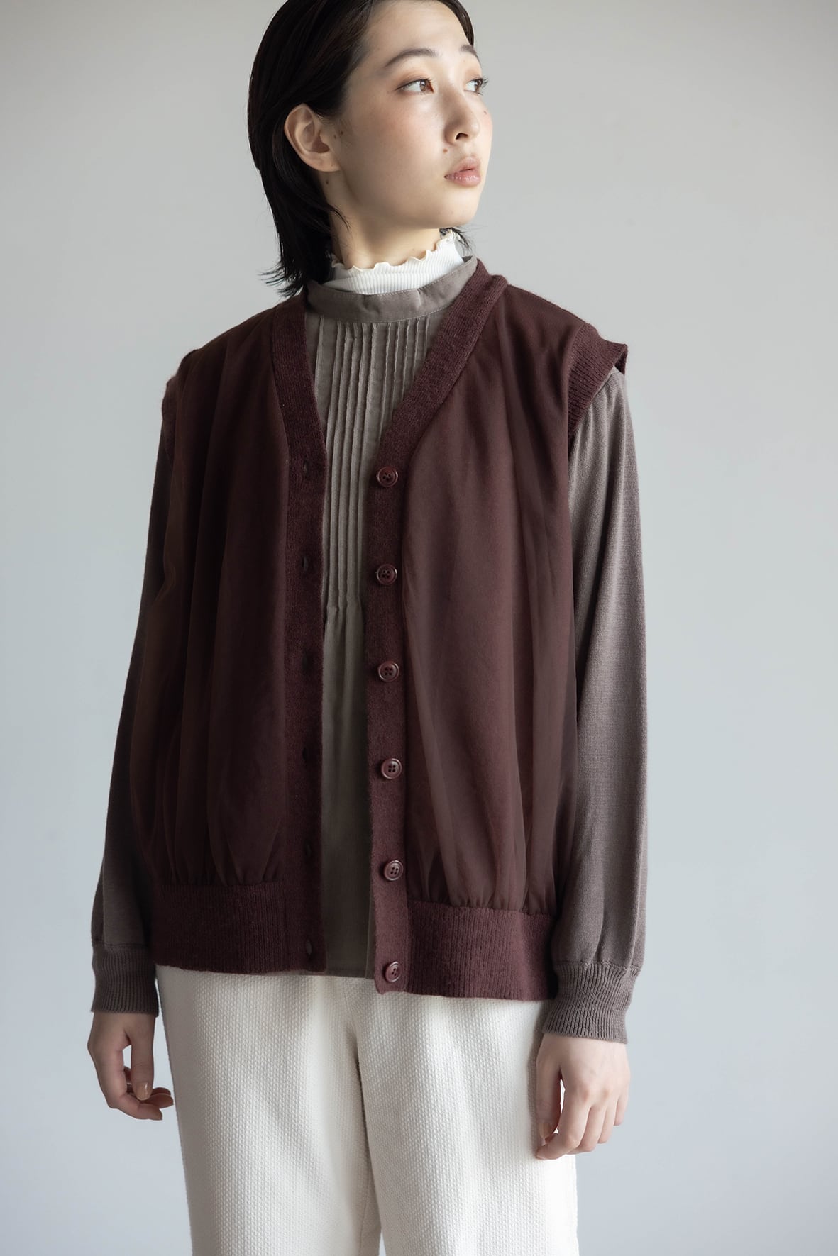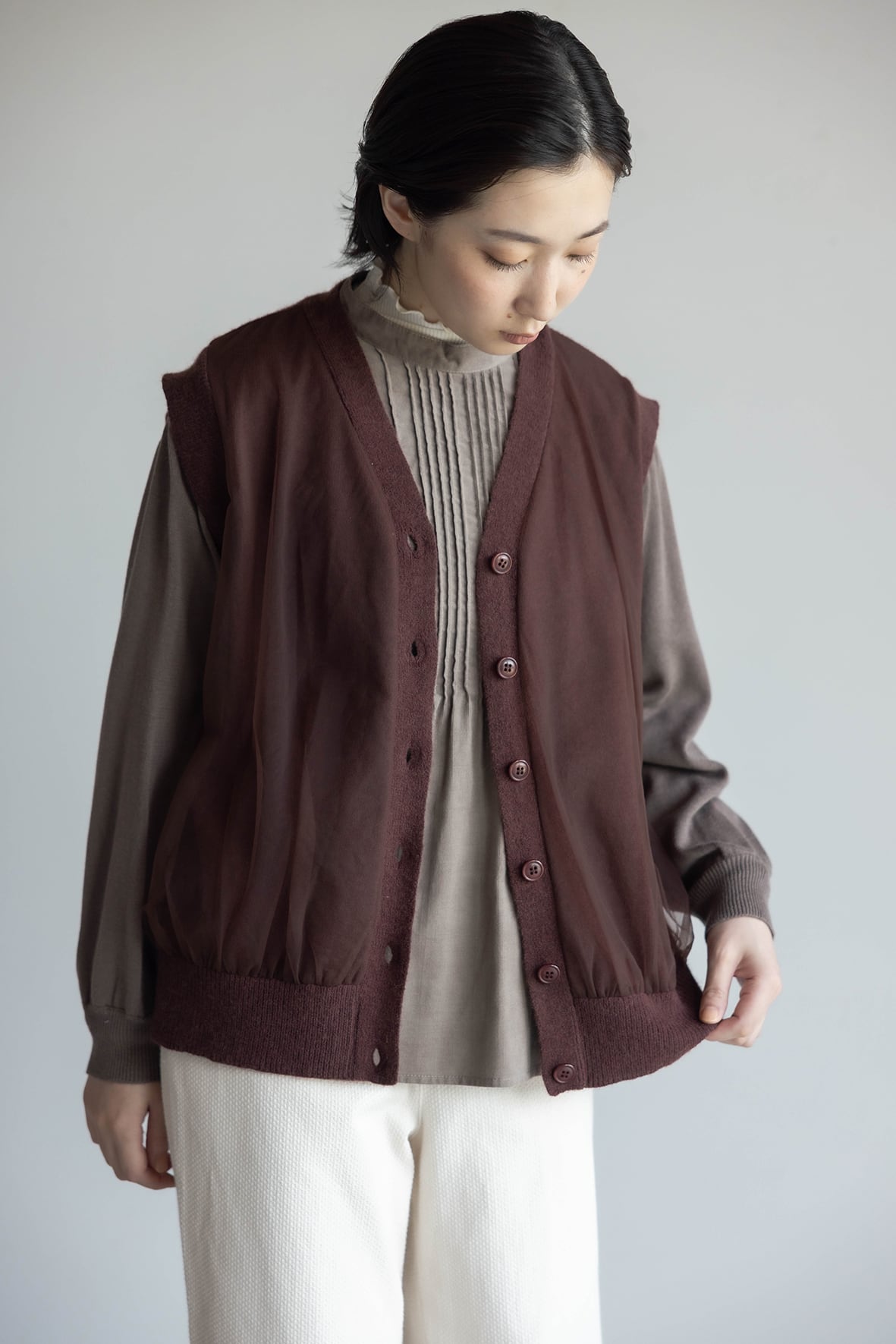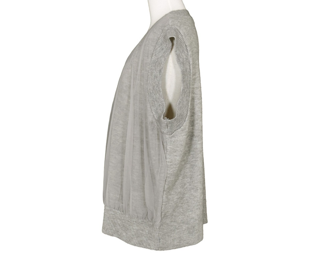 ニットの上からチュールを重ねたベストです。同色のチュールなので馴染みがよく、トレンド感がありつつ着やすいアイテムです。Tシャツと重ねたり、気温が下がるとタートルと重ねたりなどレイヤードしやすく長く着ていただける1枚です。