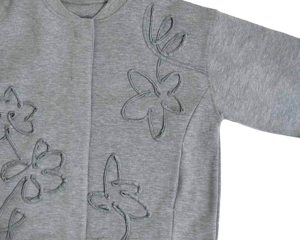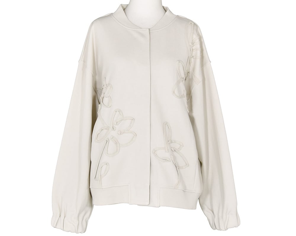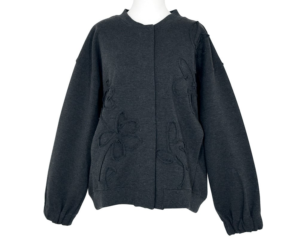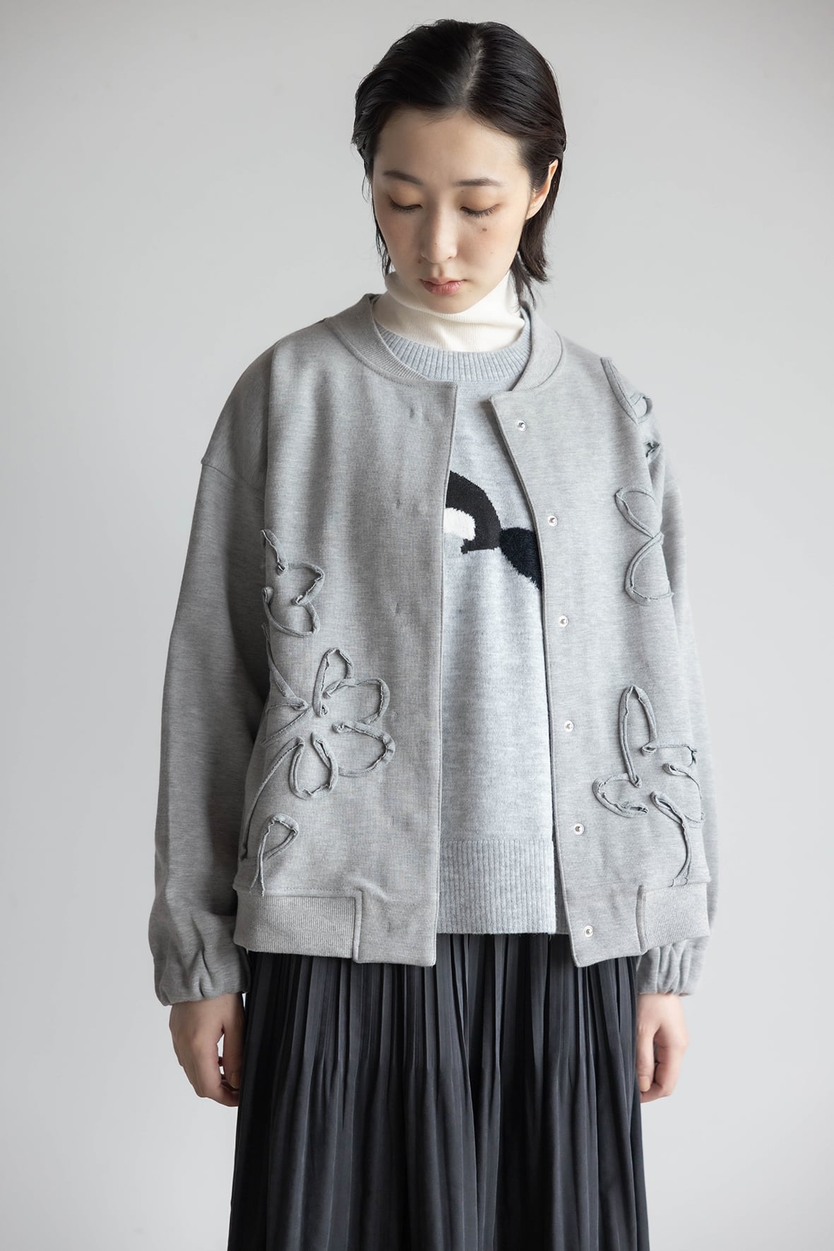 ブレード刺繍が目を引くデザインで、ブルゾンのような中間アウターの感覚で取り入れられるカーディガンです。クルーネックの襟ぐりで、タートルネックを重ねるなどのレイヤードも楽しみやすいデザインです。ブレード刺繍はこの季節に開花するシクラメンをイメージしています。両脇シームポケットあり。