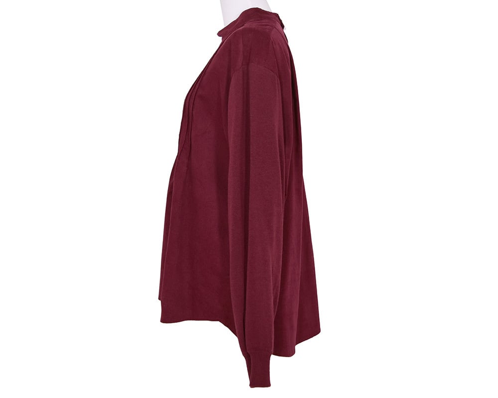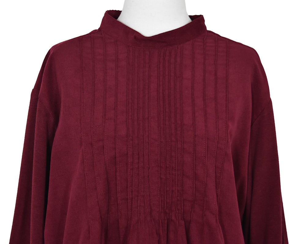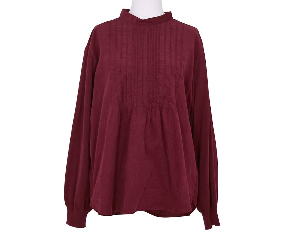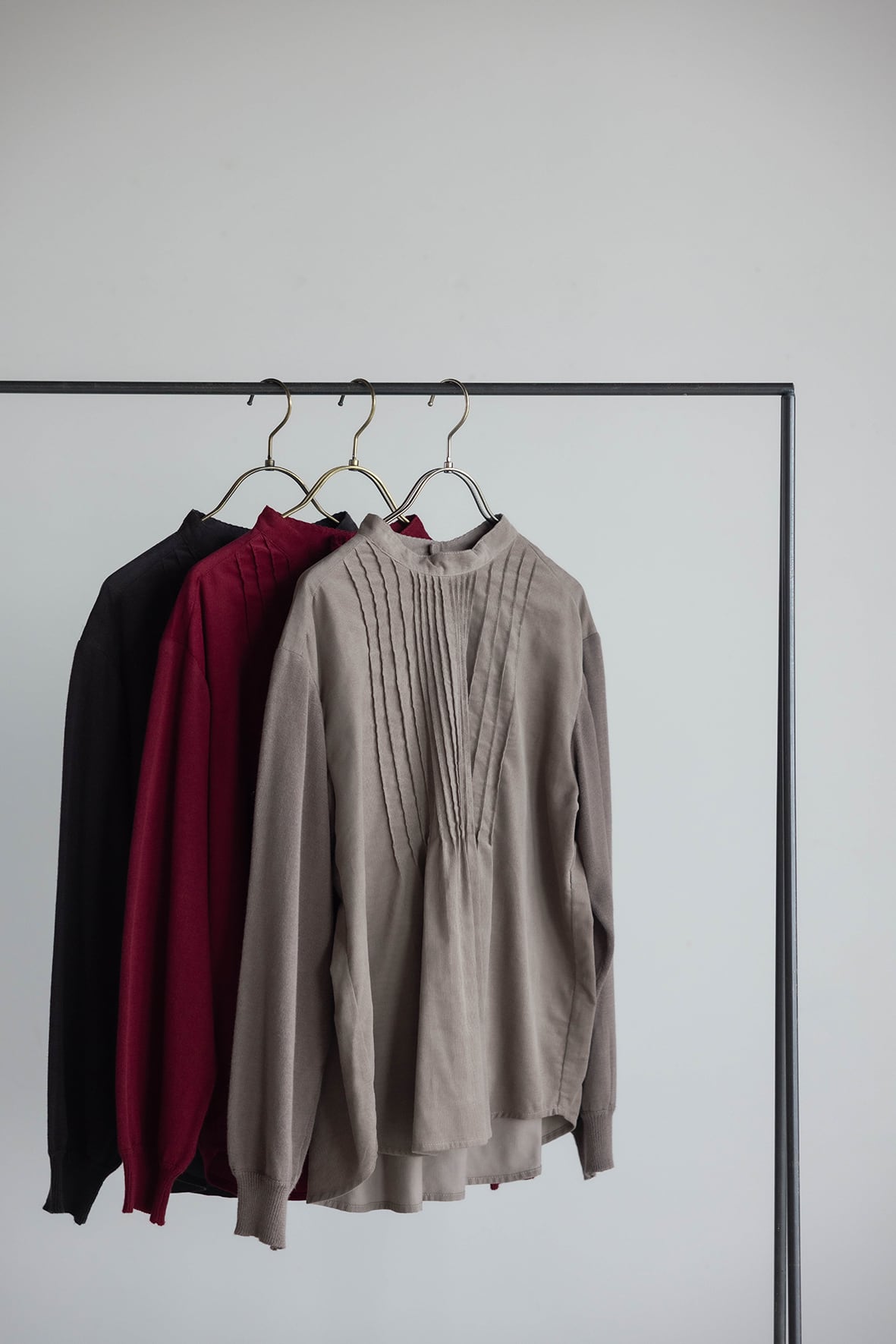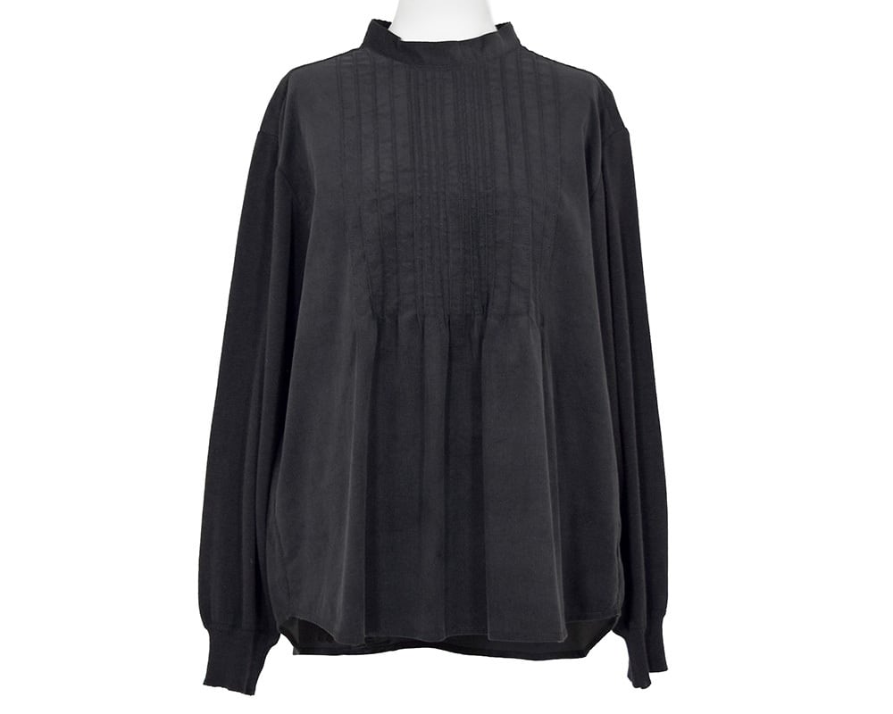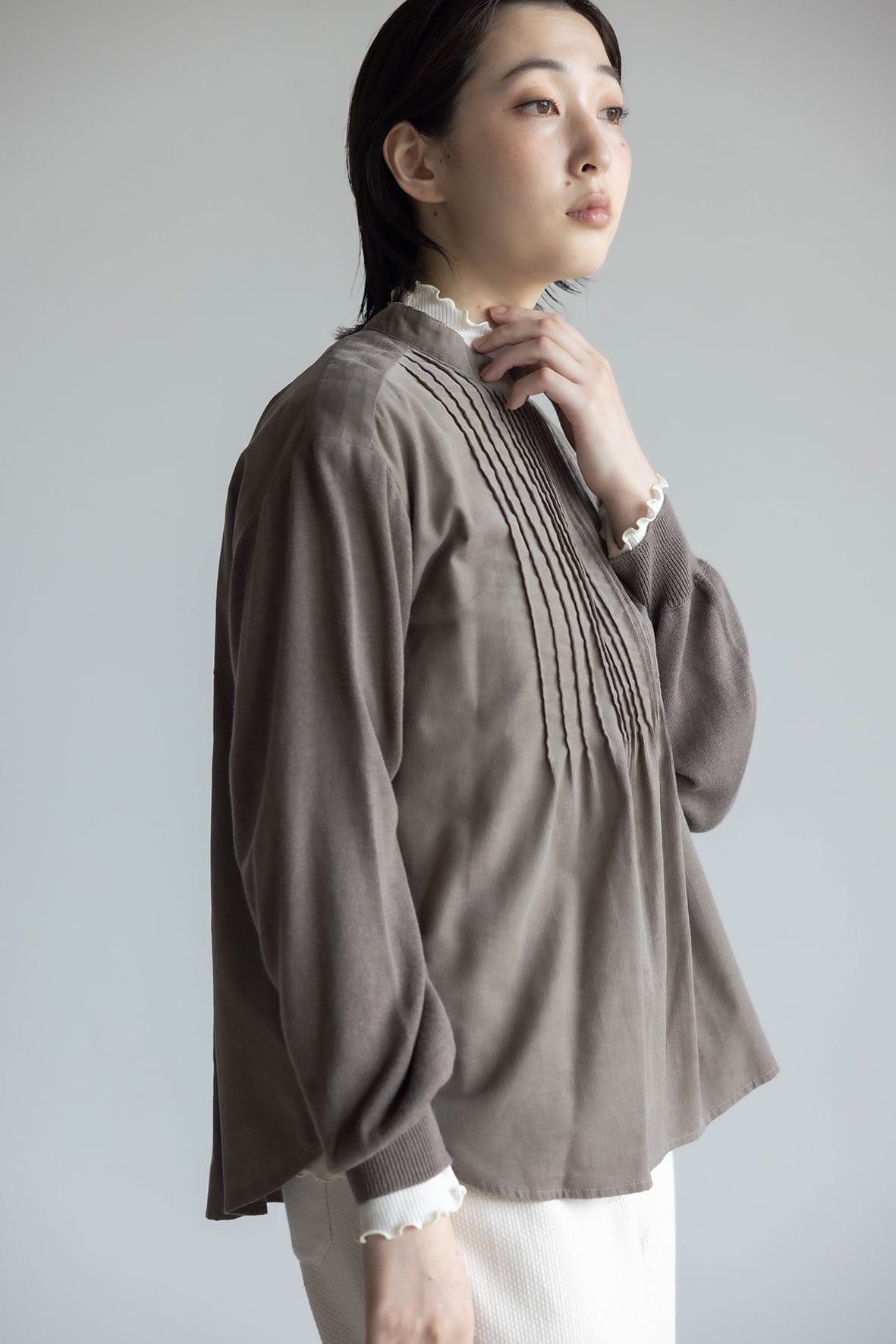 フロントにタックを施した、プルオーバーブラウスです。身頃に細畝コーデュロイ、袖にニットを使用し、きちんと見えするブラウスと着心地の良いニットの良いとこどりの一枚です。柔らかいニット素材の袖は、たくし上げもしやすいデザインです。