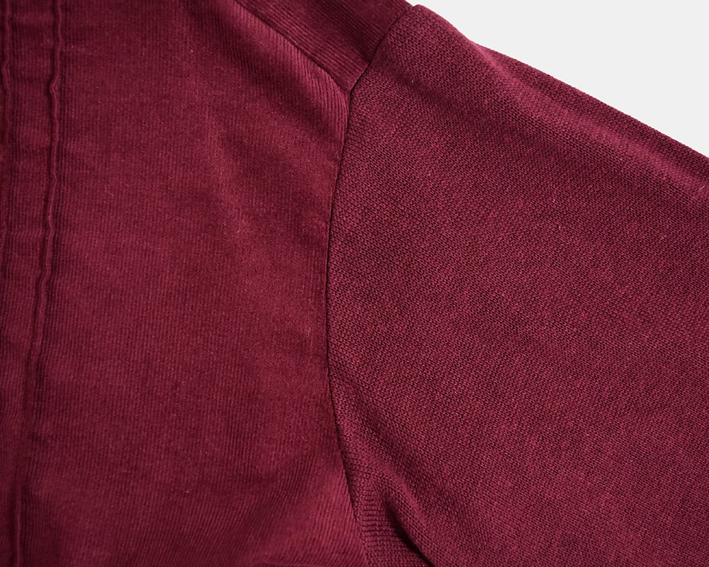 身頃の素材には、暖かさを兼ね備えつつ、ごわつかずソフトでちょうどよい薄さのコットンコーデュロイを使用しています。袖部分は綿レーヨンの柔らかな天竺編みニット素材です。