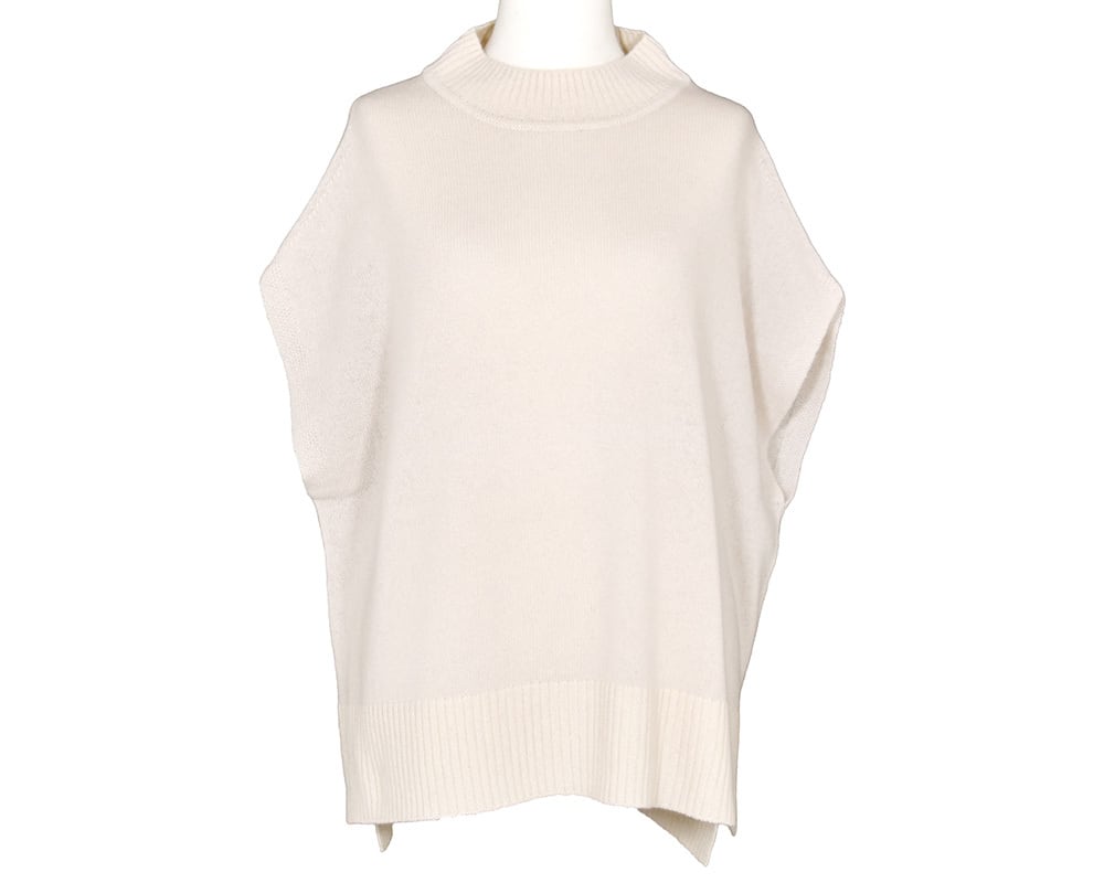 ドロップショルダーでラフに着こなせるニットベスト。低めのハイネックと前後差のある着丈、スリット入りのデザインがポイントです。チュニック丈のシャツや接結素材とのレイヤードスタイルにおすすめの一枚です。