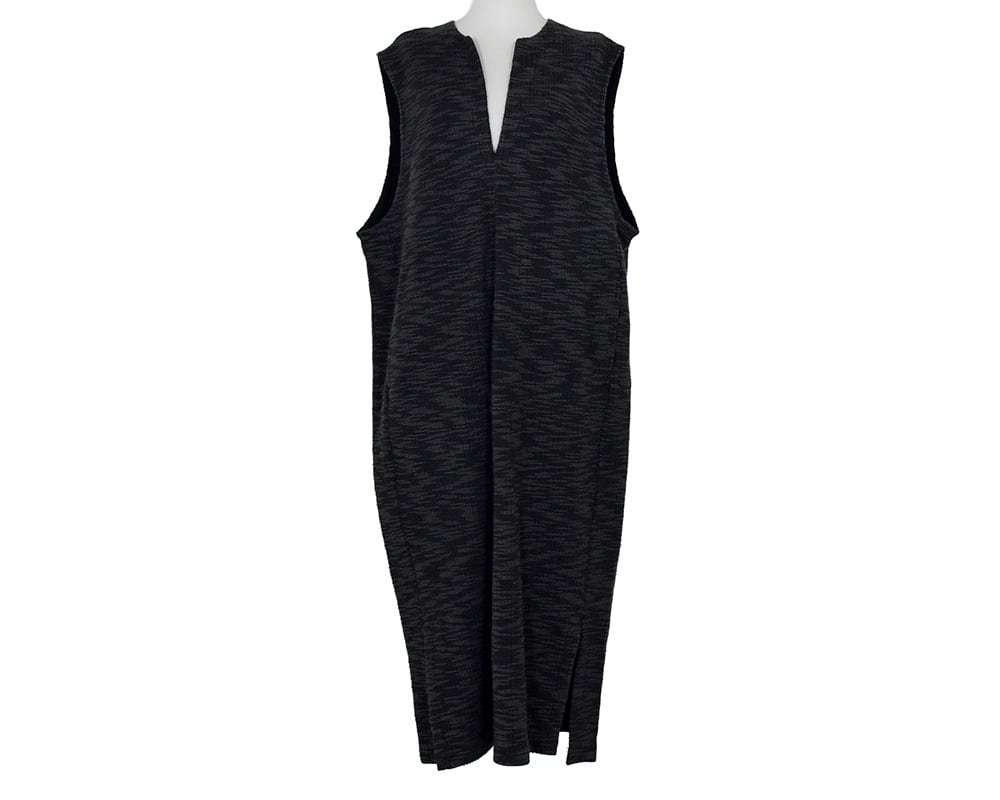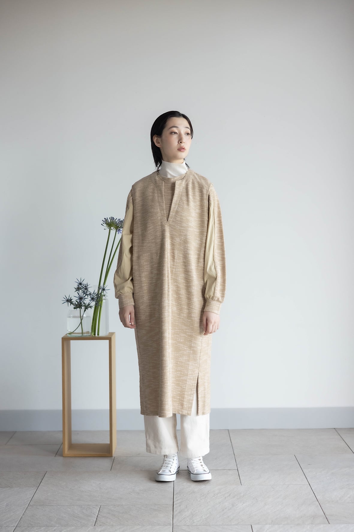 膝下丈とVネックラインがクラシカルな印象を与えるワンピースです。ブラウスやニットなど、合わせるインナーによってさまざまな表情のレイヤードが楽しめ、スタイリングの主役として活躍するアイテムです。両サイドスリット入り。両脇にポケットあり。