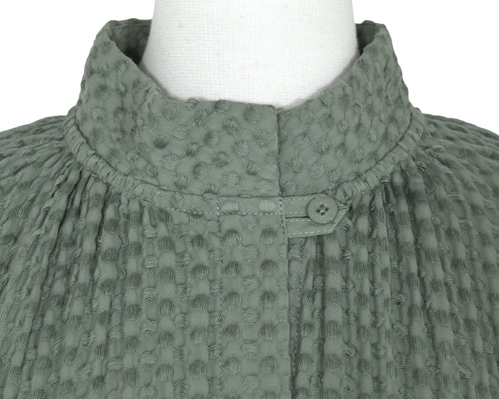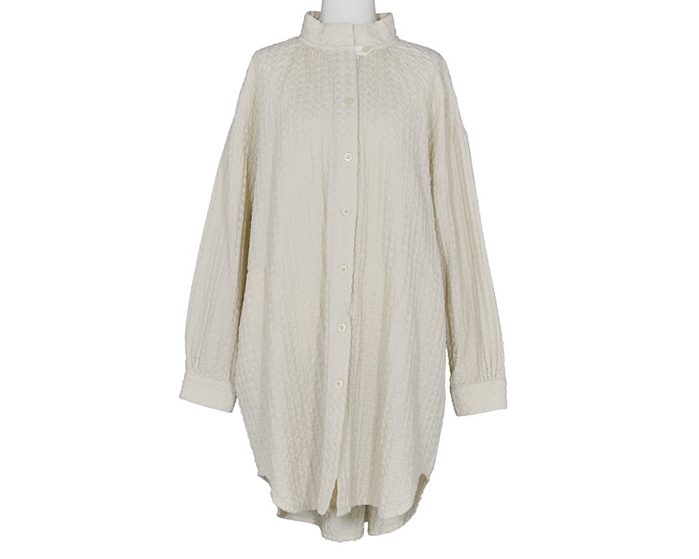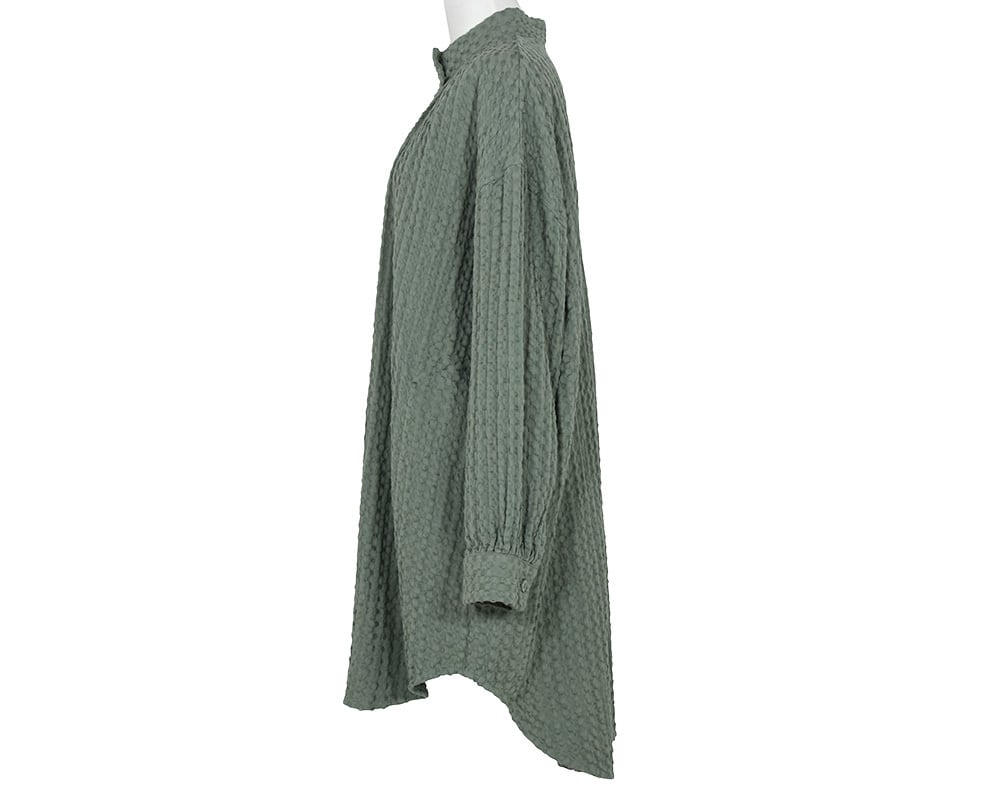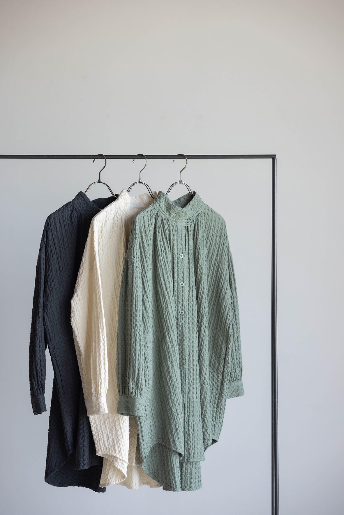 ややAラインに広がるシルエットのロングシャツです。衿元と袖口はギャザー仕様で、女性らしさのあるデザインです。チュニック丈ですが軽い素材なので、秋から冬にかけての時期に、シャツコートのように軽く羽織れる1枚です。両脇シームポケット付き。