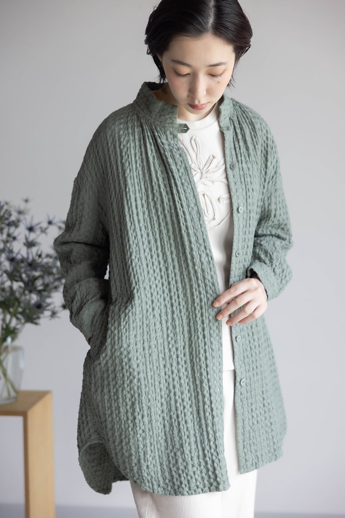 表面に凹凸のある、ジャカード織りのコットン素材です。凹凸による膨らみがあり、ある程度の厚みがありながらも、軽くて柔らかい風合いです。