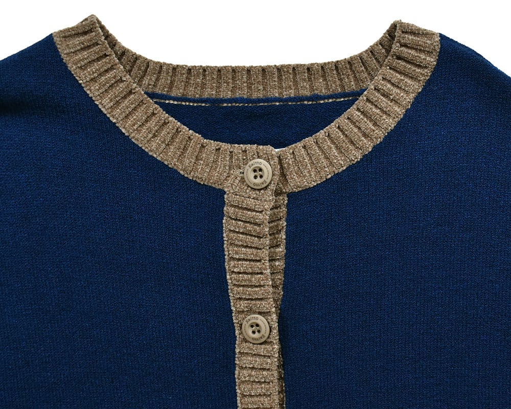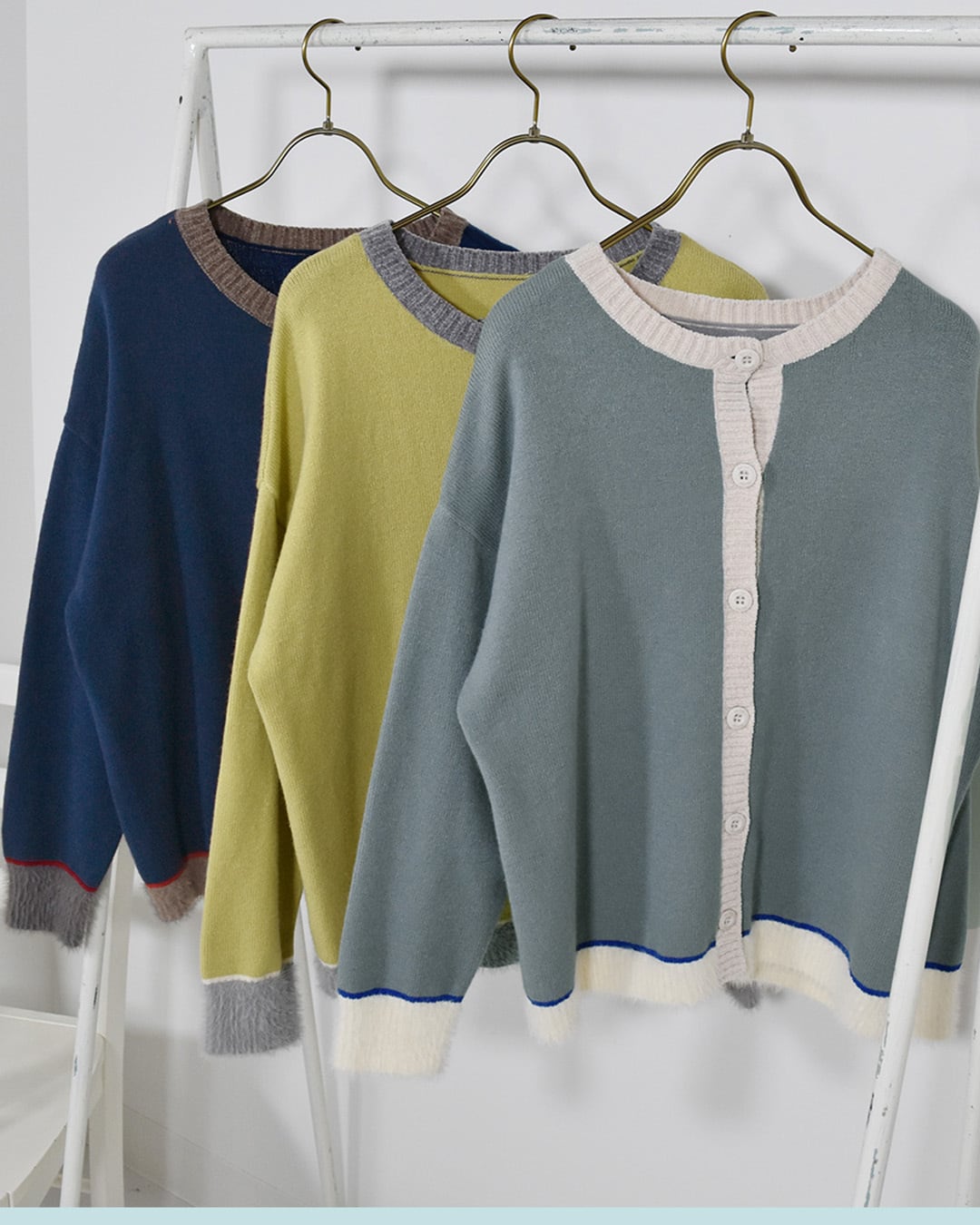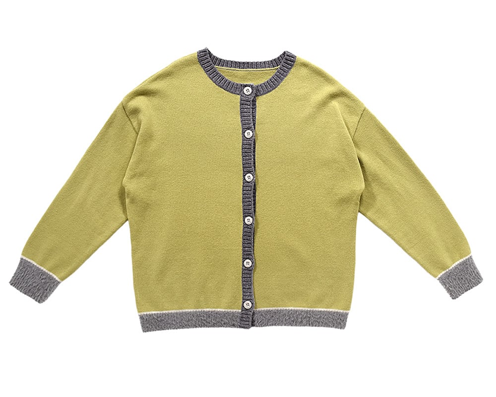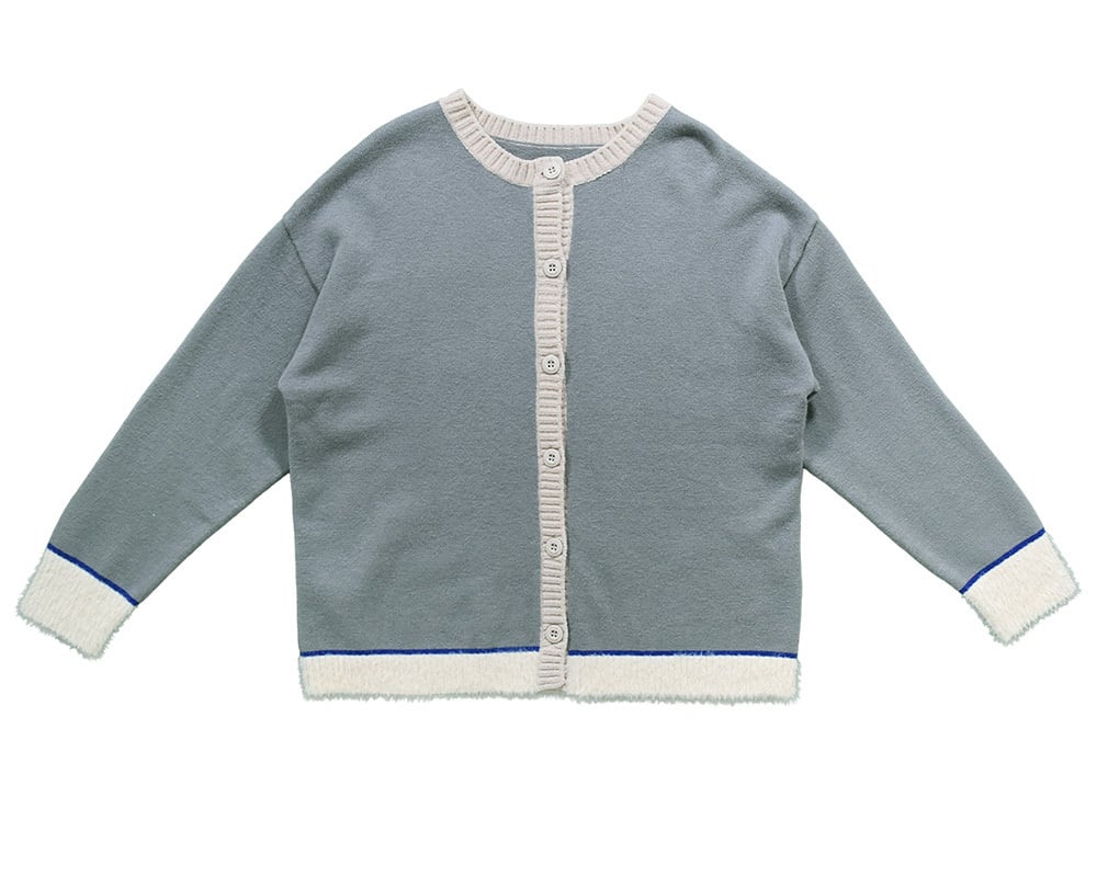 袖口と裾に入れたアクセントカラーのラインや、素材切り替えがポイントのカーディガンです。