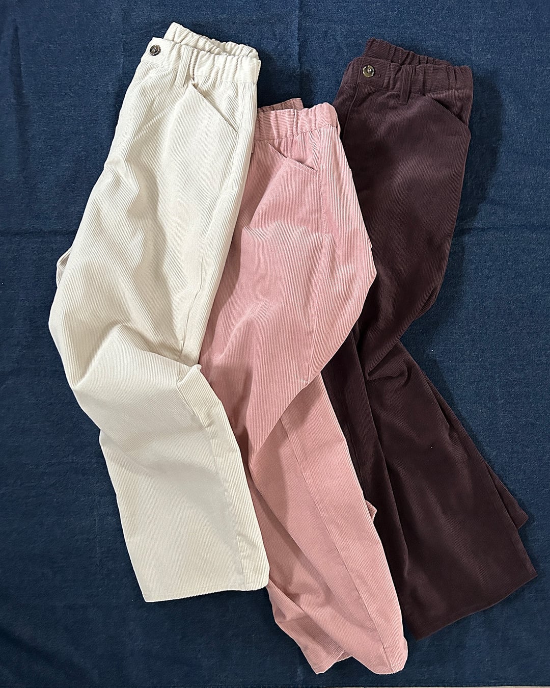 冬のコーデに欠かせない、あたたかみのあるコーデュロイ素材を使用したストレートパンツ。太すぎないスッキリとしたシルエットで、体のラインを拾いにくく、リラックス感のある穿き心地が魅力です。ウエストはゴム仕様で動きやすく、トップスを選ばず合わせやすい一本。カジュアルにもきれいめにも着回せる、デイリーに活躍するアイテムです。