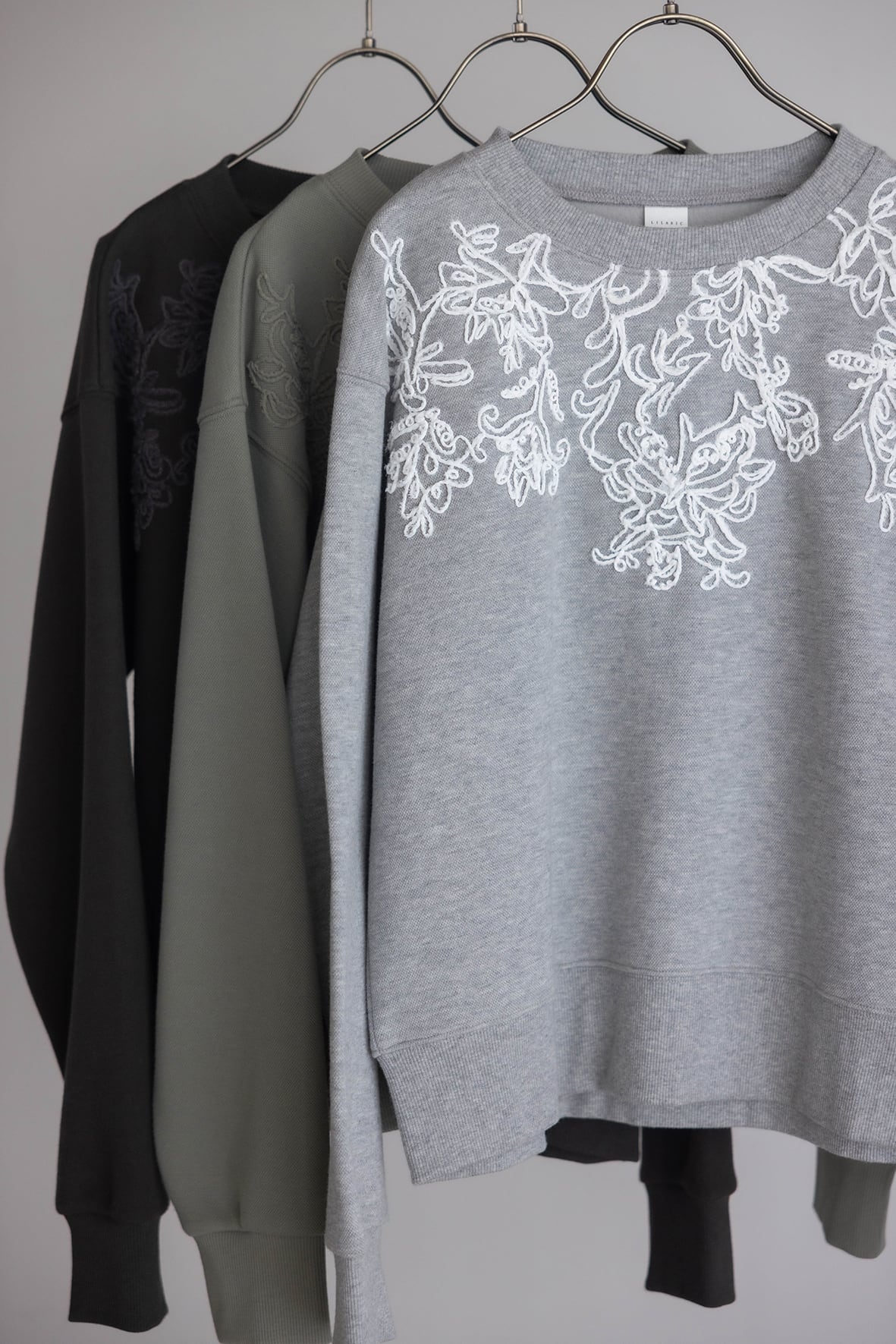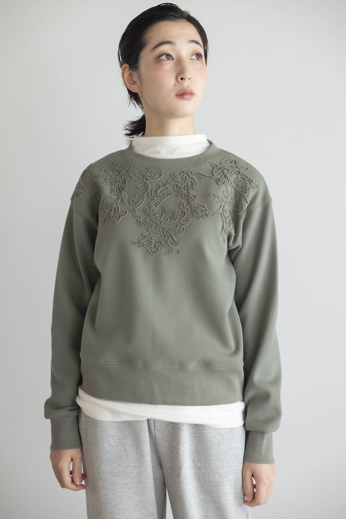 ヨーク部分にあしらった刺繍が印象的なプルオーバーです。柔らかな生地テープに、ダイヤモンドリリーの花をテープ刺繍で丁寧に表現しています。デニムからスカートまで幅広いボトムスともコーディネートしやすく、さりげない華やかさを添えてくれる一枚です。
