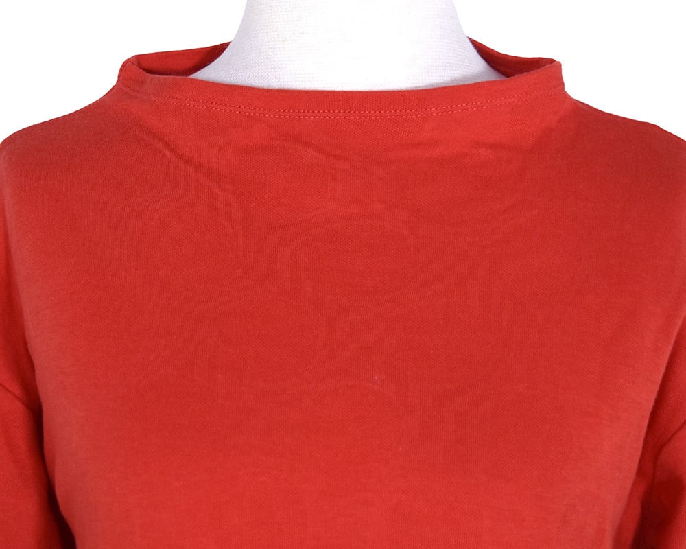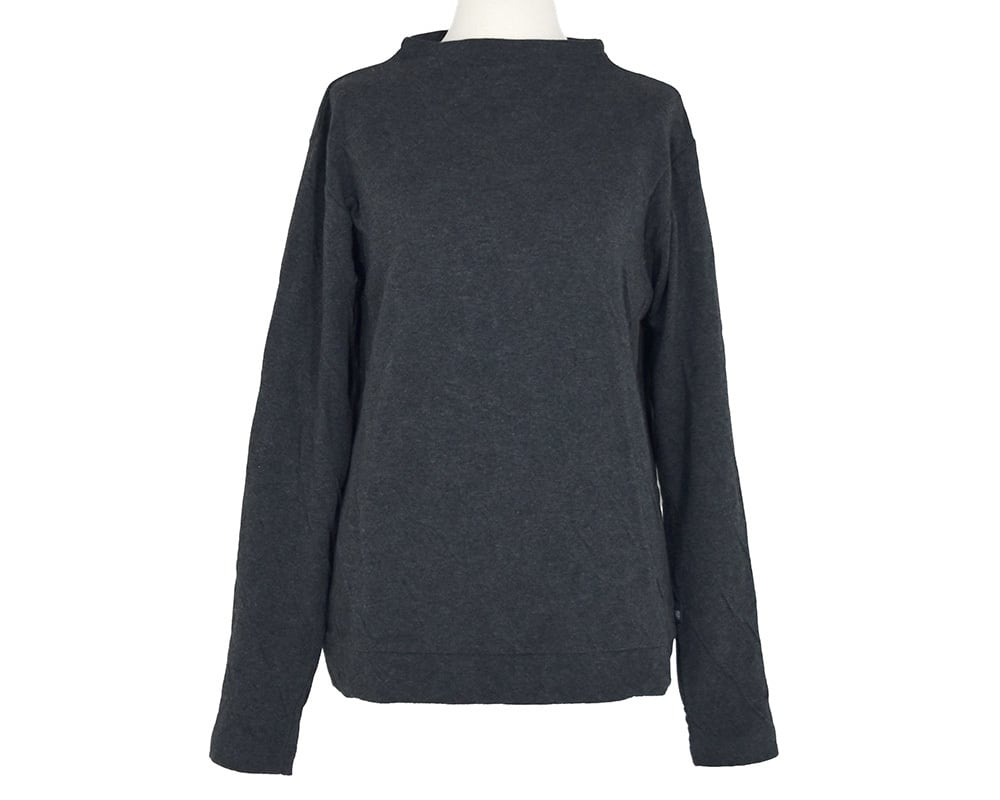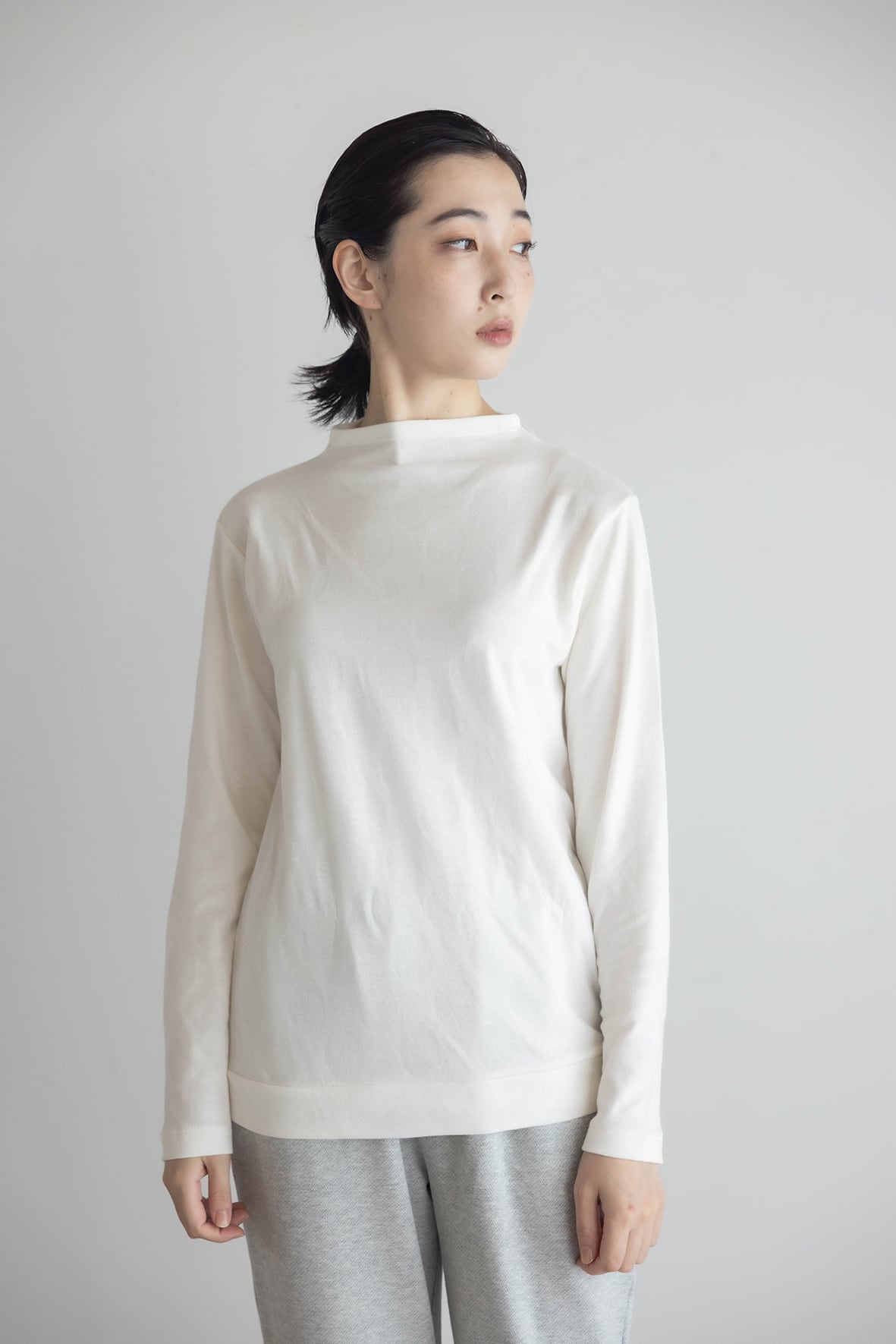 首元に程よい高さを持たせたボトルネックデザインが、顔まわりに上品なニュアンスを添えるプルオーバーです。身体のラインを拾いにくいゆとりのあるシルエットで、ニットやベストのインナーとしても活躍します。重ね着しやすく、冬のスタイリングに欠かせない一枚です。