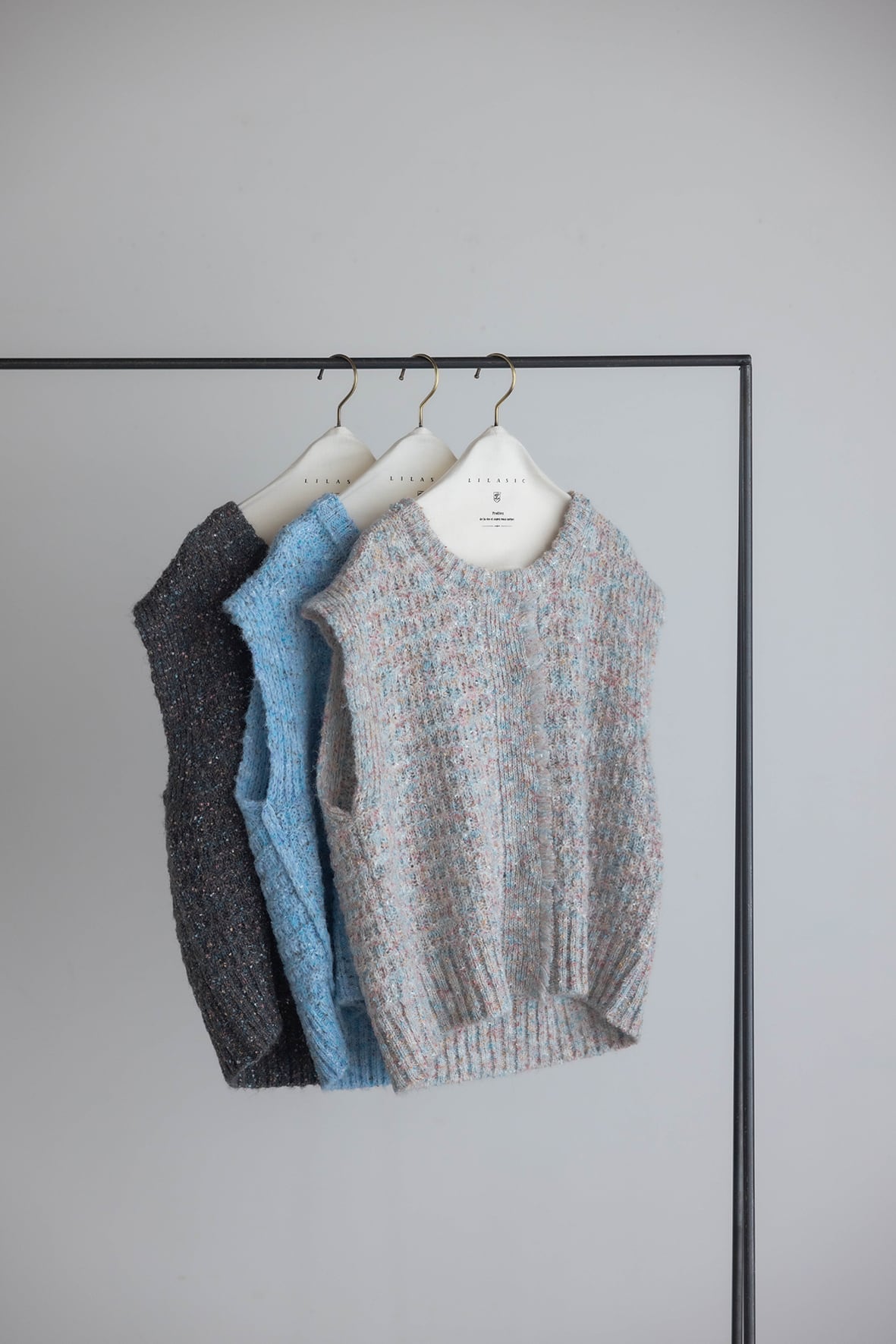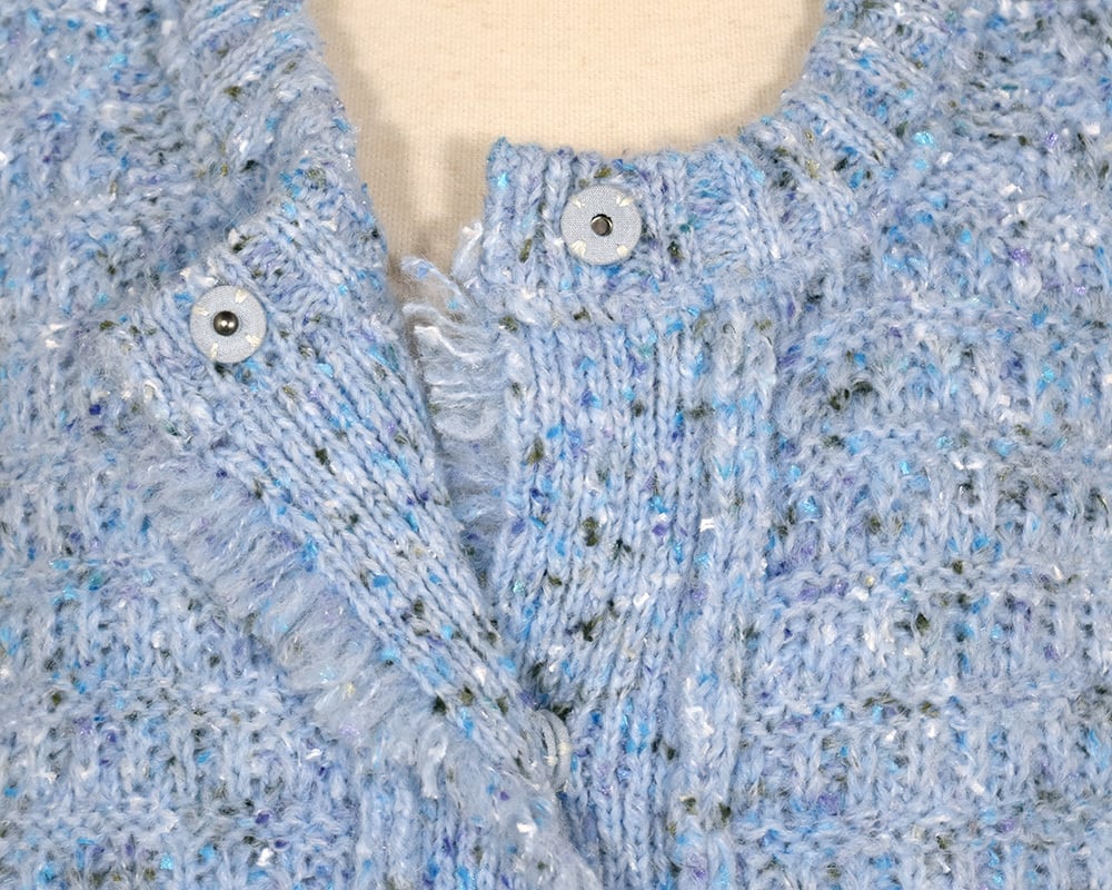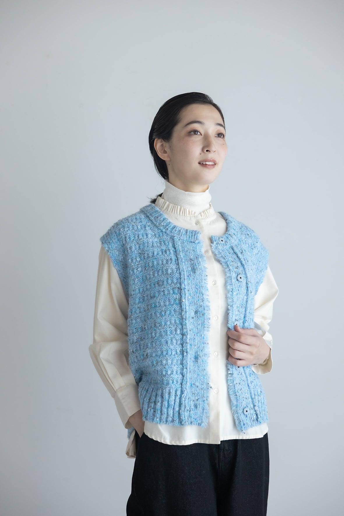スッキリしたクルーネックとスナップボタンのフロントデザインが特徴のニットベストです。アームホールにゆとりを持たせており、ブラウスや接結インナーとのレイヤードも楽しめます。ジレ感覚で羽織れる万能アイテムです。表情のある編地が、スタイリングのアクセントになります。