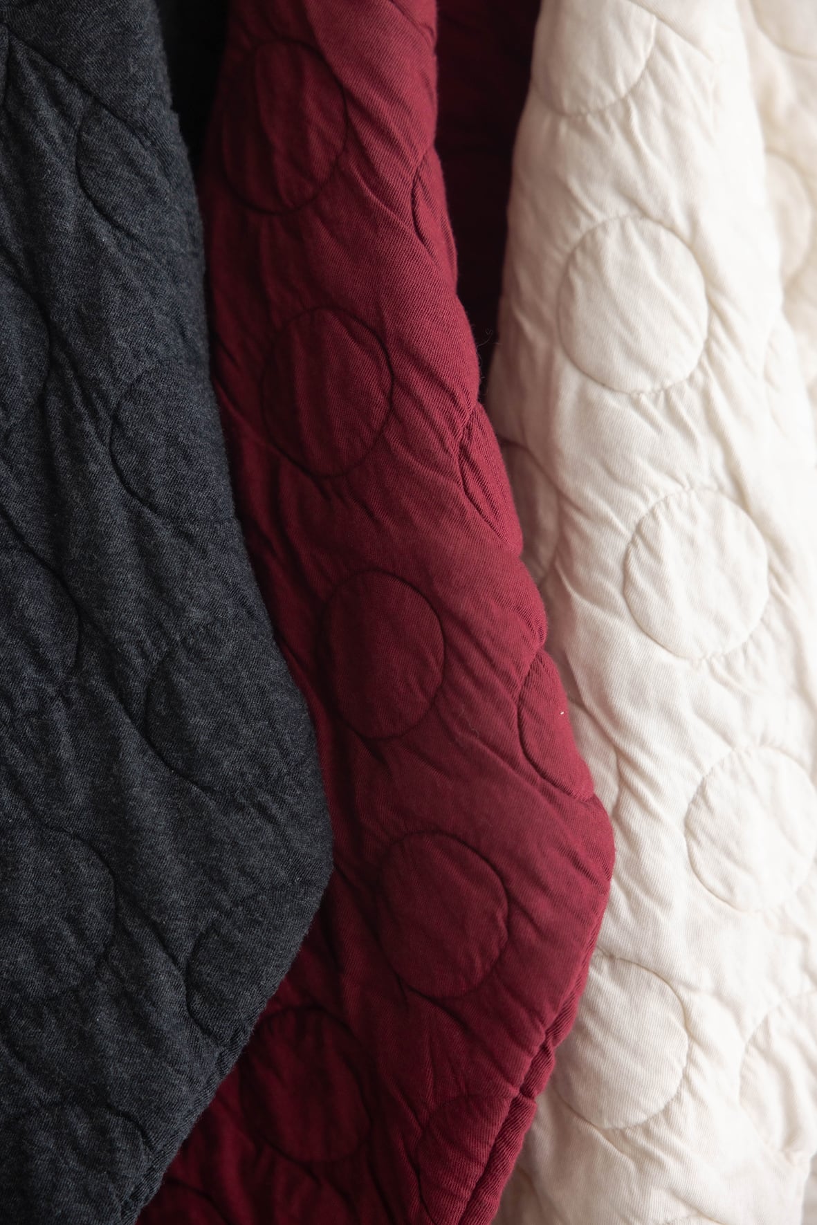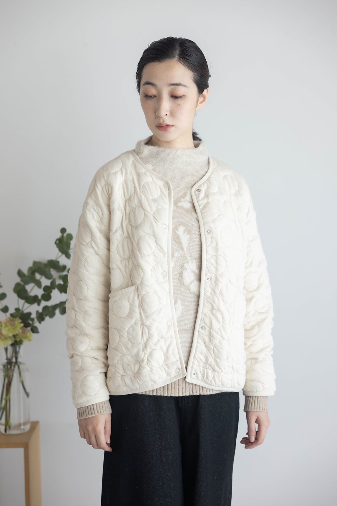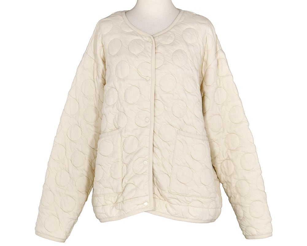 ドット柄が浮き出るように編み立てた、ふくれニットジャカード素材です。薄いワタを入れることで、生地に膨らみを出した、柔らかい着心地の暖かい素材です。