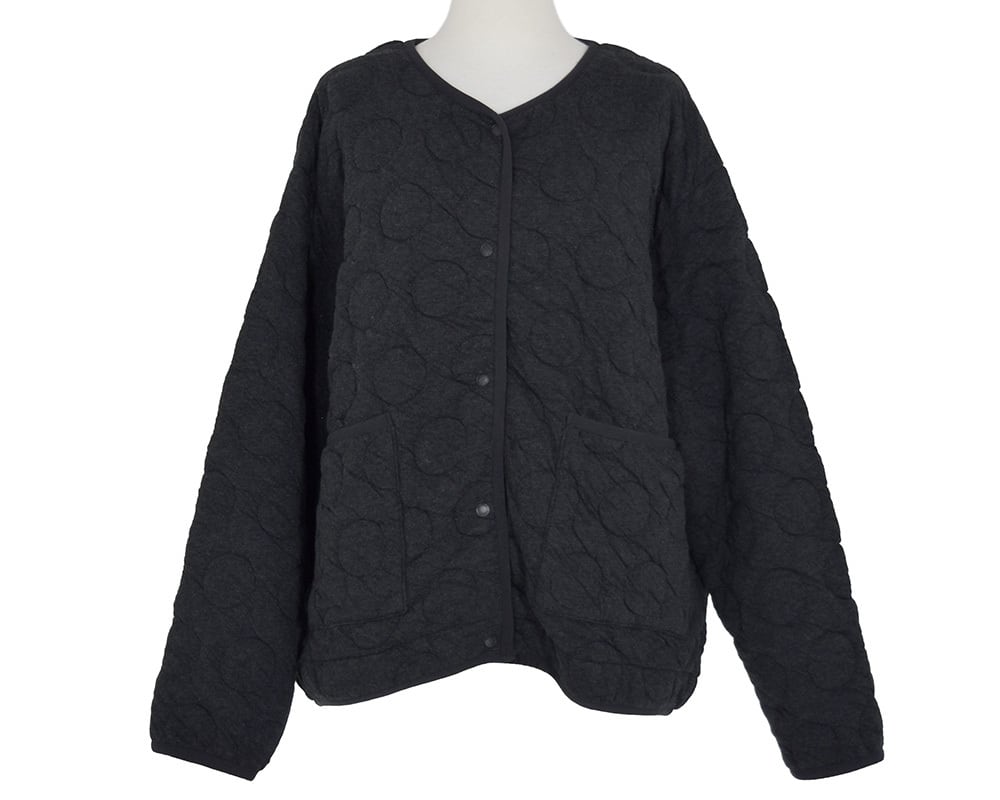ブルゾンのような中間アウターの感覚で着用できるカーディガンです。パイピングがアクセントになったデザインで、すっきりとした襟ぐりは、タートルネックのプルオーバーを重ねるなどのレイヤードも楽しみやすいデザインです。フロントはスナップ釦あき。前身頃にパッチポケットあり。