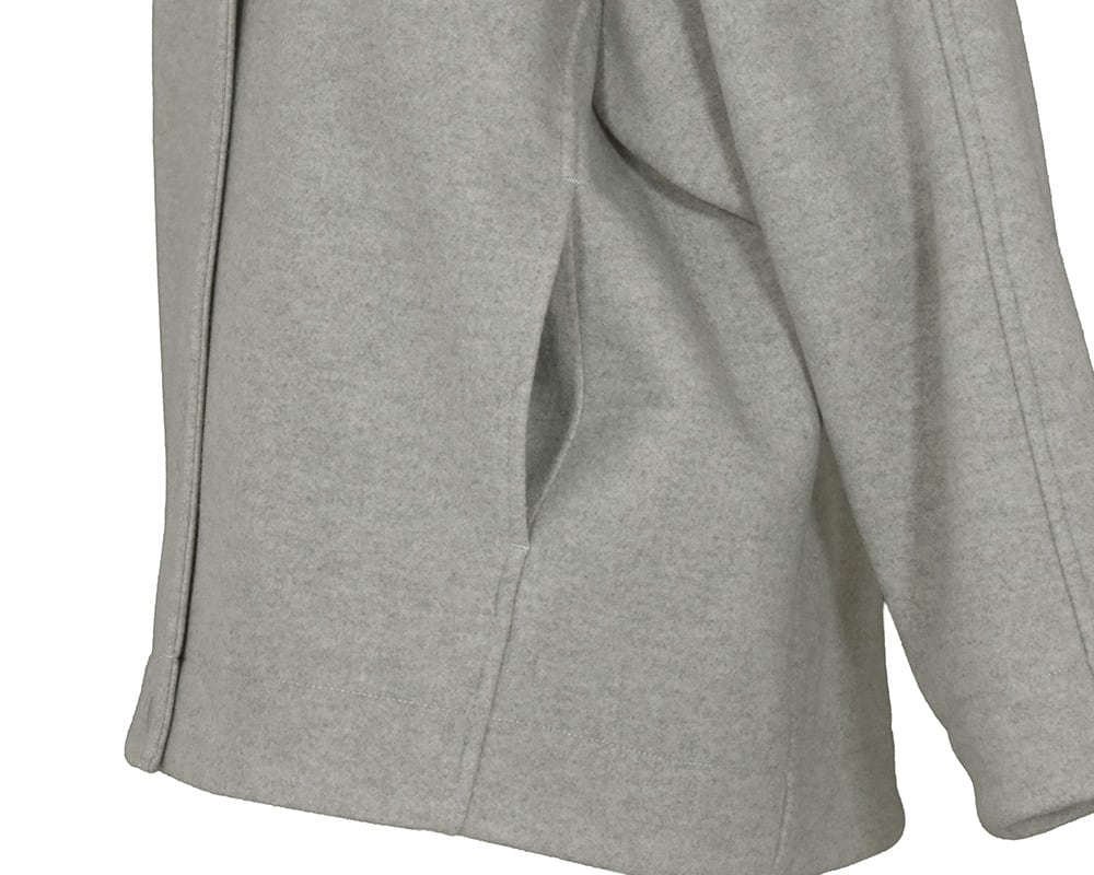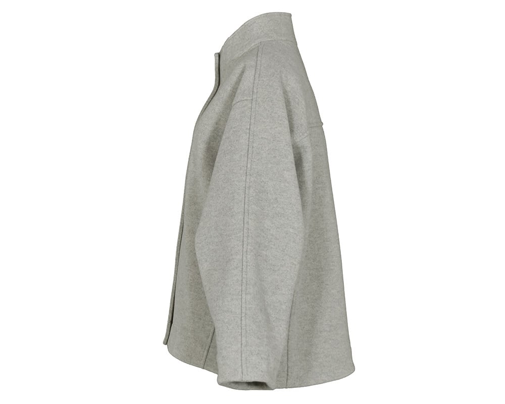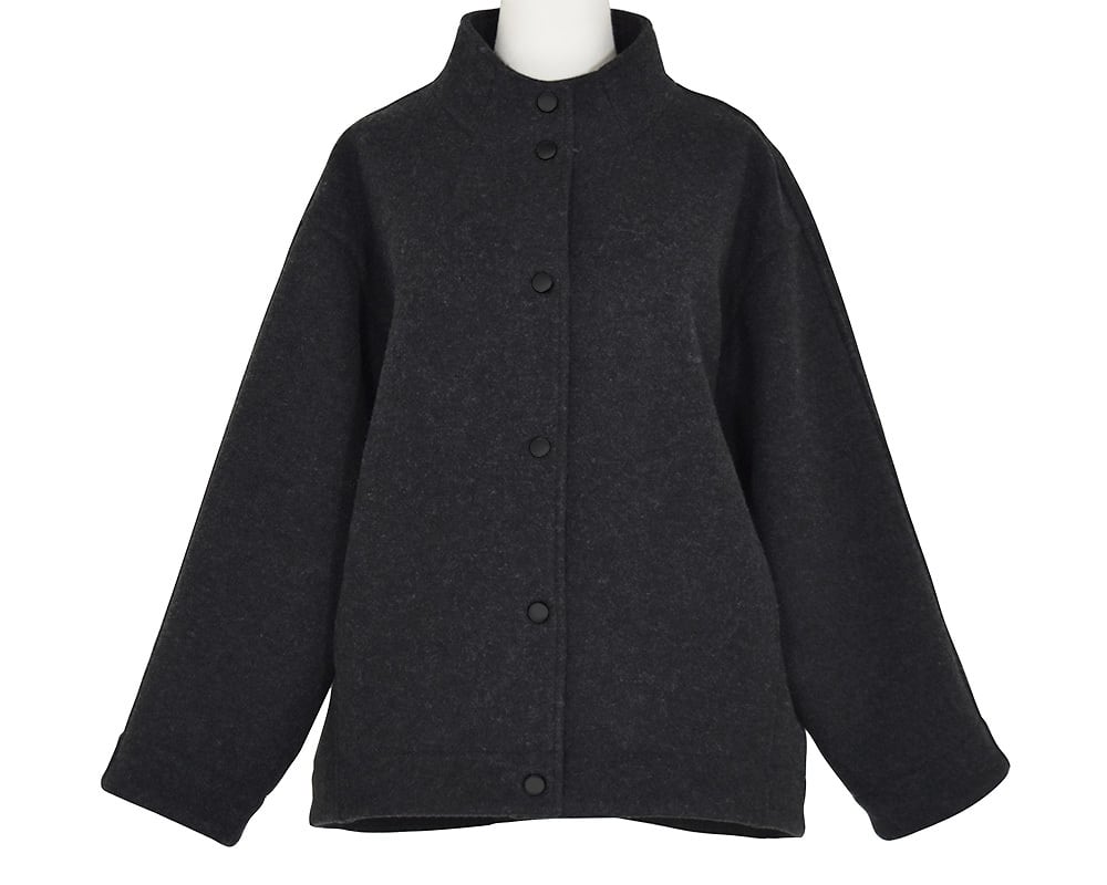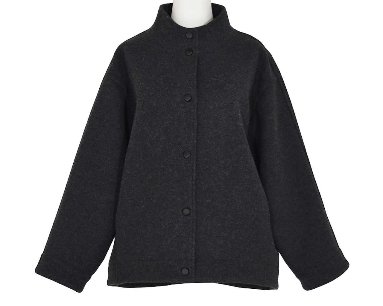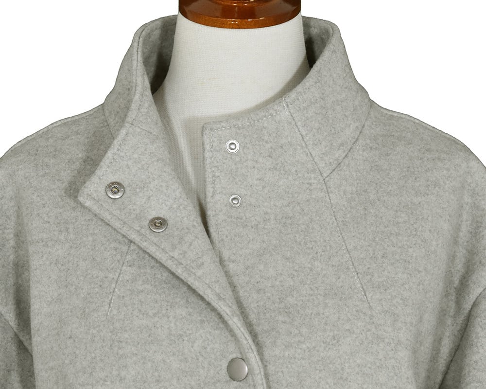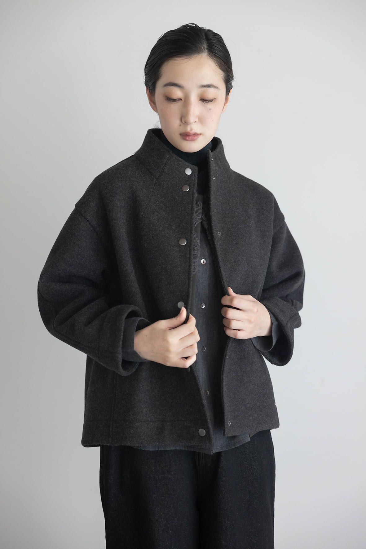 表はメルトンライクで、裏にフリースをボンディングしたショートコートです。ゆったりとしたサイズ感でリラックスして着用でき、ハリのある素材なので型崩れしにくいのが特徴です。スタンドカラーは防寒性があり、衿を開けてもバランスよく見えるパターンに仕上げています。両脇にポケット付き。