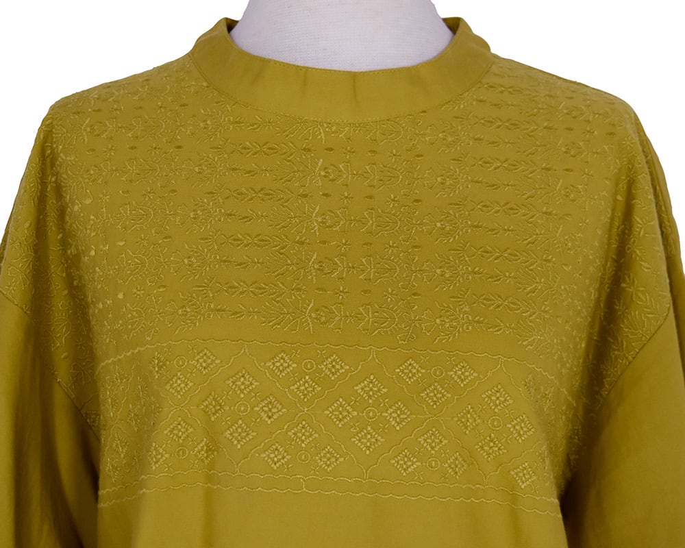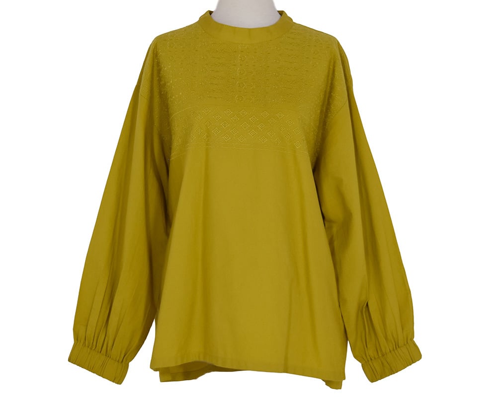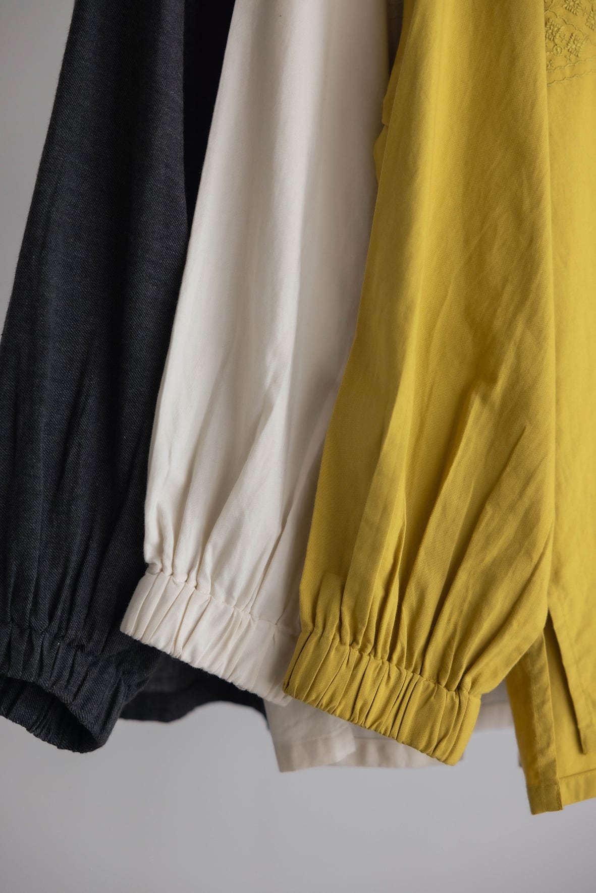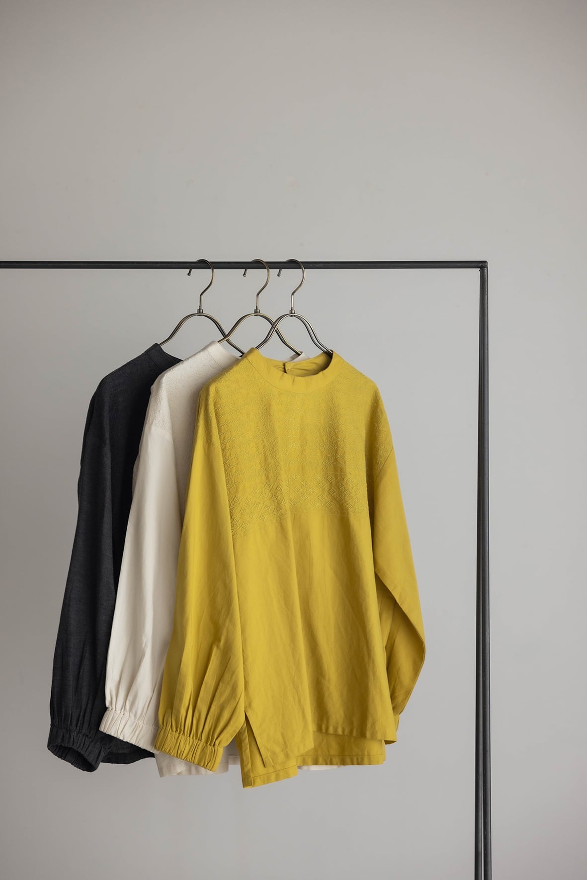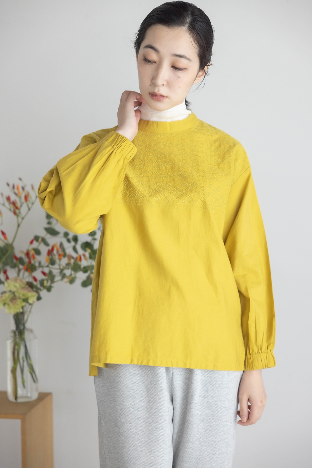 フロントに草花モチーフのバンダナ風刺繍を施したプルオーバーブラウスです。繊細な刺繍が上品で、カーディガンなどを重ねてもフロント刺繍が目をひき、華やかな印象です。袖口はブラウジングができるゴム仕様です。