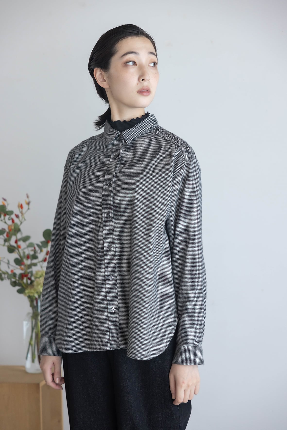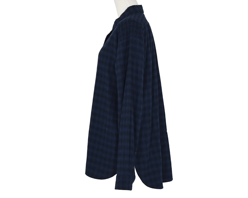 ショルダーヨークにシャーリング加工を施したブラウスです。スタンダードなシルエットのブラウスながら、シャーリングギャザーのデザインで柔らかい雰囲気が加わり女性らしさのある一枚です。