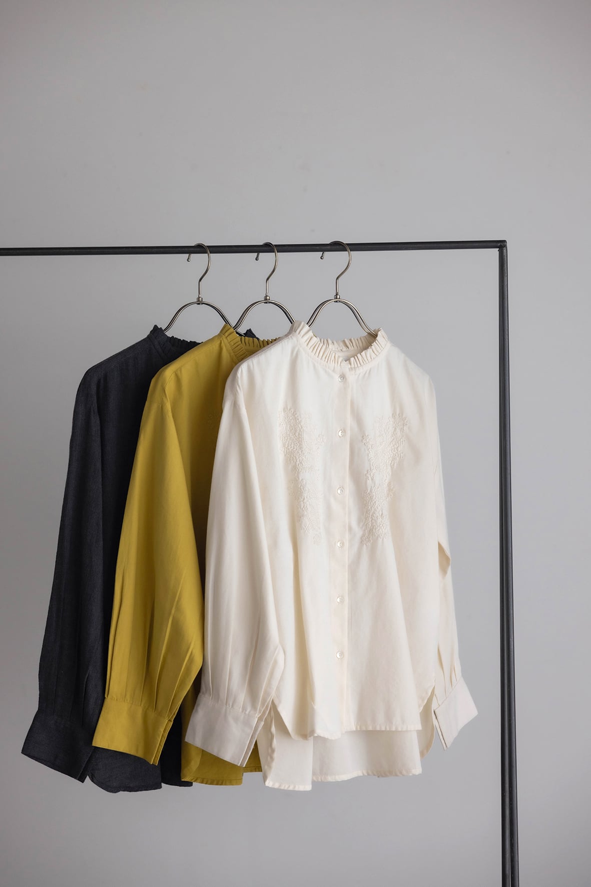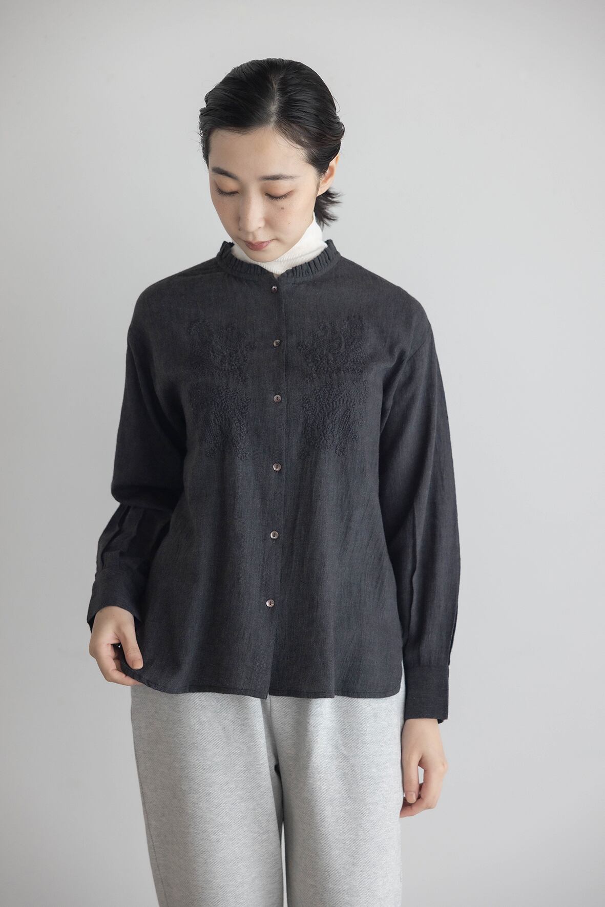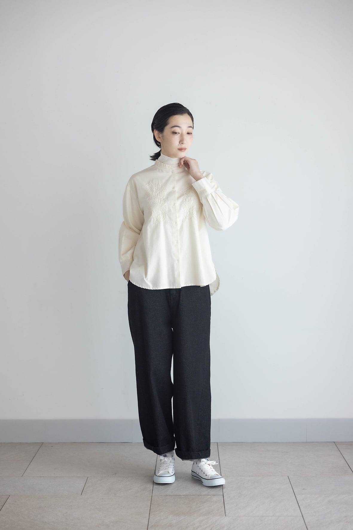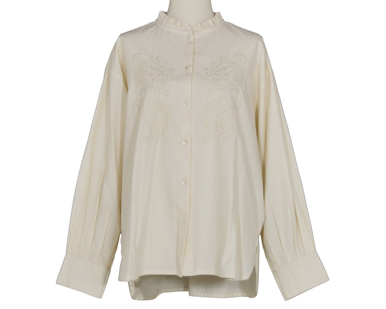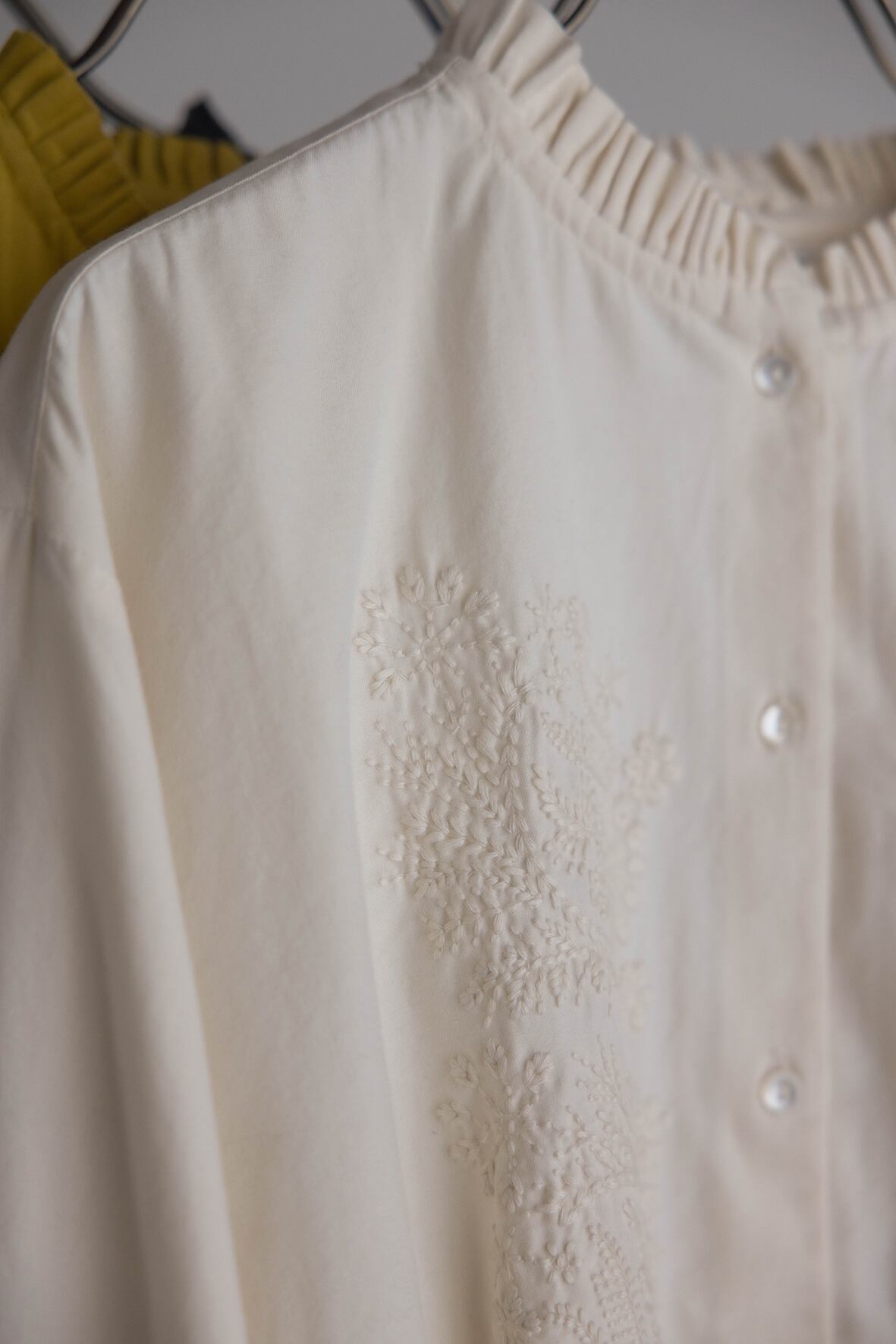 胸元に曲線的な草花をモチーフにした刺繍を施したフリルカラーブラウスです。一枚で着用するのはもちろん、ニットのインに重ねて衿を覗かせたり、羽織りにしたりと汎用性が高く華やかで、コーディネートのアクセントになる一枚です。